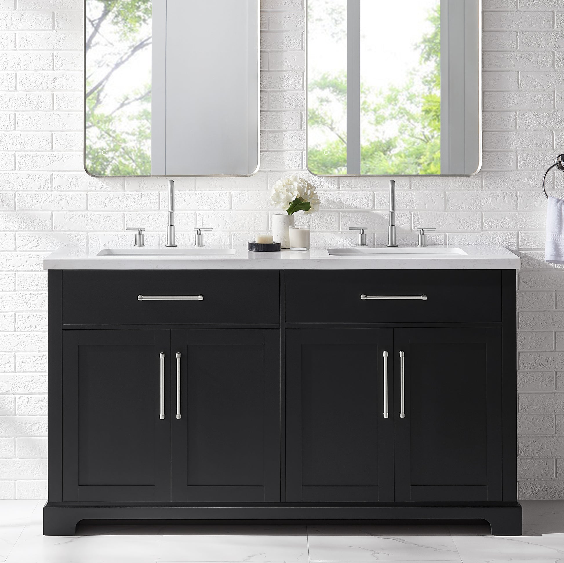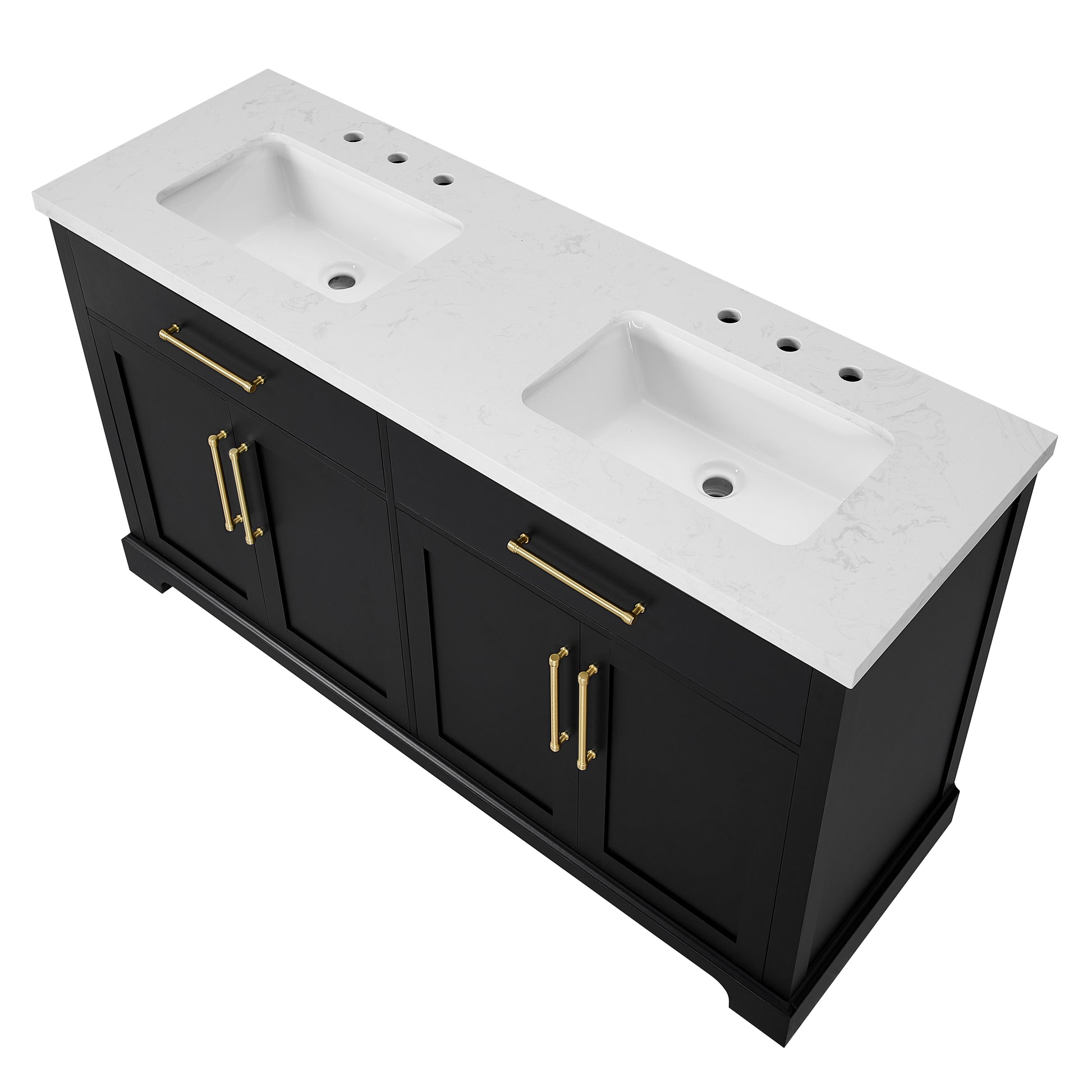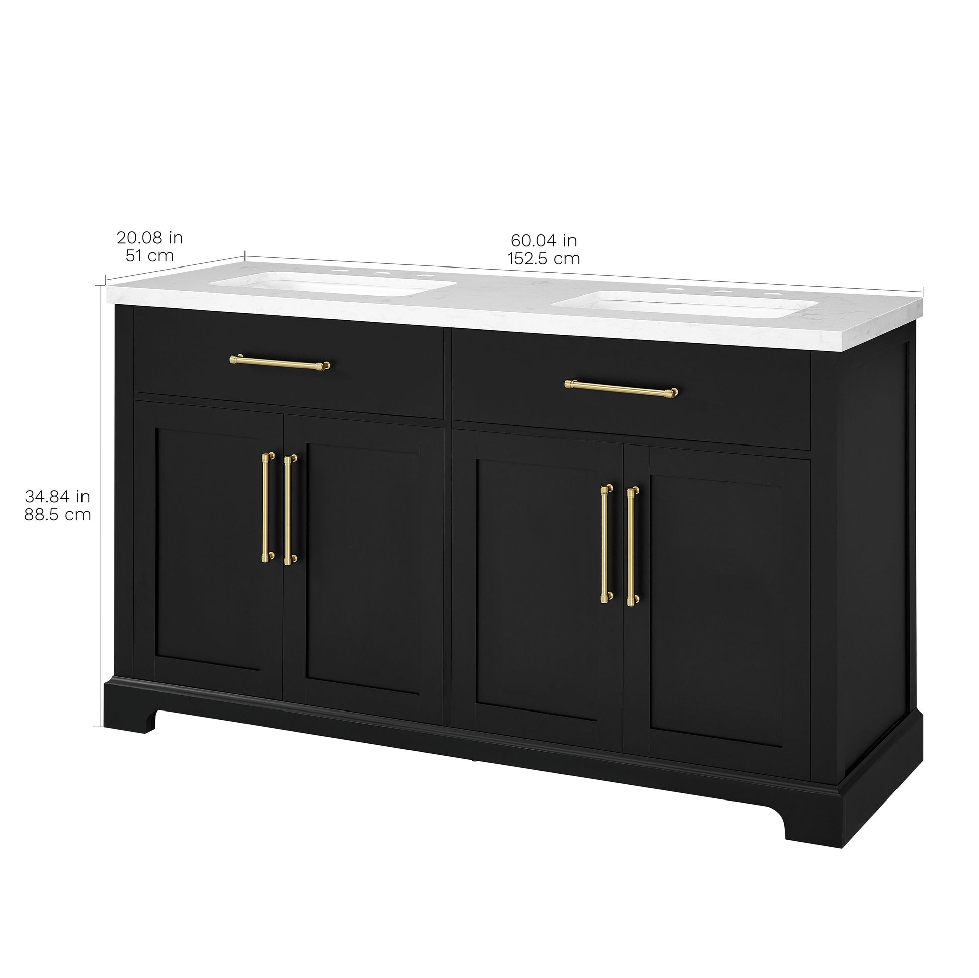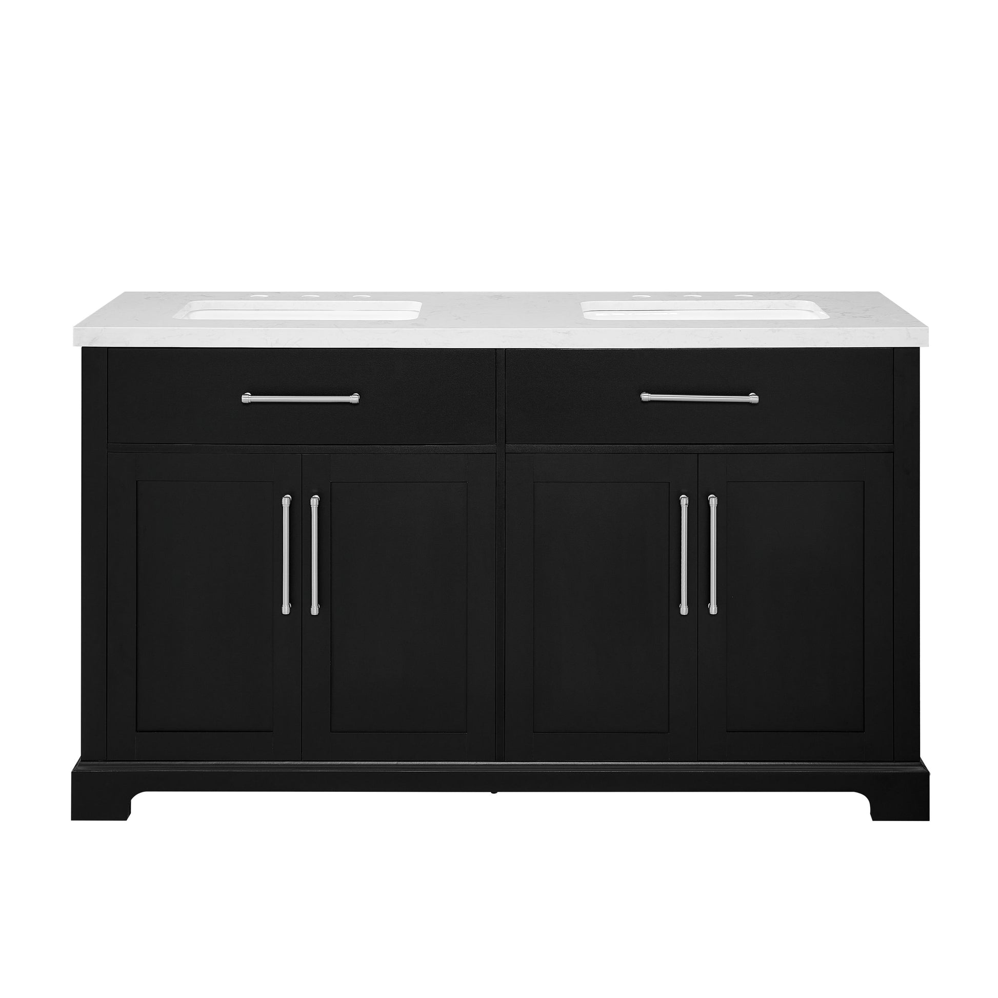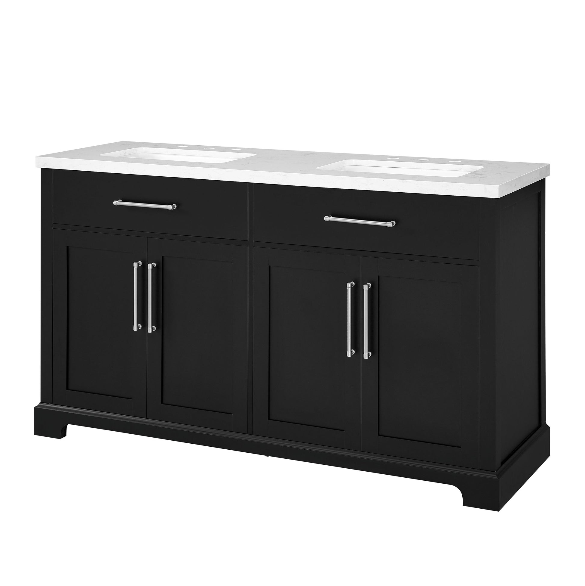 Laissez-vous tenter par l'élégance raffinée de cette collection de meubles-lavabos, un ajout sophistiqué à votre oasis de salle de bain. Avec une finition noire encre, ce meuble-lavabo de 60 pouces dégage un charme intemporel qui s'harmonisera parfaitement avec une variété de styles de décoration. Le dessus en pierre reconstituée blanche légèrement veinée de gris est pré-percé pour deux robinets espacés de 8 pouces (robinets non inclus) et comprend deux lavabos sous plan en porcelaine vitrifiée blanche. Dotée de charnières à fermeture lente, de deux tiroirs supérieurs inclinables et de deux armoires spacieuses à double porte avec étagères réglables, cette pièce entièrement assemblée allie harmonieusement praticité et luxe. Le meuble-lavabo est livré avec deux ensembles de quincaillerie, vous permettant de choisir l'accent qui complète le mieux votre sanctuaire - nickel brossé ou or brossé. Élevez votre routine quotidienne avec cet ensemble de meuble-lavabo, transformant chaque moment en une affaire indulgente.