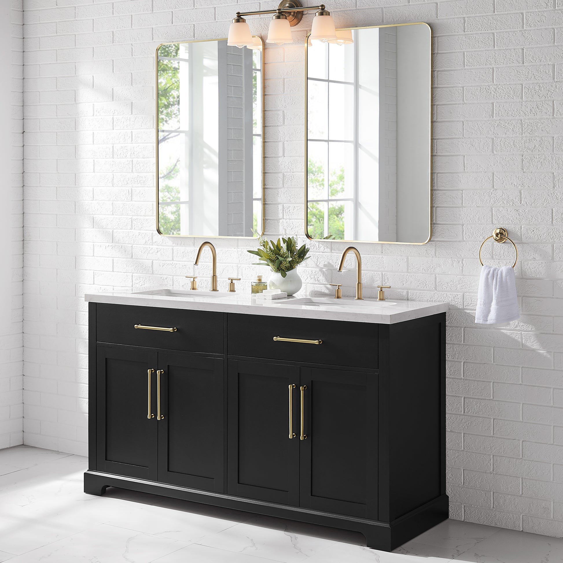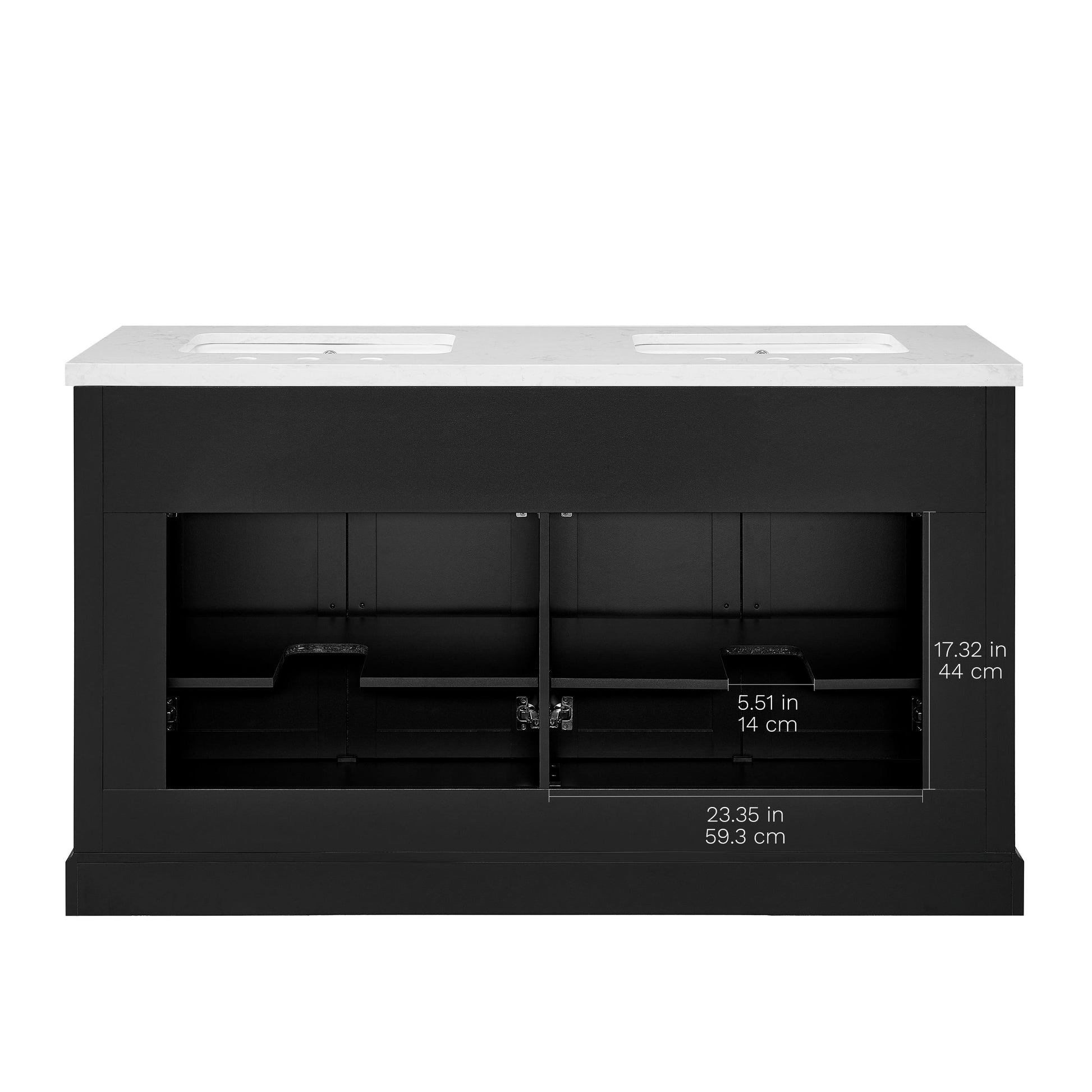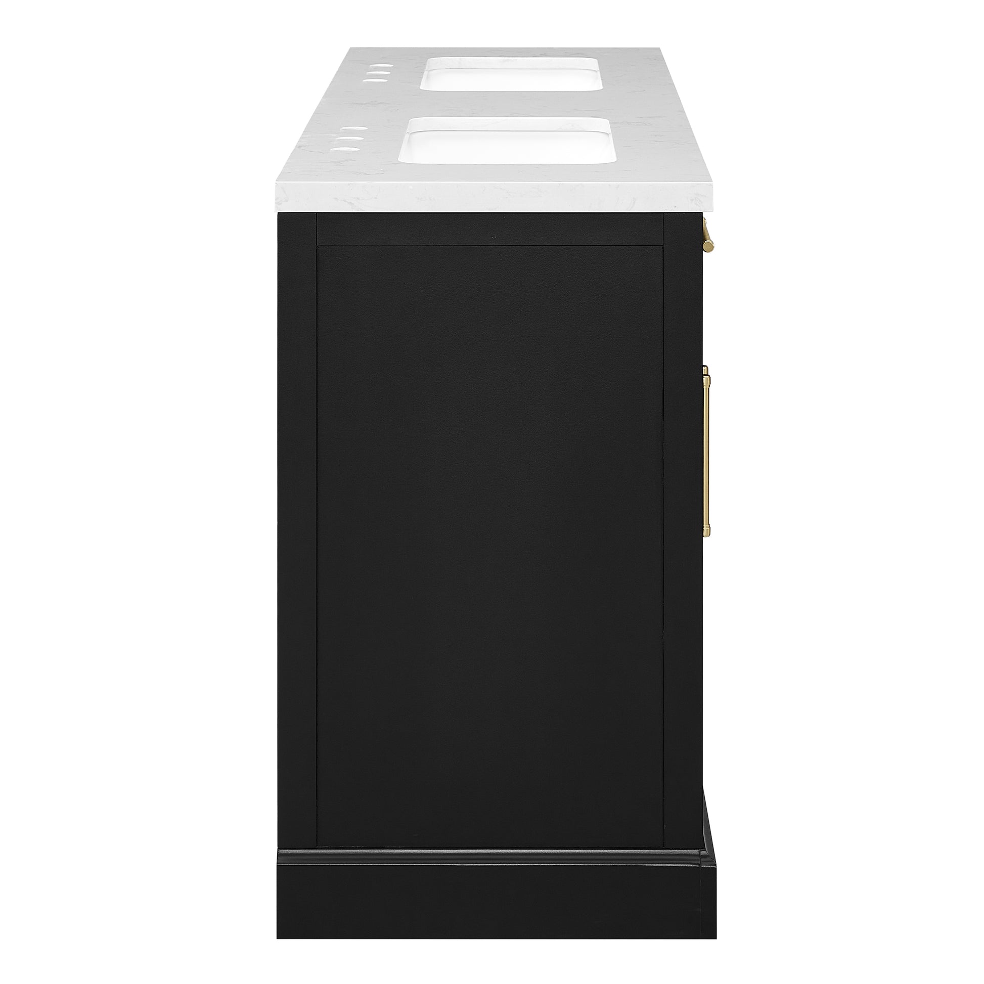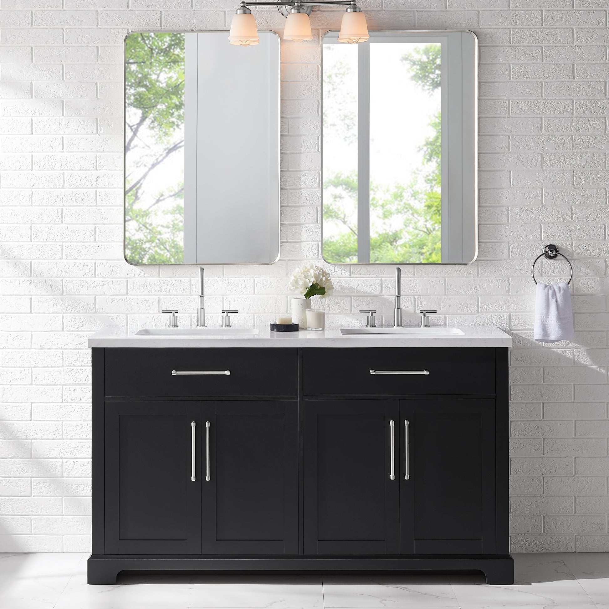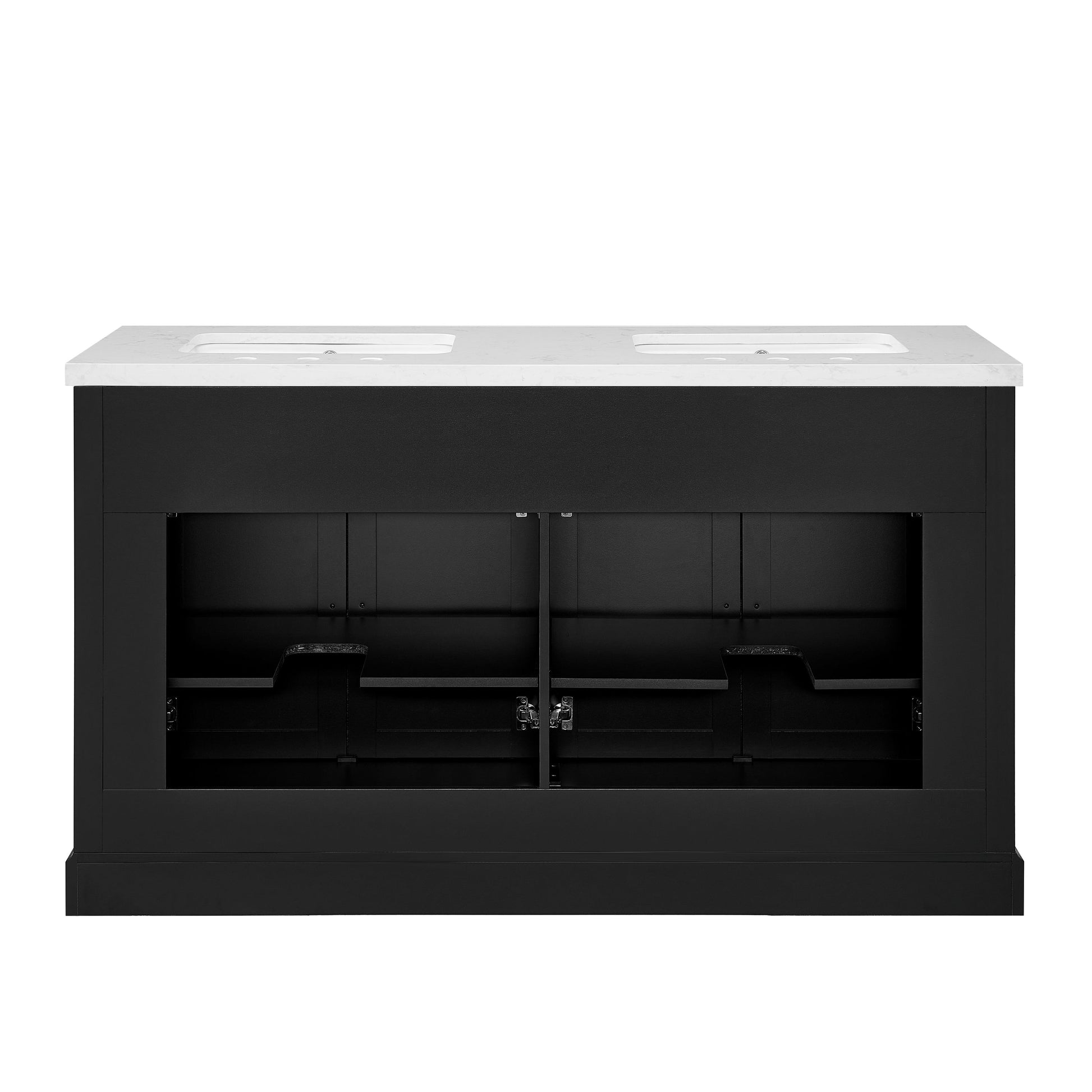 Laissez-vous tenter par l'élégance raffinée de cette collection de meubles-lavabos, un ajout sophistiqué à votre oasis de salle de bain. Avec une finition noire encre, ce meuble-lavabo de 60 pouces dégage un charme intemporel qui s'harmonisera parfaitement avec une variété de styles de décoration. Le dessus en pierre reconstituée blanche légèrement veinée de gris est pré-percé pour deux robinets espacés de 8 pouces (robinets non inclus) et comprend deux lavabos sous plan en porcelaine vitrifiée blanche. Dotée de charnières à fermeture lente, de deux tiroirs supérieurs inclinables et de deux armoires spacieuses à double porte avec étagères réglables, cette pièce entièrement assemblée allie harmonieusement praticité et luxe. Le meuble-lavabo est livré avec deux ensembles de quincaillerie, vous permettant de choisir l'accent qui complète le mieux votre sanctuaire - nickel brossé ou or brossé. Élevez votre routine quotidienne avec cet ensemble de meuble-lavabo, transformant chaque moment en une affaire indulgente.