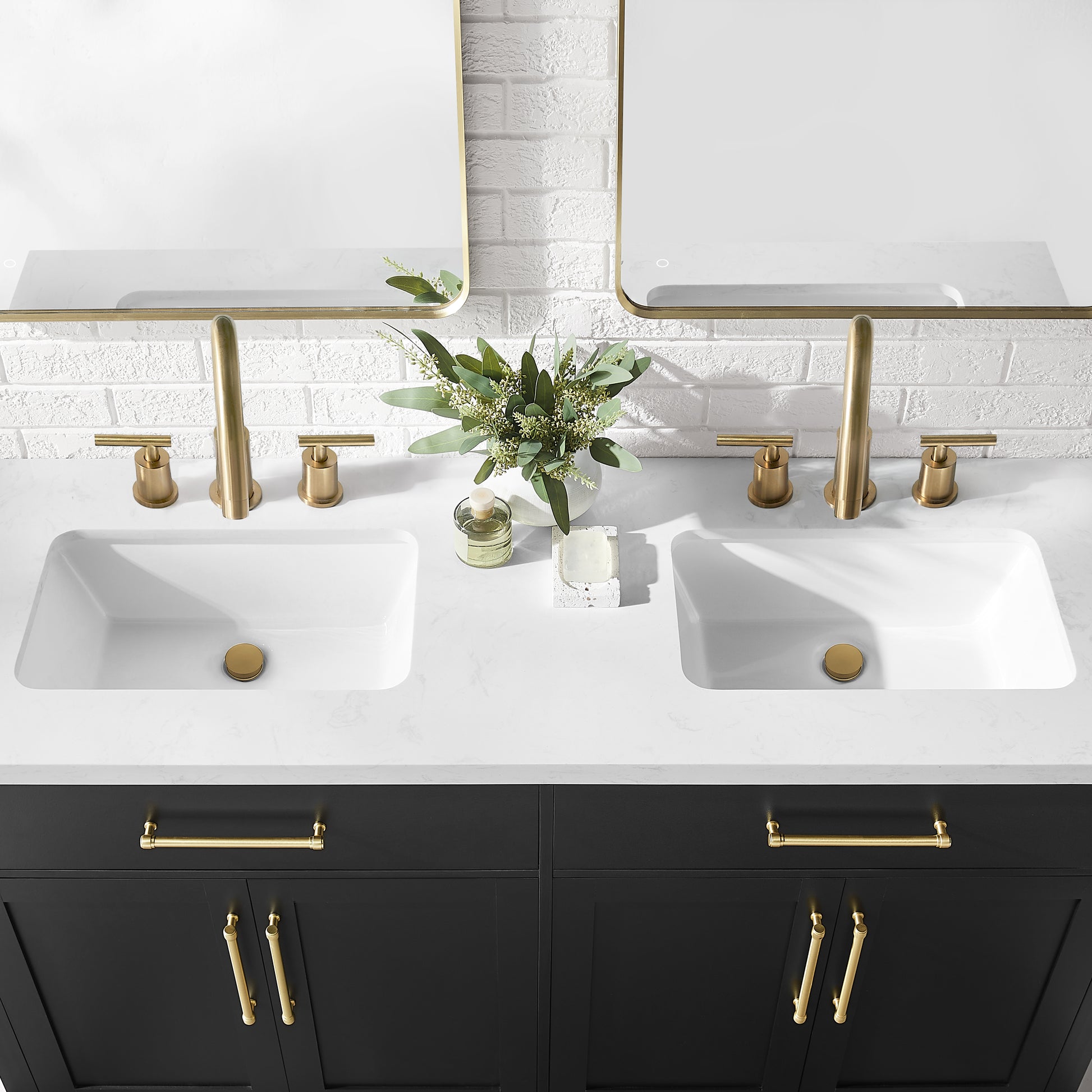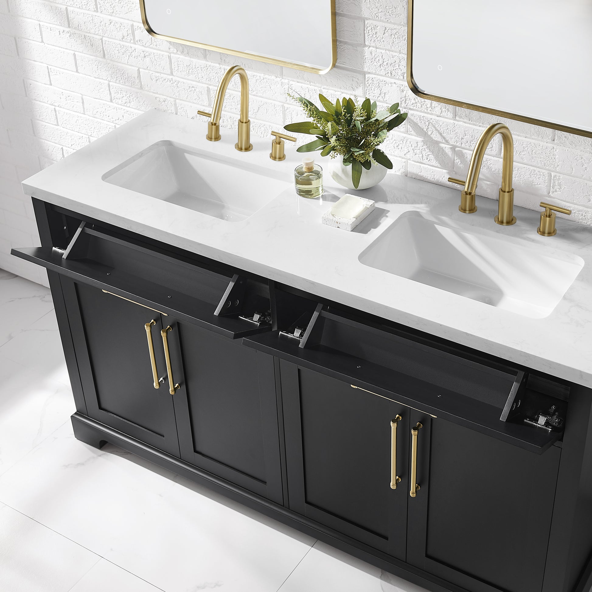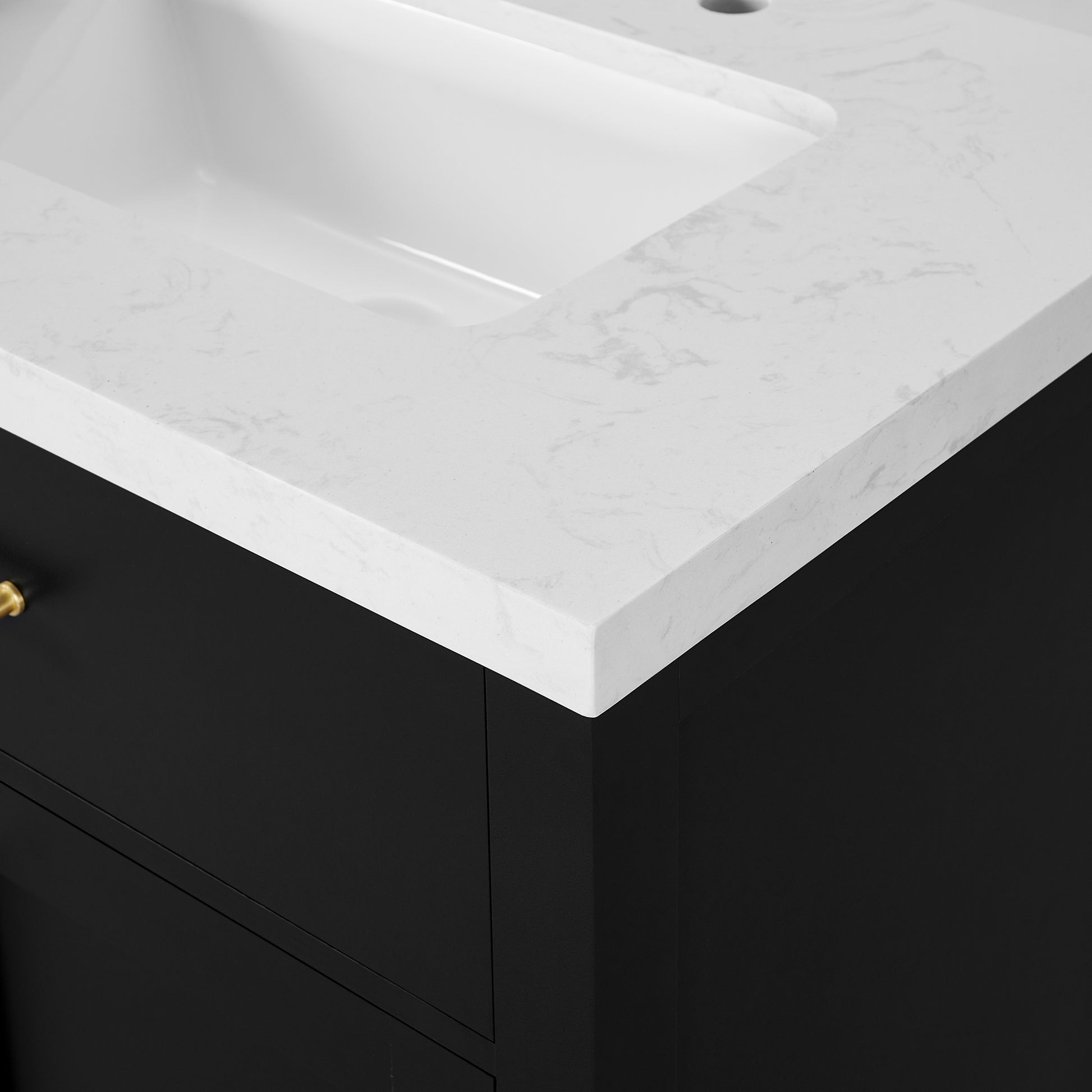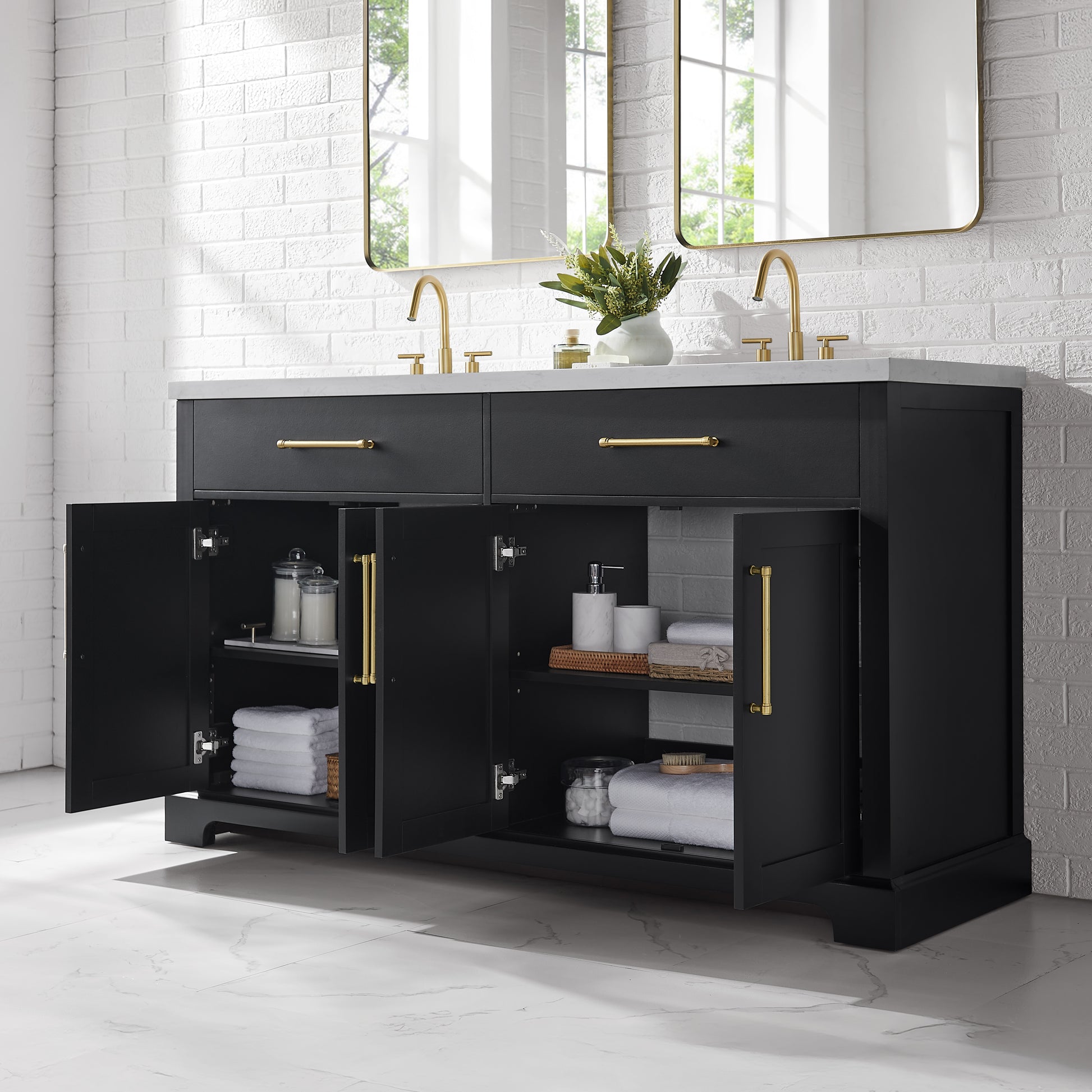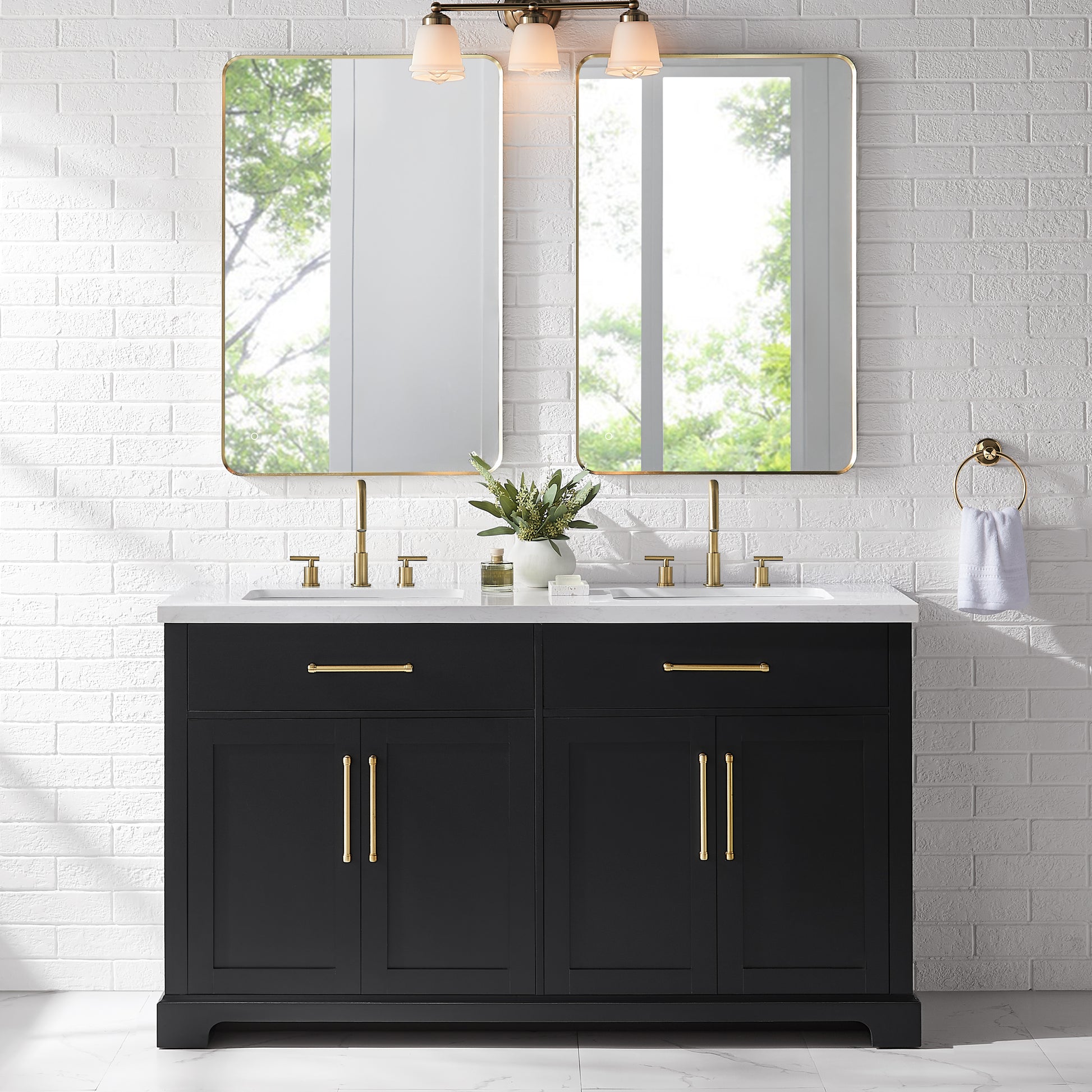 Laissez-vous tenter par l'élégance raffinée de cette collection de meubles-lavabos, un ajout sophistiqué à votre oasis de salle de bain. Avec une finition noire encre, ce meuble-lavabo de 60 pouces dégage un charme intemporel qui s'harmonisera parfaitement avec une variété de styles de décoration. Le dessus en pierre reconstituée blanche légèrement veinée de gris est pré-percé pour deux robinets espacés de 8 pouces (robinets non inclus) et comprend deux lavabos sous plan en porcelaine vitrifiée blanche. Dotée de charnières à fermeture lente, de deux tiroirs supérieurs inclinables et de deux armoires spacieuses à double porte avec étagères réglables, cette pièce entièrement assemblée allie harmonieusement praticité et luxe. Le meuble-lavabo est livré avec deux ensembles de quincaillerie, vous permettant de choisir l'accent qui complète le mieux votre sanctuaire - nickel brossé ou or brossé. Élevez votre routine quotidienne avec cet ensemble de meuble-lavabo, transformant chaque moment en une affaire indulgente.