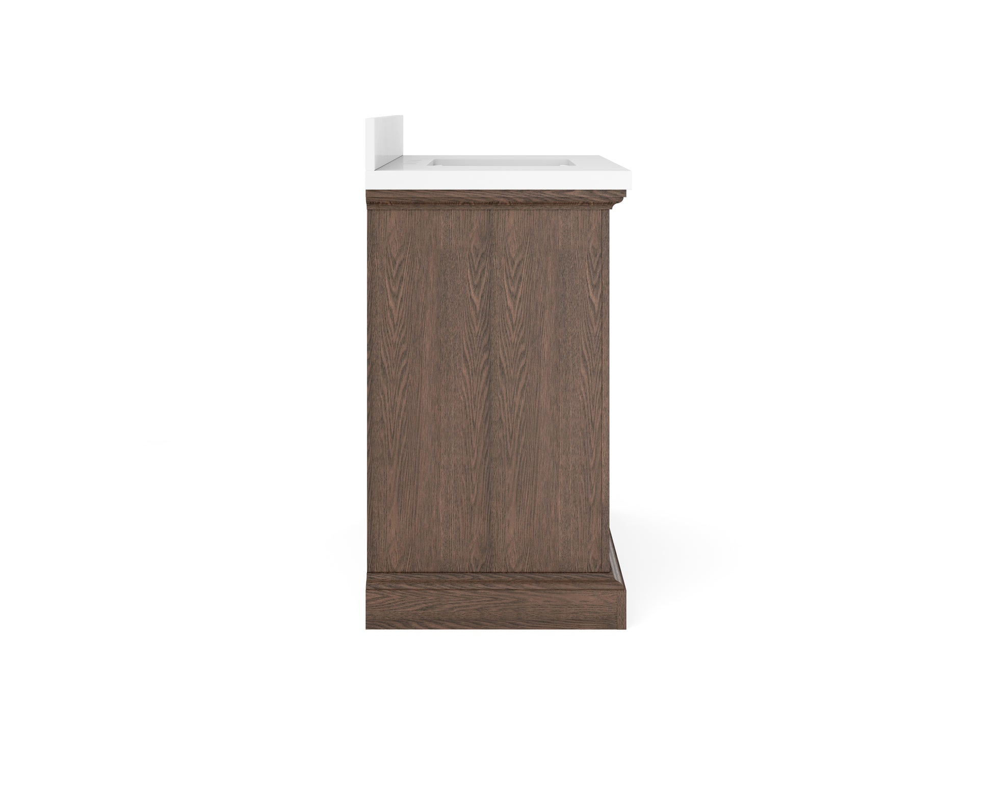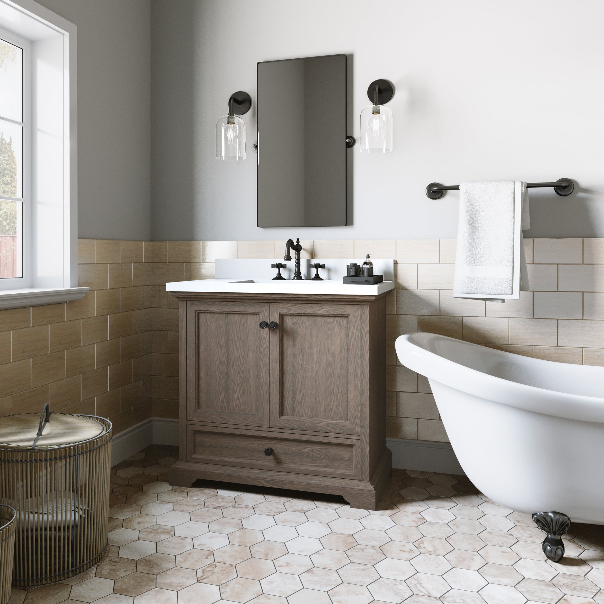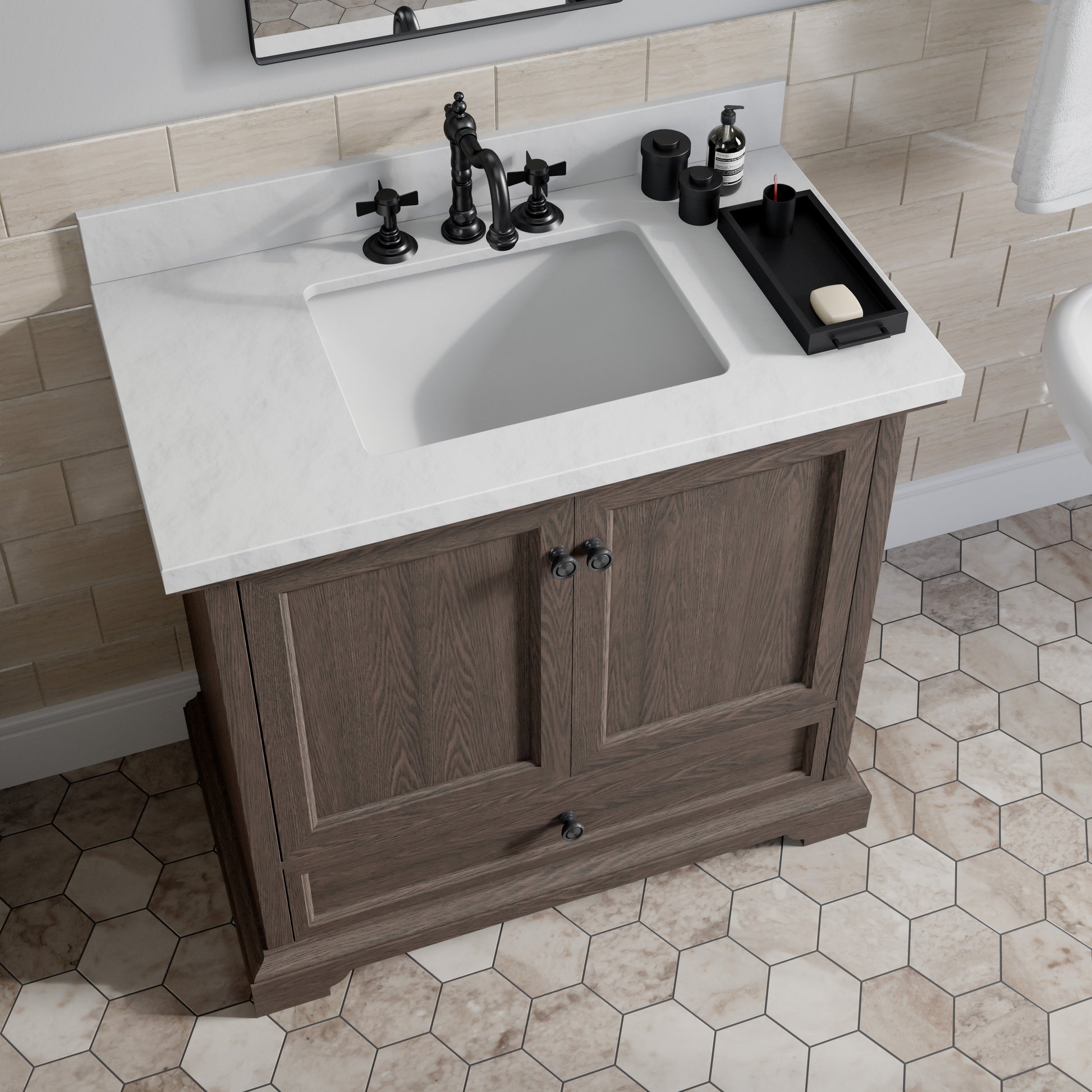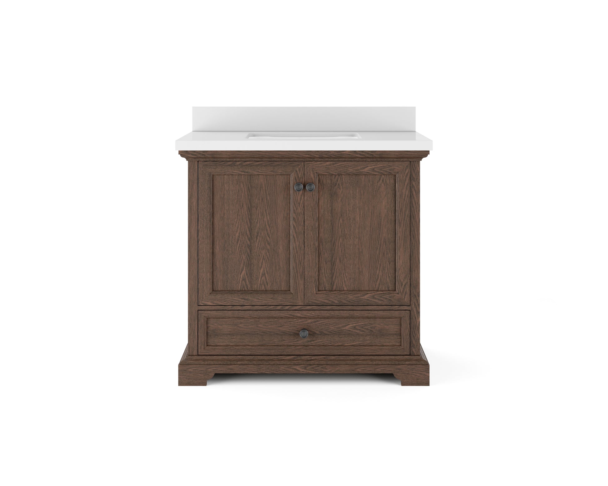 Storage for days! This 36-inch vanity features a traditional design enhanced by a premium dark oak finish. The vanity showcases its quality and style with a solid wood frame, dark pewter hardware, and soft-close hinges and glides. Store all your essentials with its spacious double-door cabinet with an adjustable shelf inside and a full bottom drawer. It's topped with a quartz white top and a white vitreous china rectangular undermount sink.