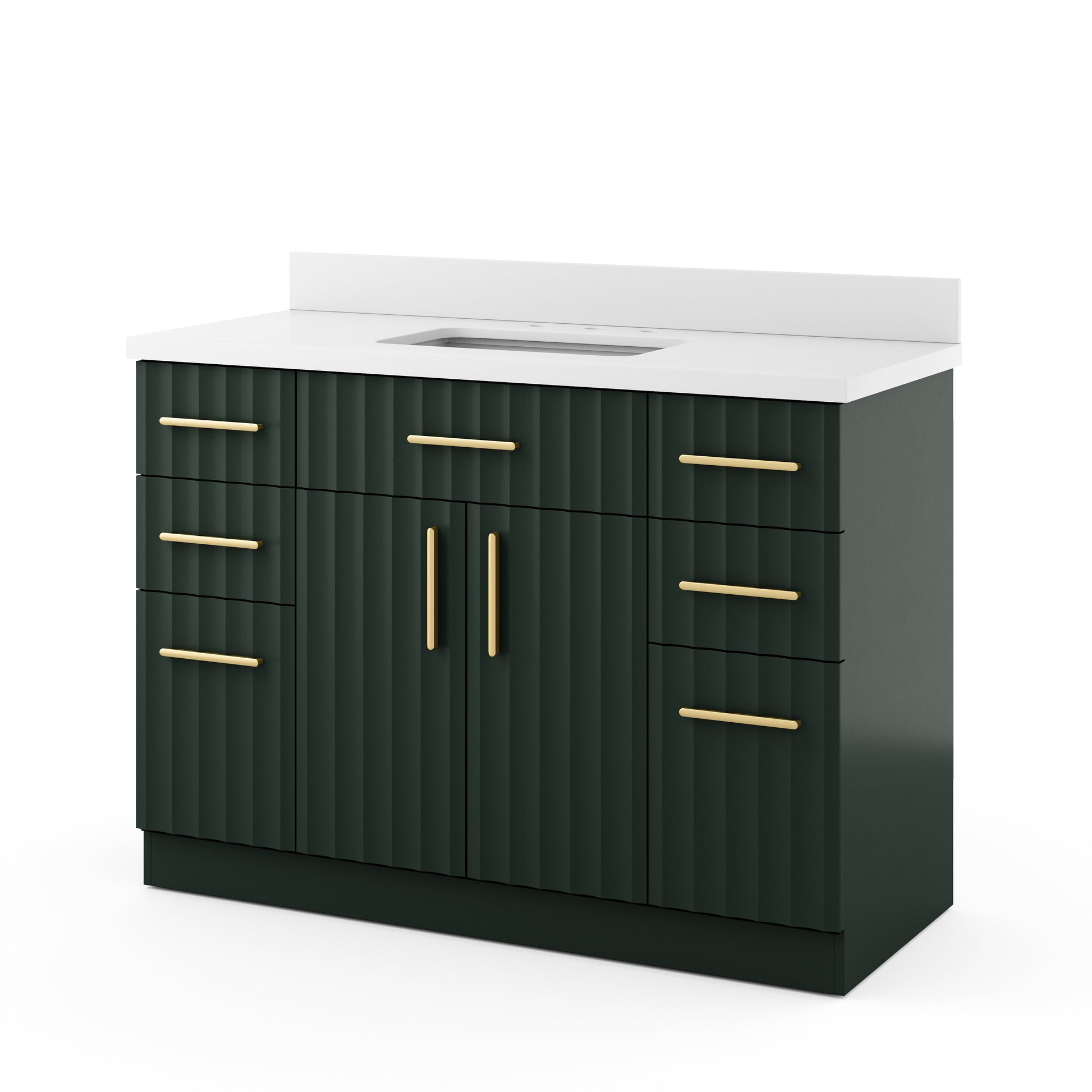 The Buntz Collection features a contemporary design with unique styling, enhanced by a bold forest green finish and unique fluted design. The Buntz 48 in. vanity showcases its quality and style with its solid wood frame, brushed gold hardware, soft-close hinges, and smooth-close glides, and offers a spacious two-door cabinet with 6 full drawers and a tilt-out storage drawer for ample storage. The vanity includes a quartz white top and a white vitreous china rectangular undermount sink.
