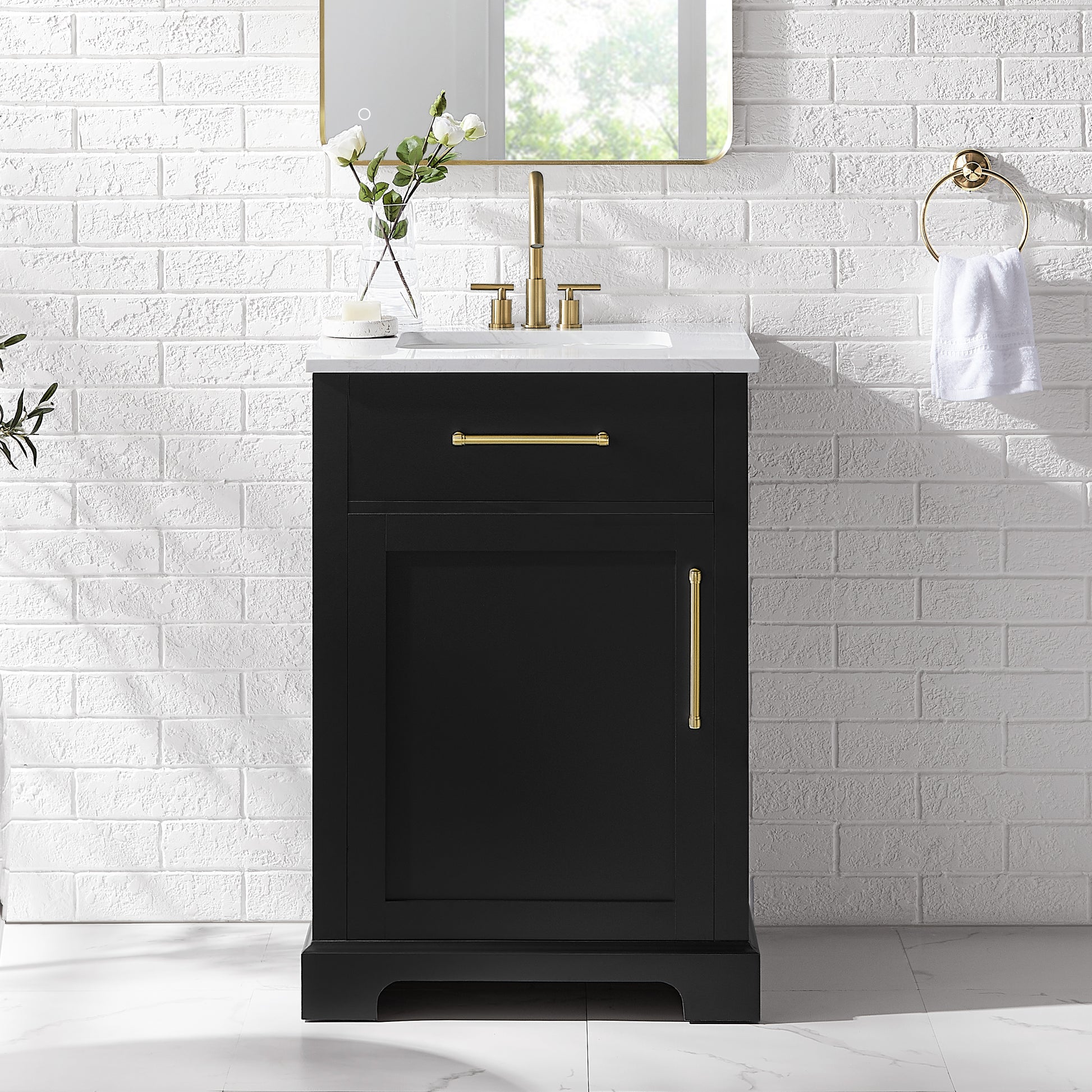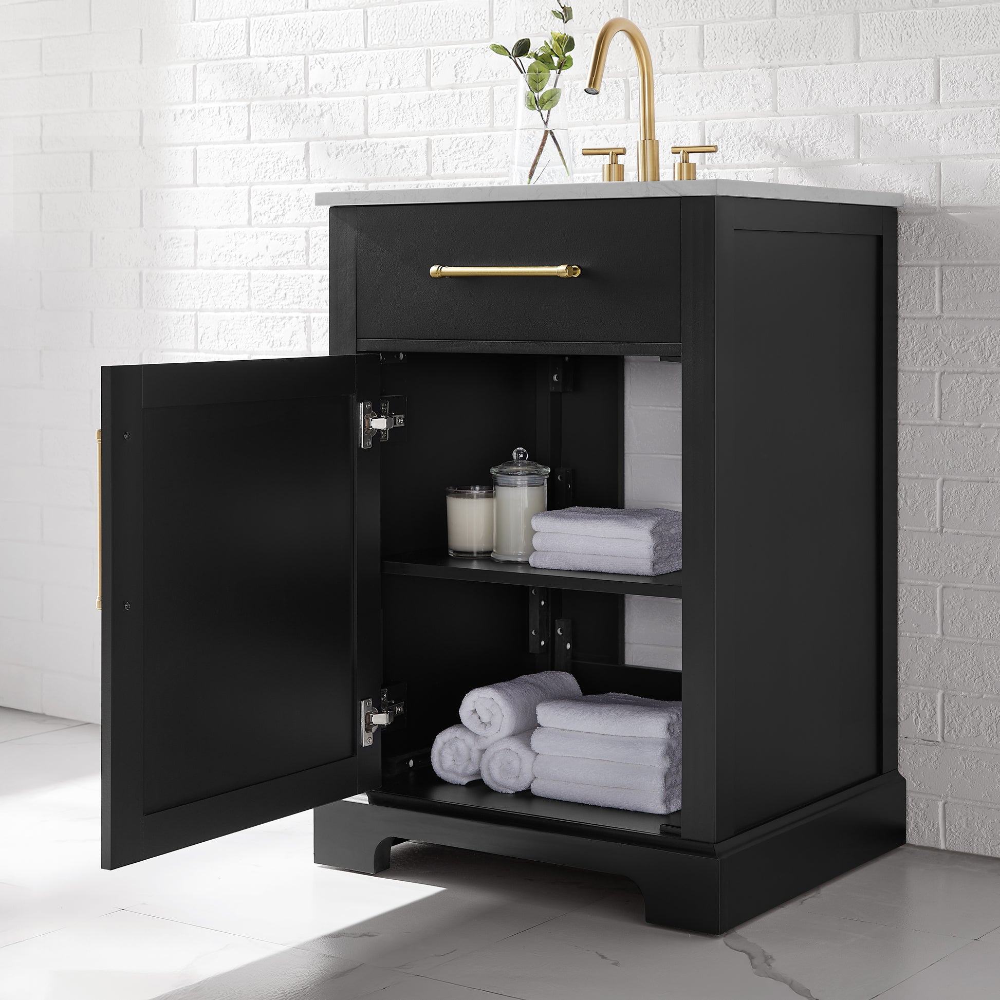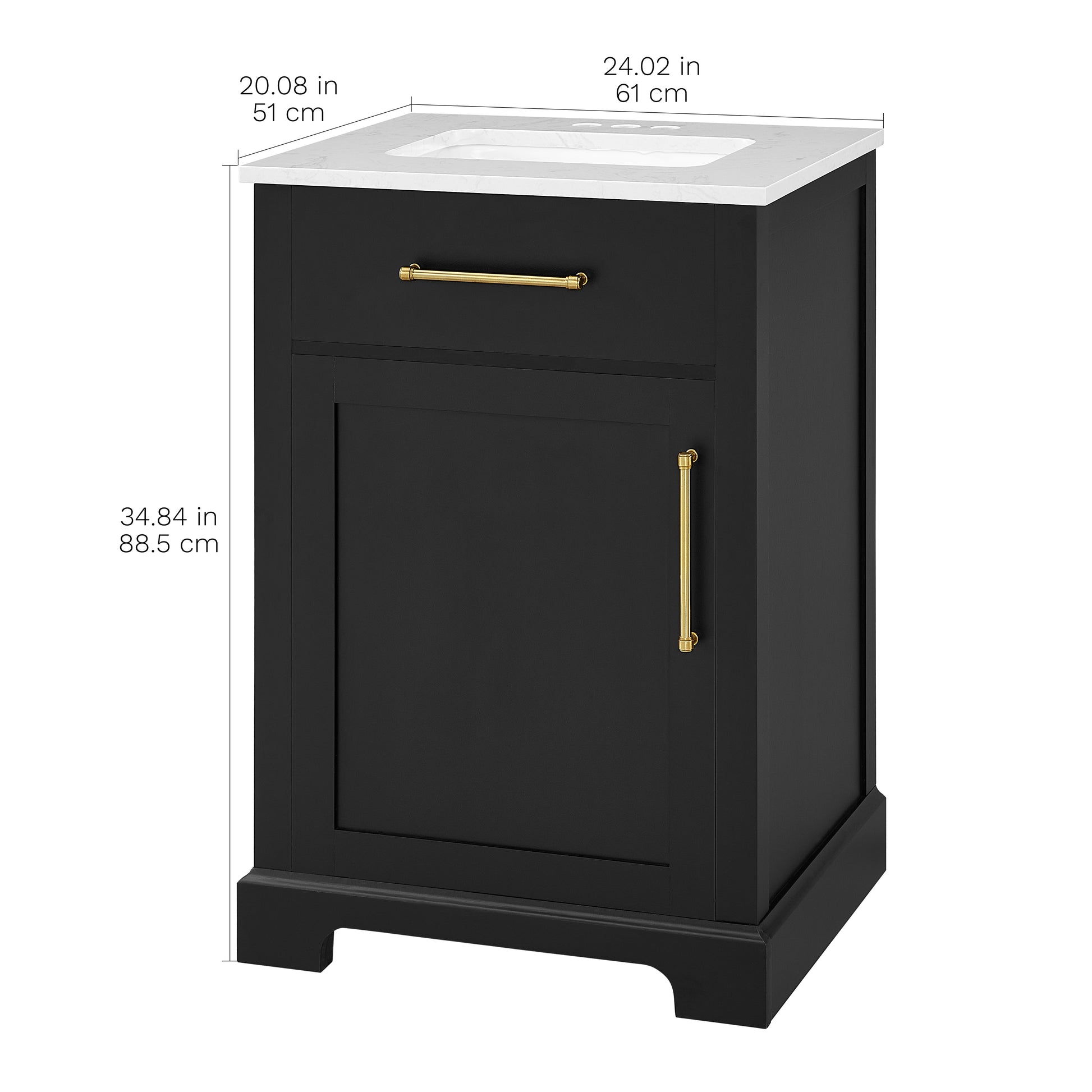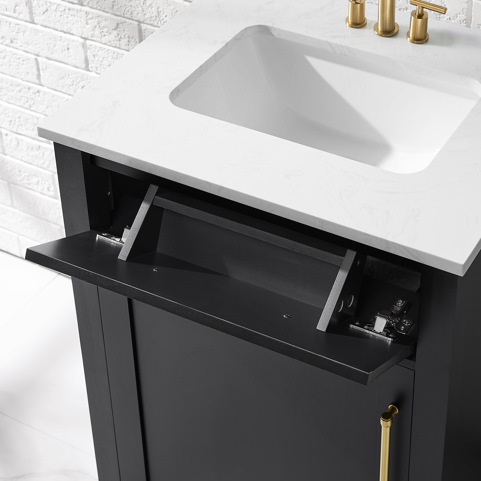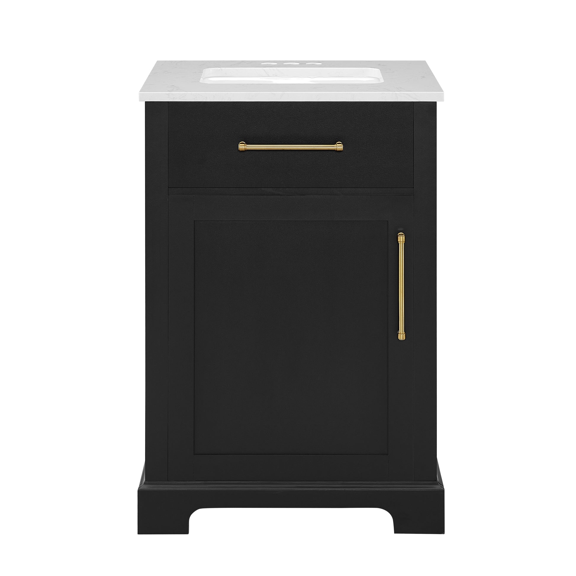 Indulge in the refined elegance of this vanity collection, a sophisticated addition to your bathroom oasis. With an inky black finish, this 24-inch vanity exudes timeless charm that will seamlessly complement a variety of decor styles. The lightly grey-veined white engineered stone top is pre-drilled for a 4" centerset faucet (faucet not included) and includes a white vitreous china undermount sink. Featuring slow-close hinges, a top tilt-out drawer, and a spacious cabinet with an adjustable shelf, this fully assembled piece seamlessly blends practicality with luxury. The vanity arrives with two sets of hardware, allowing you to choose the accent that best completes your sanctuary - brushed nickel or brushed gold. Elevate your daily routine with this vanity set, transforming each moment into an indulgent affair.