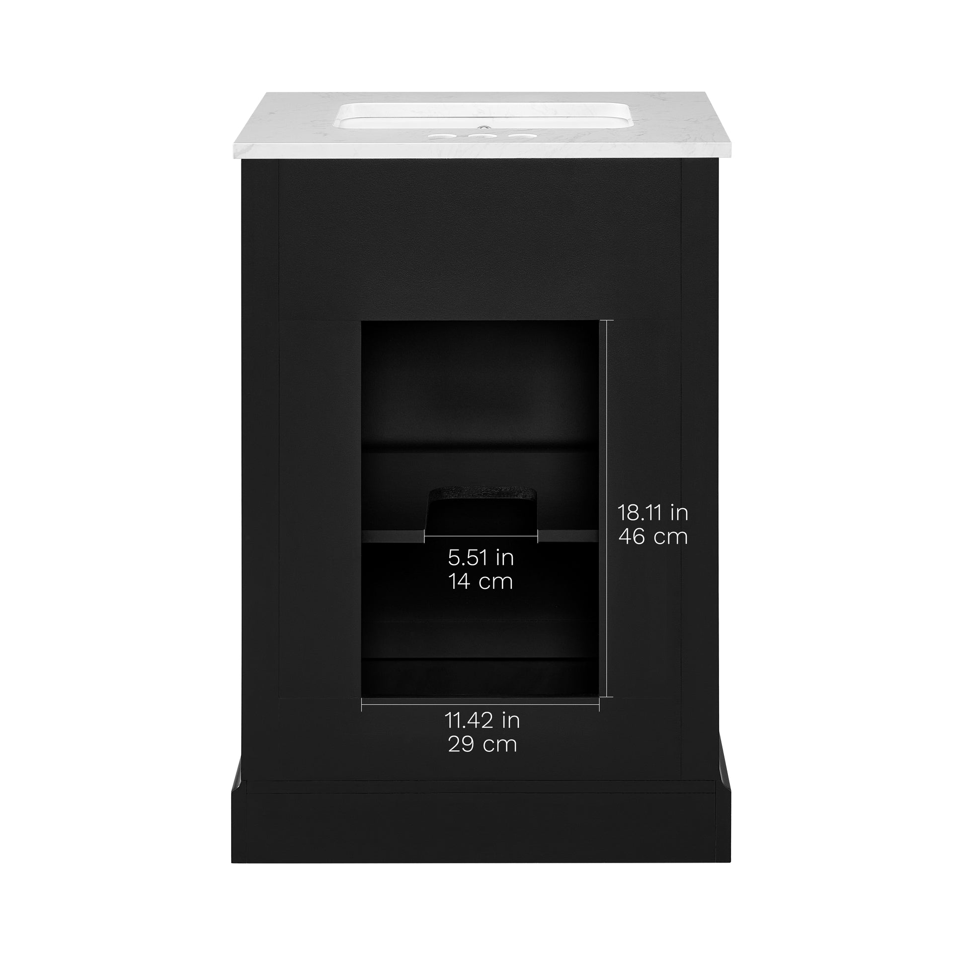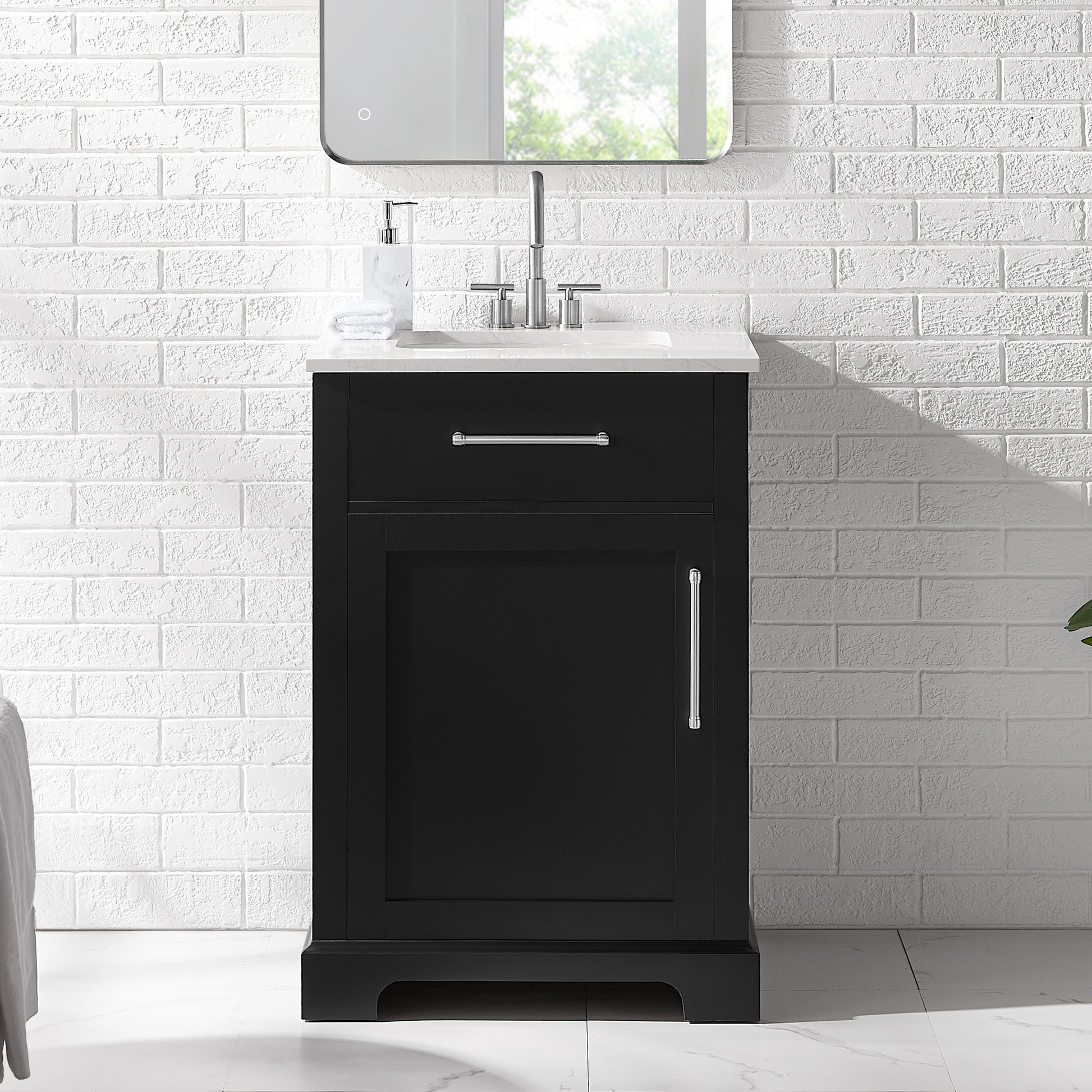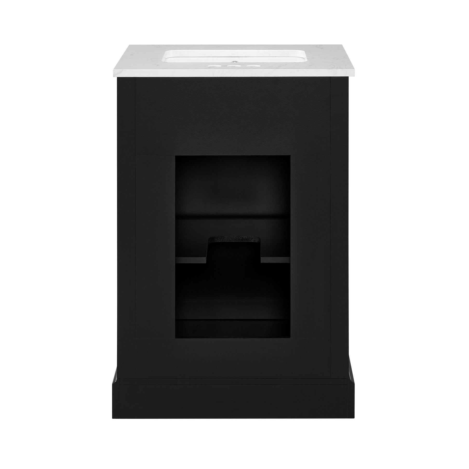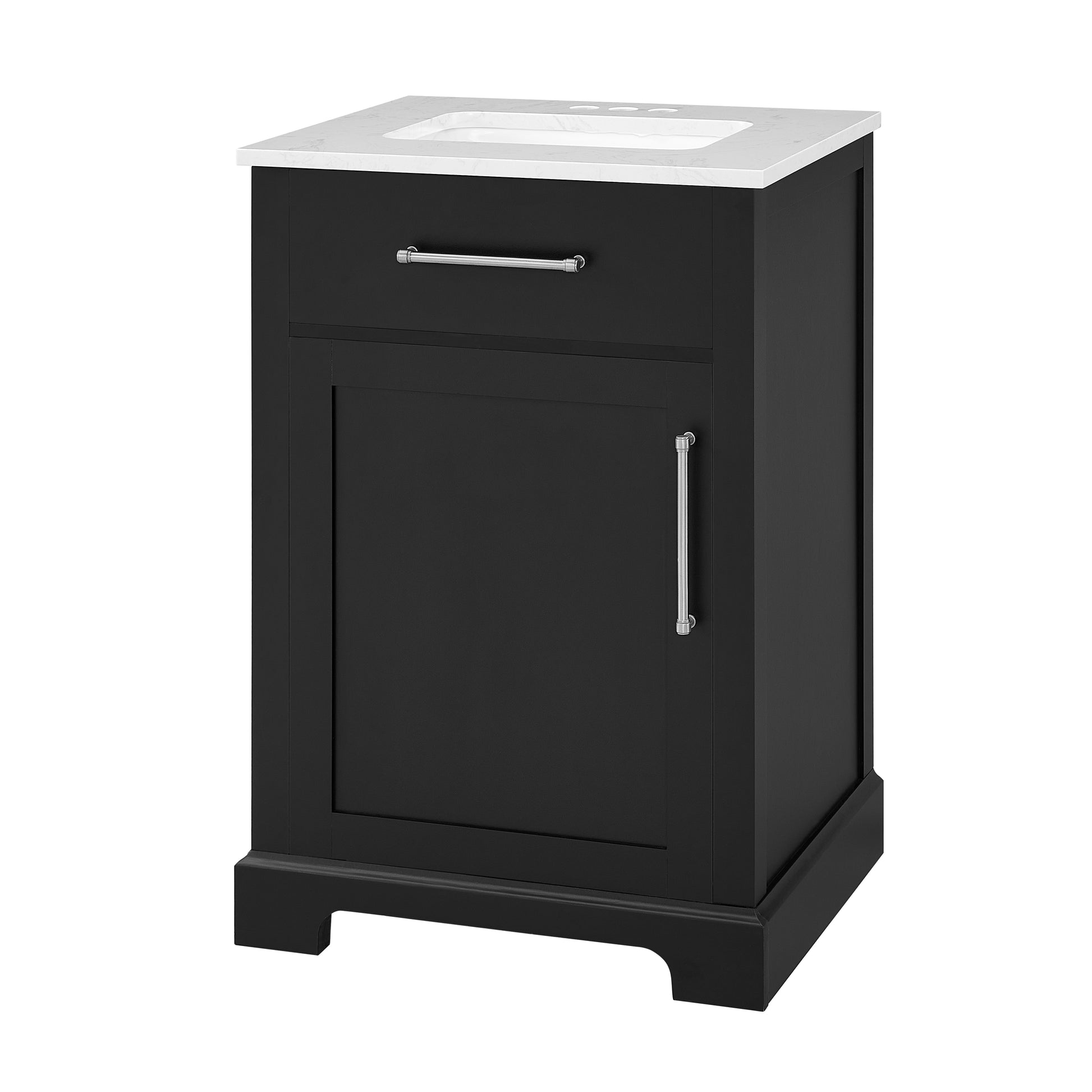 Indulge in the refined elegance of this vanity collection, a sophisticated addition to your bathroom oasis. With an inky black finish, this 24-inch vanity exudes timeless charm that will seamlessly complement a variety of decor styles. The lightly grey-veined white engineered stone top is pre-drilled for a 4" centerset faucet (faucet not included) and includes a white vitreous china undermount sink. Featuring slow-close hinges, a top tilt-out drawer, and a spacious cabinet with an adjustable shelf, this fully assembled piece seamlessly blends practicality with luxury. The vanity arrives with two sets of hardware, allowing you to choose the accent that best completes your sanctuary - brushed nickel or brushed gold. Elevate your daily routine with this vanity set, transforming each moment into an indulgent affair.