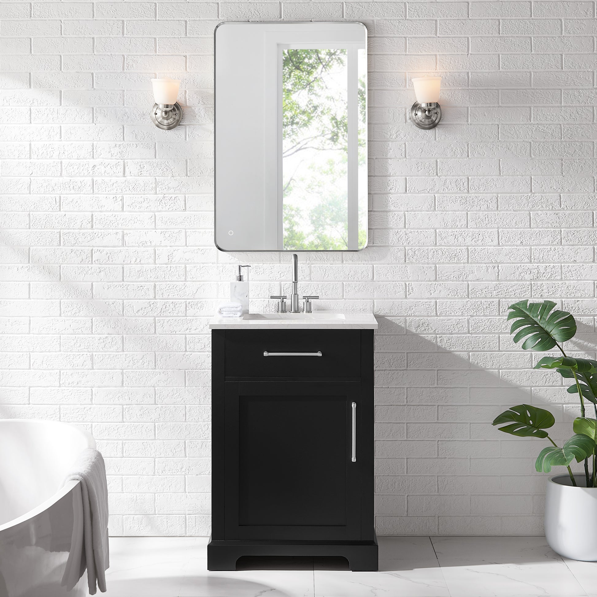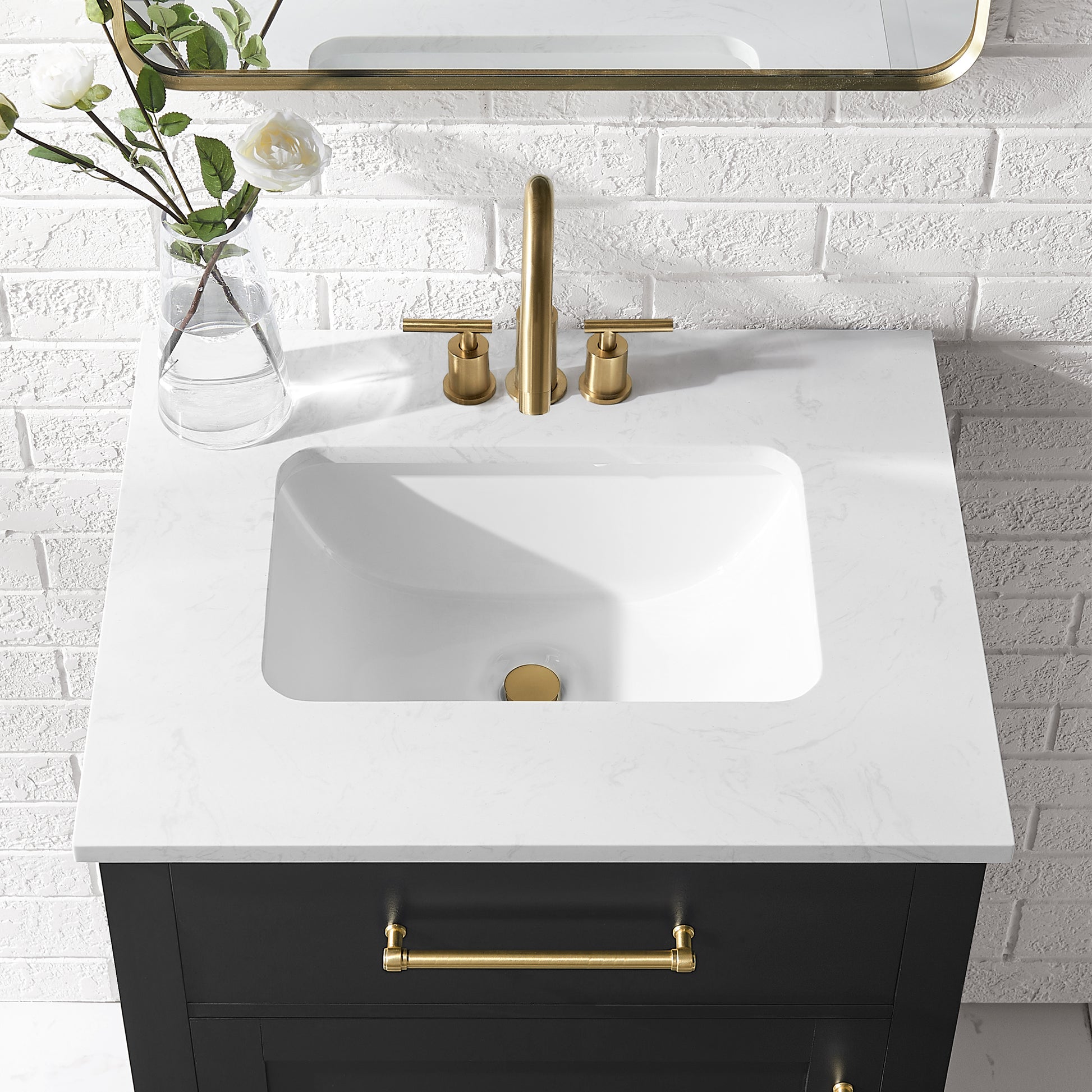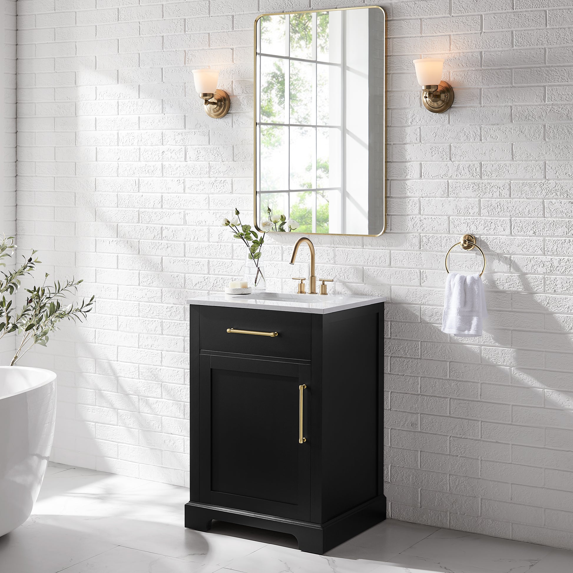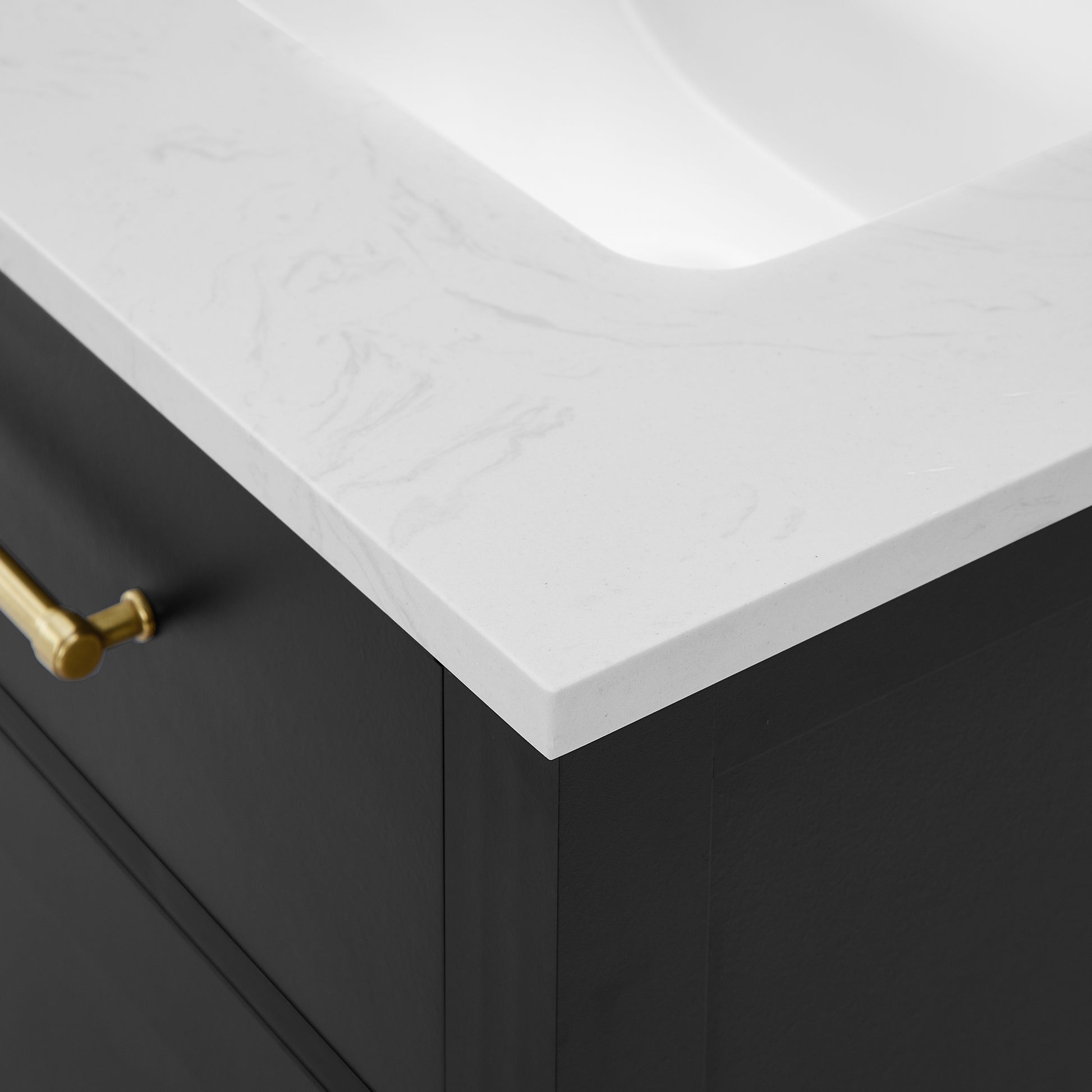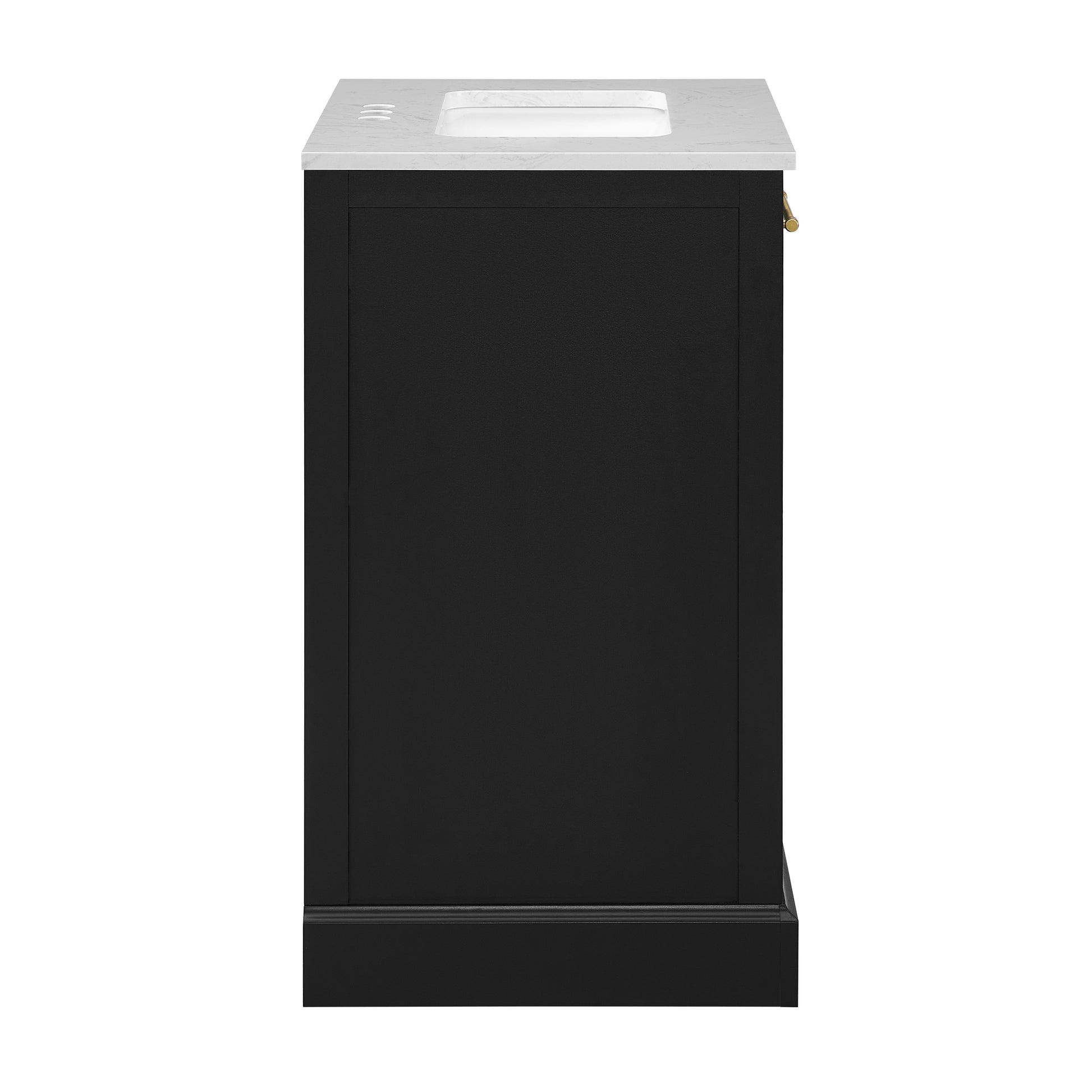 Indulge in the refined elegance of this vanity collection, a sophisticated addition to your bathroom oasis. With an inky black finish, this 24-inch vanity exudes timeless charm that will seamlessly complement a variety of decor styles. The lightly grey-veined white engineered stone top is pre-drilled for a 4" centerset faucet (faucet not included) and includes a white vitreous china undermount sink. Featuring slow-close hinges, a top tilt-out drawer, and a spacious cabinet with an adjustable shelf, this fully assembled piece seamlessly blends practicality with luxury. The vanity arrives with two sets of hardware, allowing you to choose the accent that best completes your sanctuary - brushed nickel or brushed gold. Elevate your daily routine with this vanity set, transforming each moment into an indulgent affair.