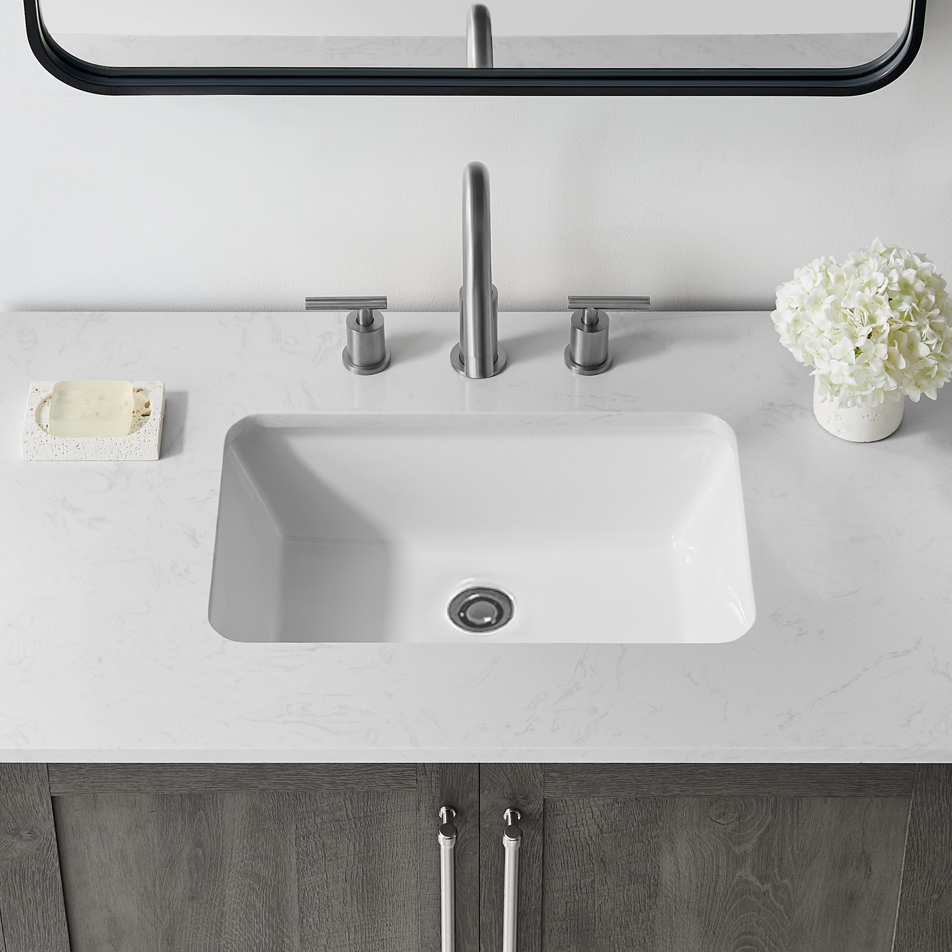 - Includes white, rectangular, vitreous china undermount sink