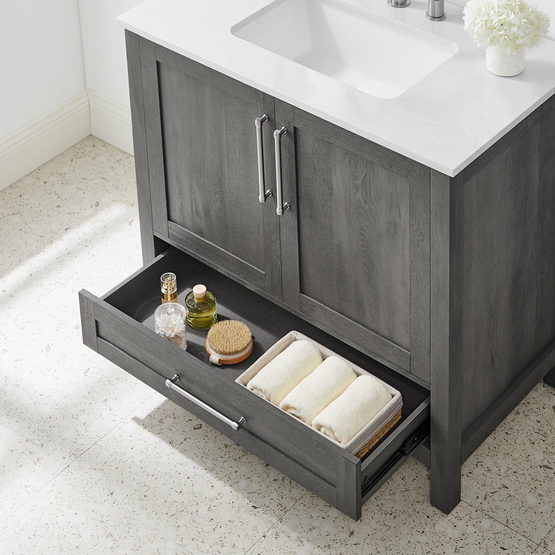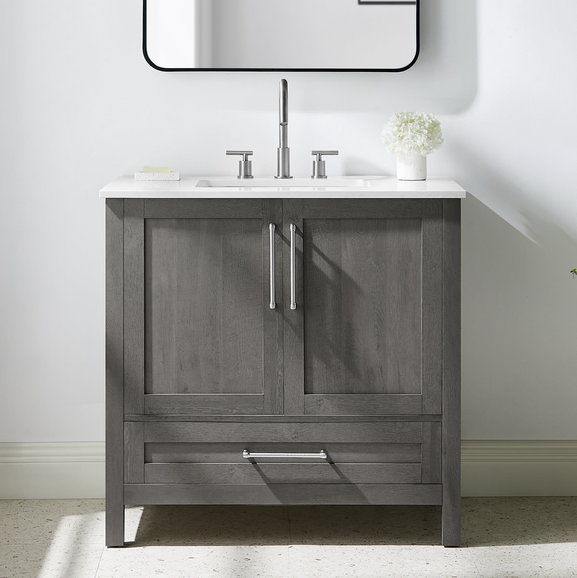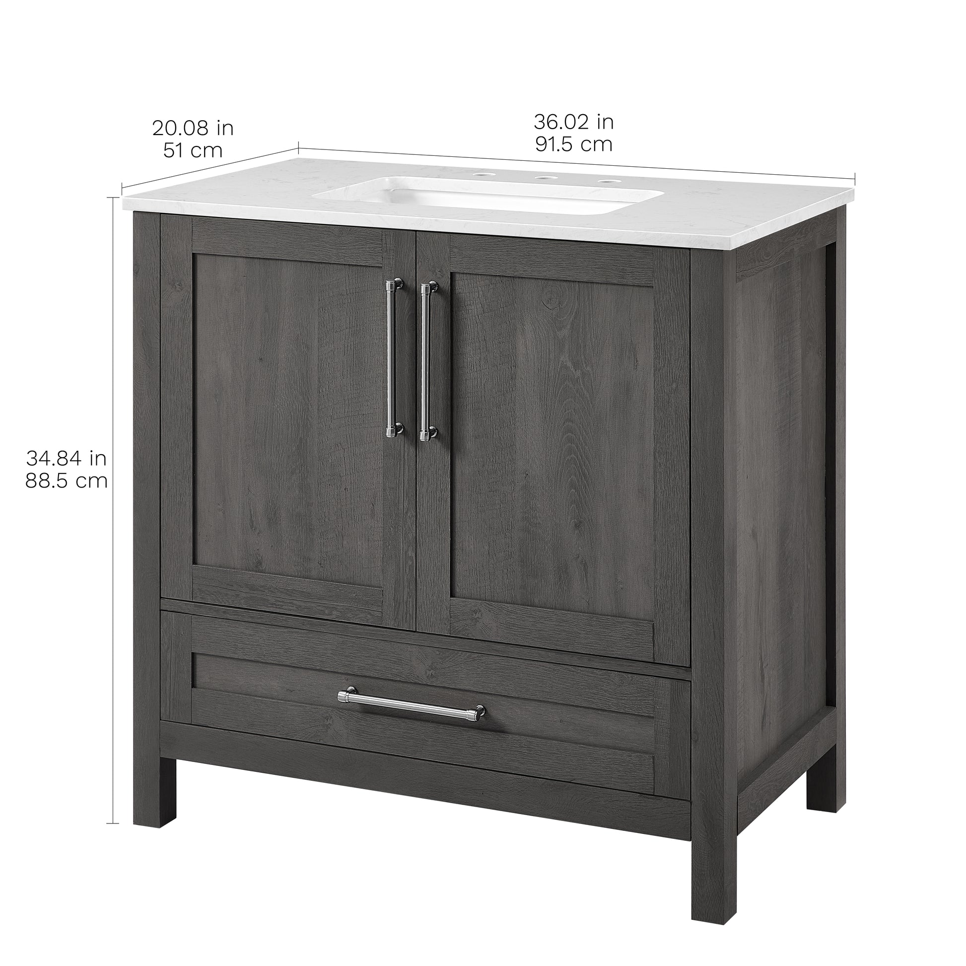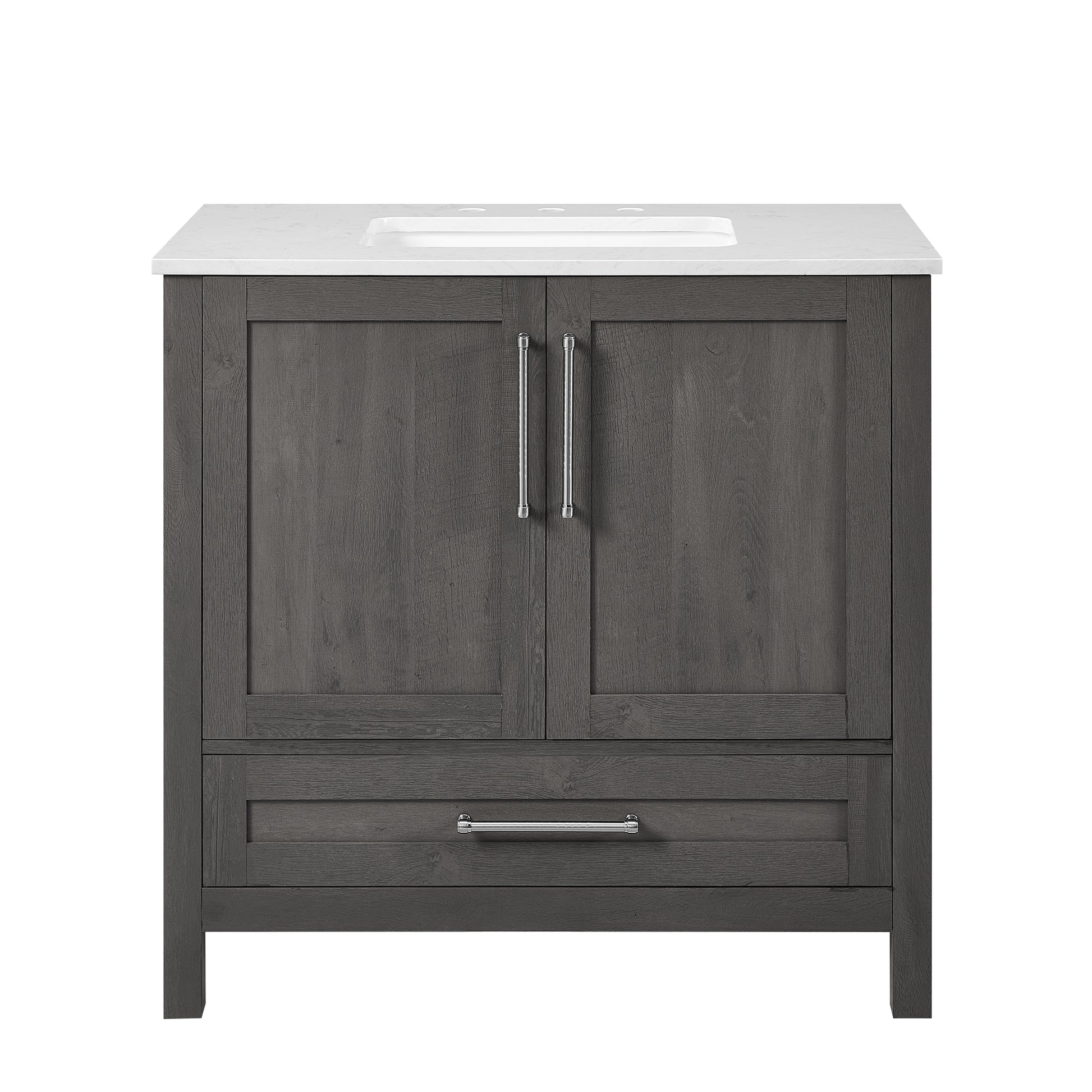 Discover the understated refinement of this vanity collection, a true testament to timeless sophistication in your bathroom retreat. This 36-inch vanity features a rich grey wood finish that adds a touch of elegance to any space. The lightly grey-veined white engineered stone top includes a white vitreous china undermount sink, exuding luxury in every detail. Equipped with pre-drilled holes for an 8" widespread faucet (faucet not included), this fully assembled masterpiece boasts slow-close hinges and glides and brushed nickel hardware for a truly luxurious experience. A spacious double-door cabinet sits atop a wide bottom drawer, offering both practicality and opulence. Elevate your daily routine with this vanity set, where each moment becomes a refined indulgence in your own private oasis.