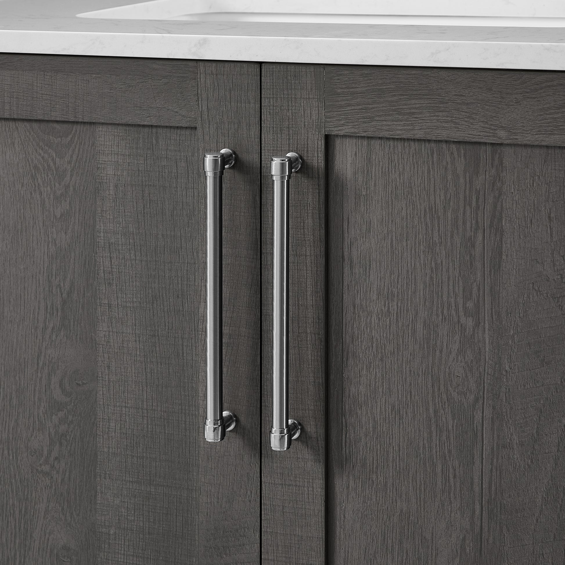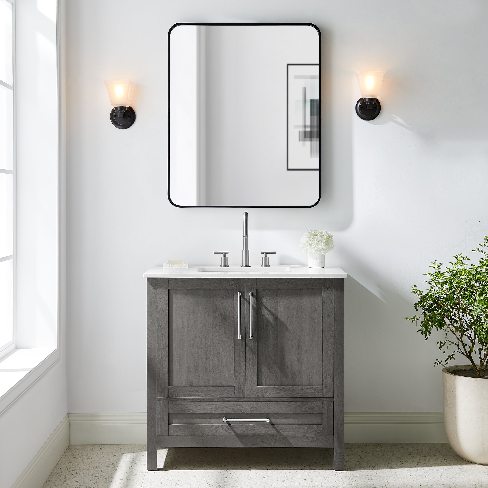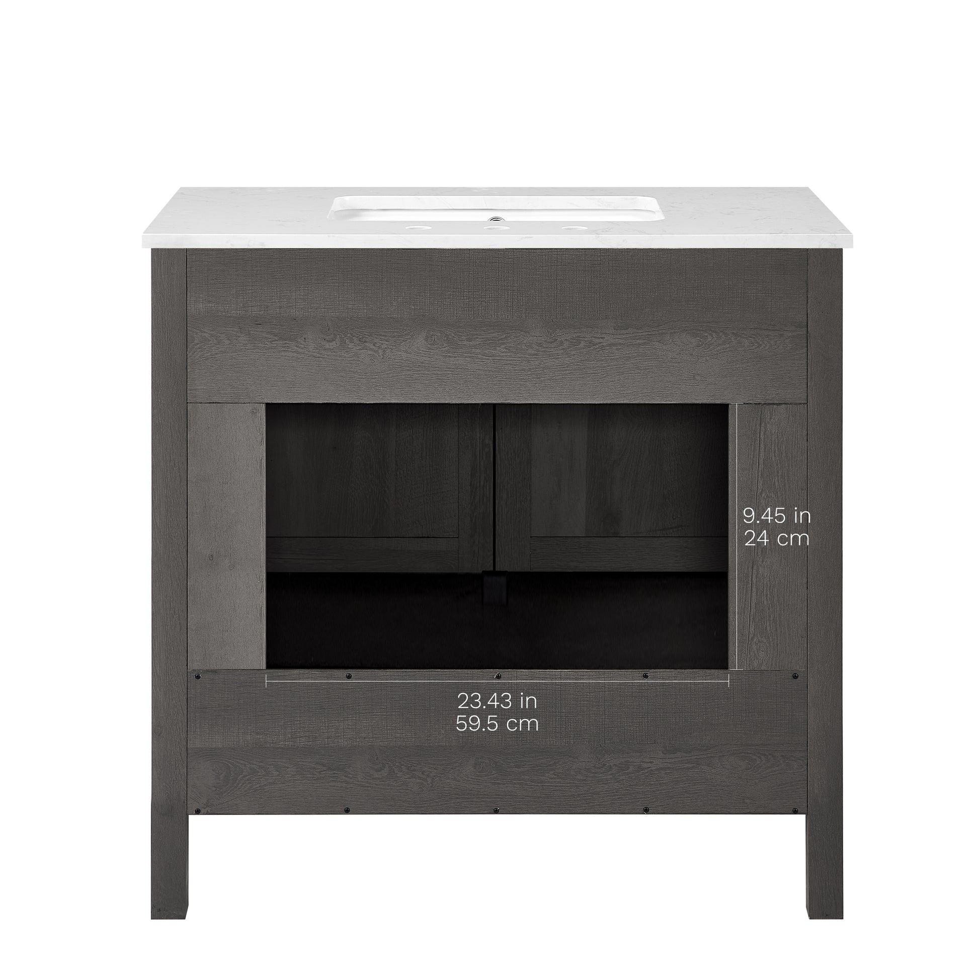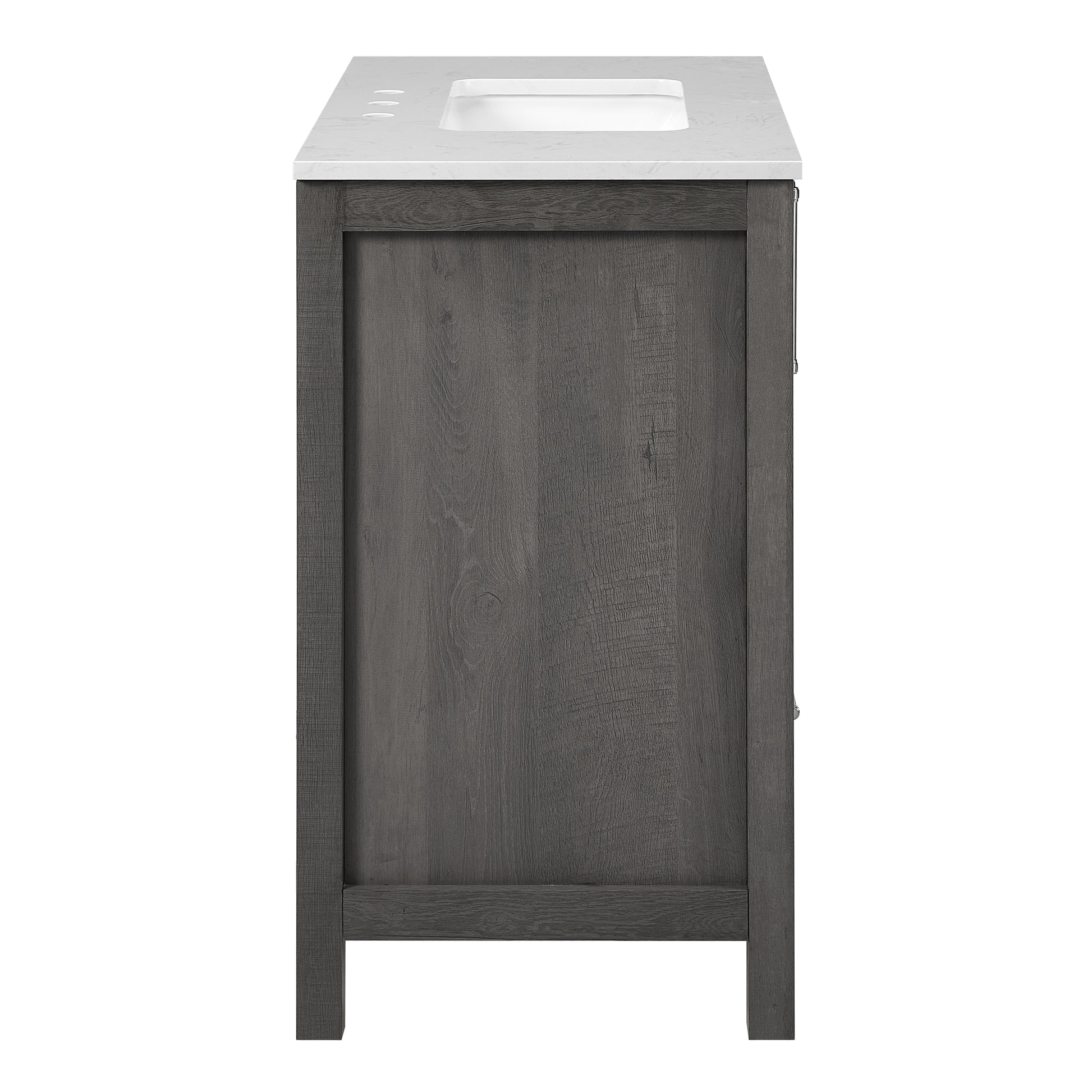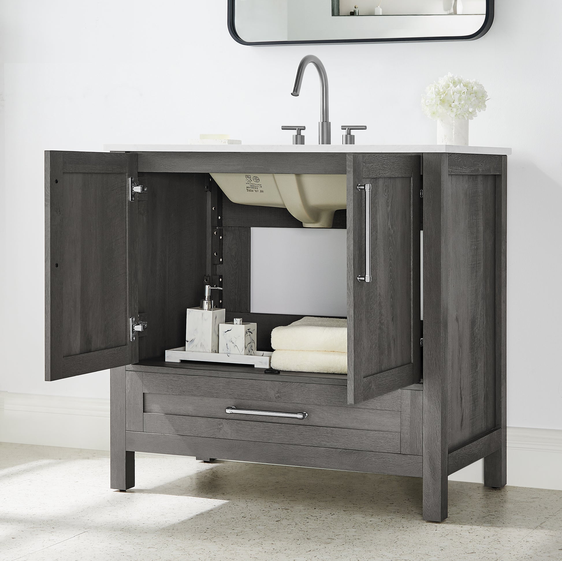 Discover the understated refinement of this vanity collection, a true testament to timeless sophistication in your bathroom retreat. This 36-inch vanity features a rich grey wood finish that adds a touch of elegance to any space. The lightly grey-veined white engineered stone top includes a white vitreous china undermount sink, exuding luxury in every detail. Equipped with pre-drilled holes for an 8" widespread faucet (faucet not included), this fully assembled masterpiece boasts slow-close hinges and glides and brushed nickel hardware for a truly luxurious experience. A spacious double-door cabinet sits atop a wide bottom drawer, offering both practicality and opulence. Elevate your daily routine with this vanity set, where each moment becomes a refined indulgence in your own private oasis.