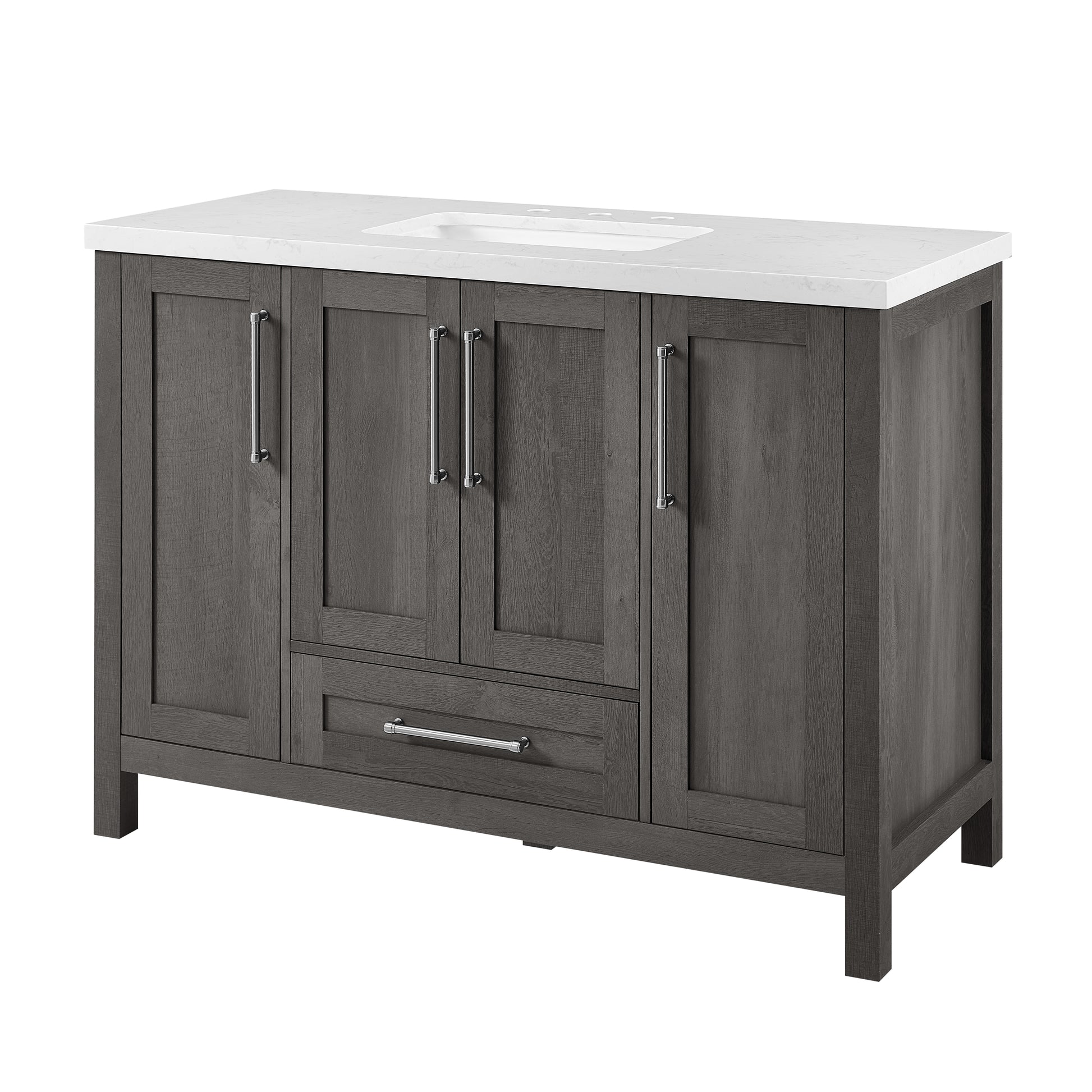 Discover the understated refinement of this vanity collection, a true testament to timeless sophistication in your bathroom retreat. This 48-inch vanity features a rich grey wood finish that adds a touch of elegance to any space. The lightly grey-veined white engineered stone top includes a white vitreous china undermount sink, exuding luxury in every detail. Equipped with pre-drilled holes for an 8" widespread faucet (faucet not included), this fully assembled masterpiece boasts slow-close hinges and glides and brushed nickel hardware for a truly luxurious experience. The spacious double-door cabinet, central bottom drawer, and two side cabinets with adjustable shelves offer practicality and opulence. Elevate your daily routine with this vanity set, where each moment becomes a refined indulgence in your own private oasis.
