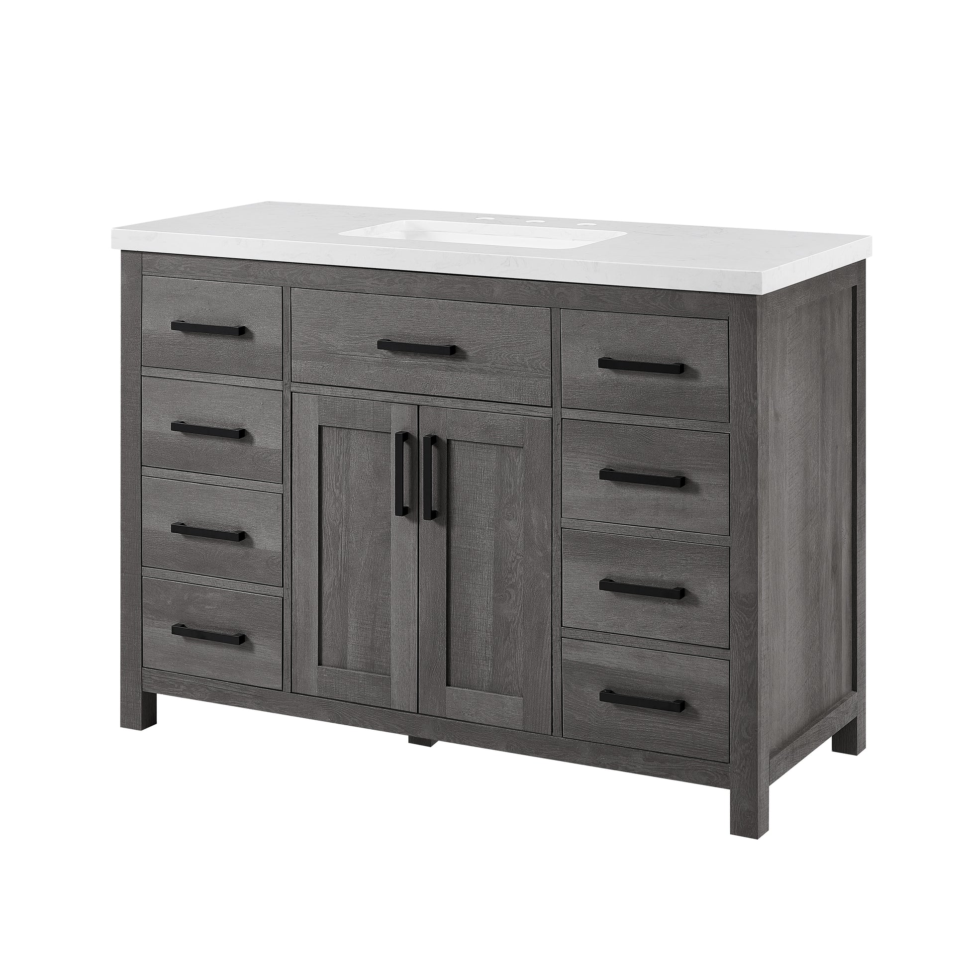 Step into a realm of timeless grace and rustic charm with this vanity collection. This 48-inch masterpiece, adorned in a rustic grey-brown paper veneer finish, beckons you with its modern farmhouse allure. The white engineered stone top, veined delicately in light grey, is pre-drilled for an 8-inch widespread faucet (faucet not included) and includes a white vitreous china undermount sink. Discover convenience in every detail, from the slow-close hinges and glides to the black hardware that adds a touch of refinement. With a practical tilt-out drawer, 8 full-extension drawers, and a spacious double-door cabinet, this fully assembled vanity offers both functionality and finesse. Let this vanity set adorn your sanctuary and watch as love at first sight turns into a lasting commitment to luxury.