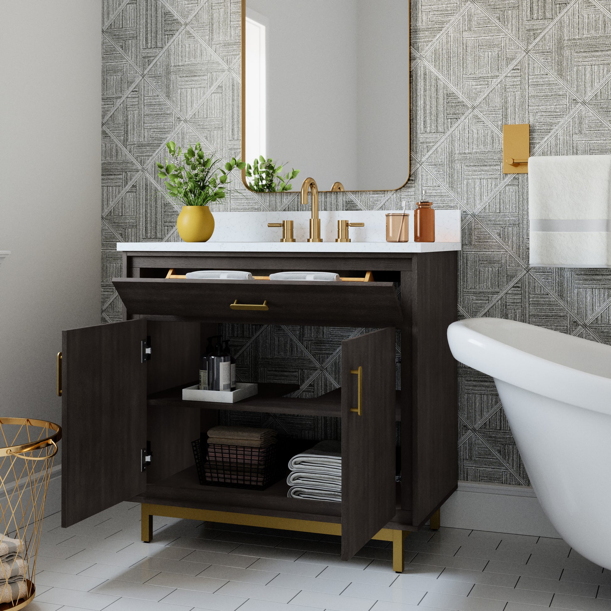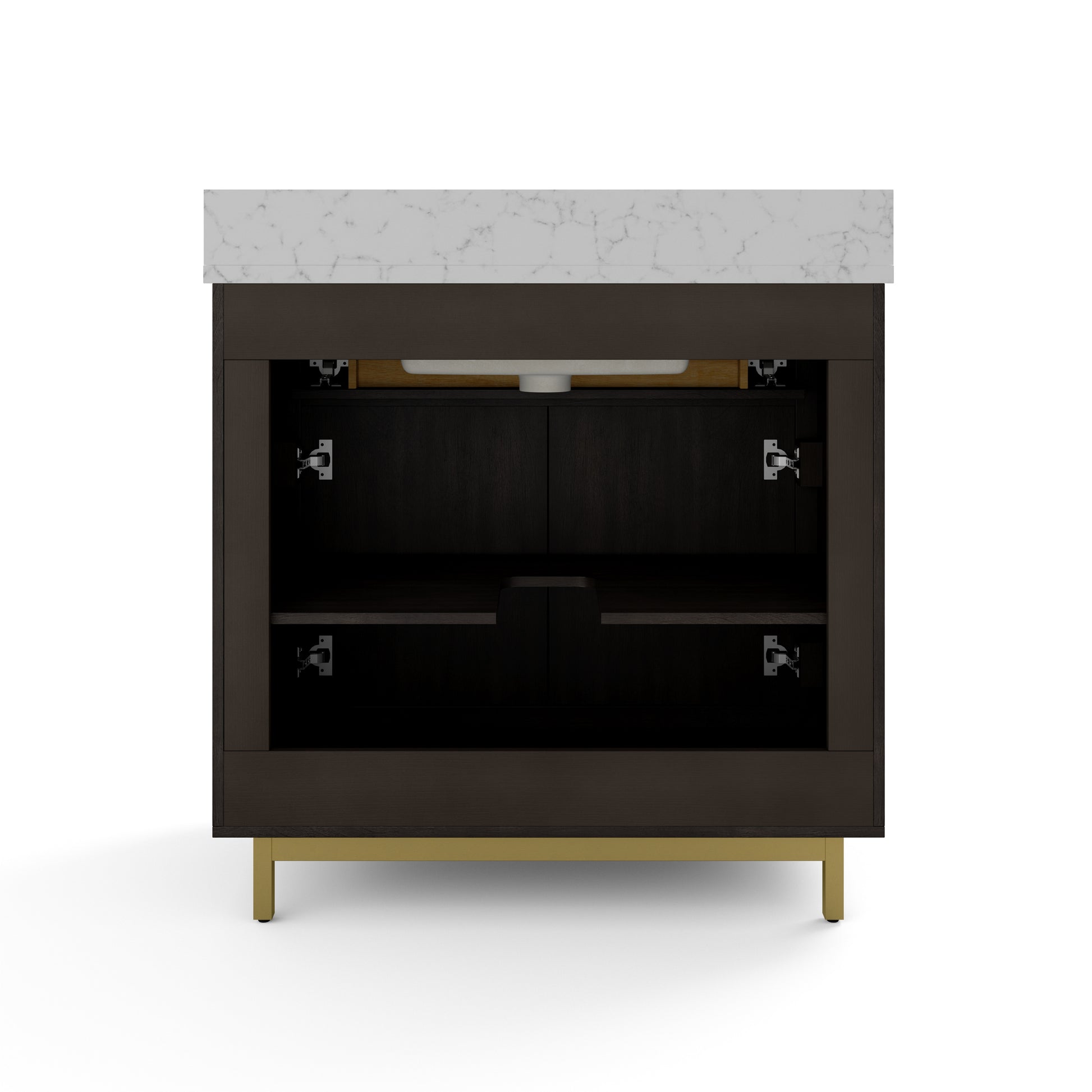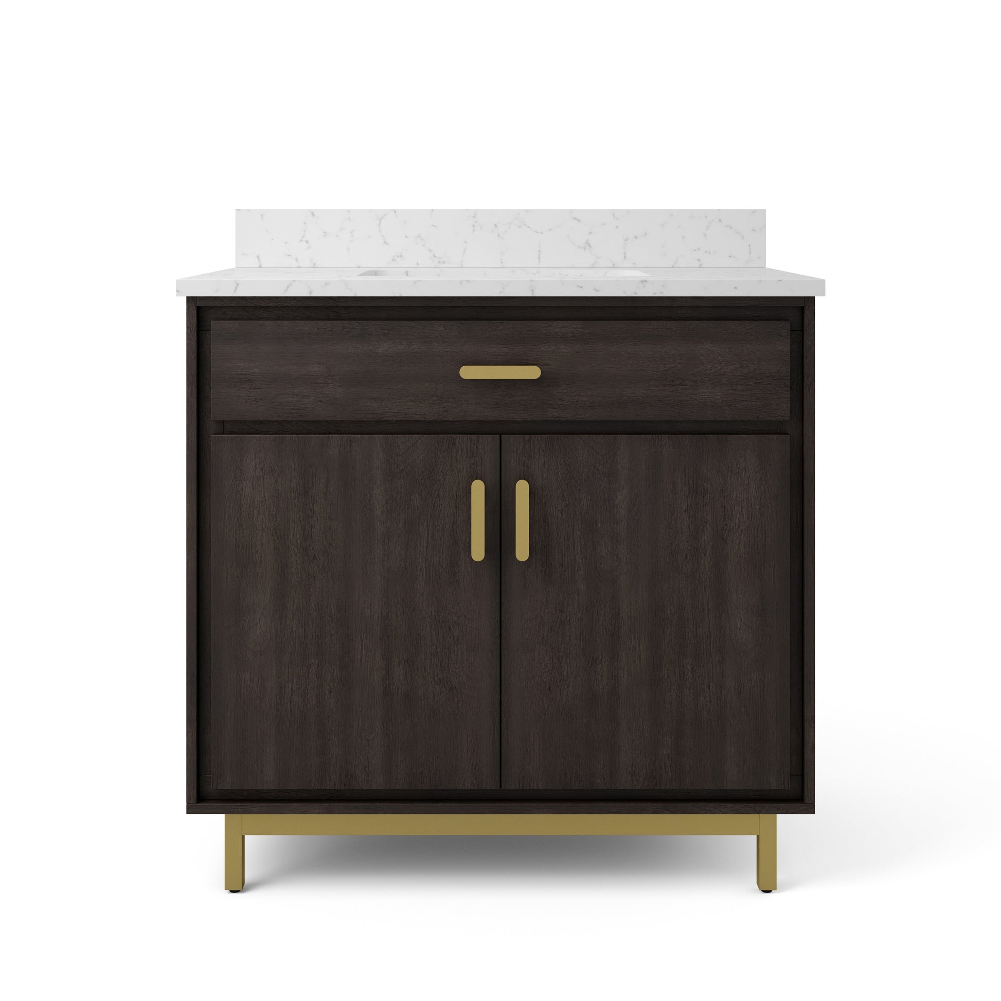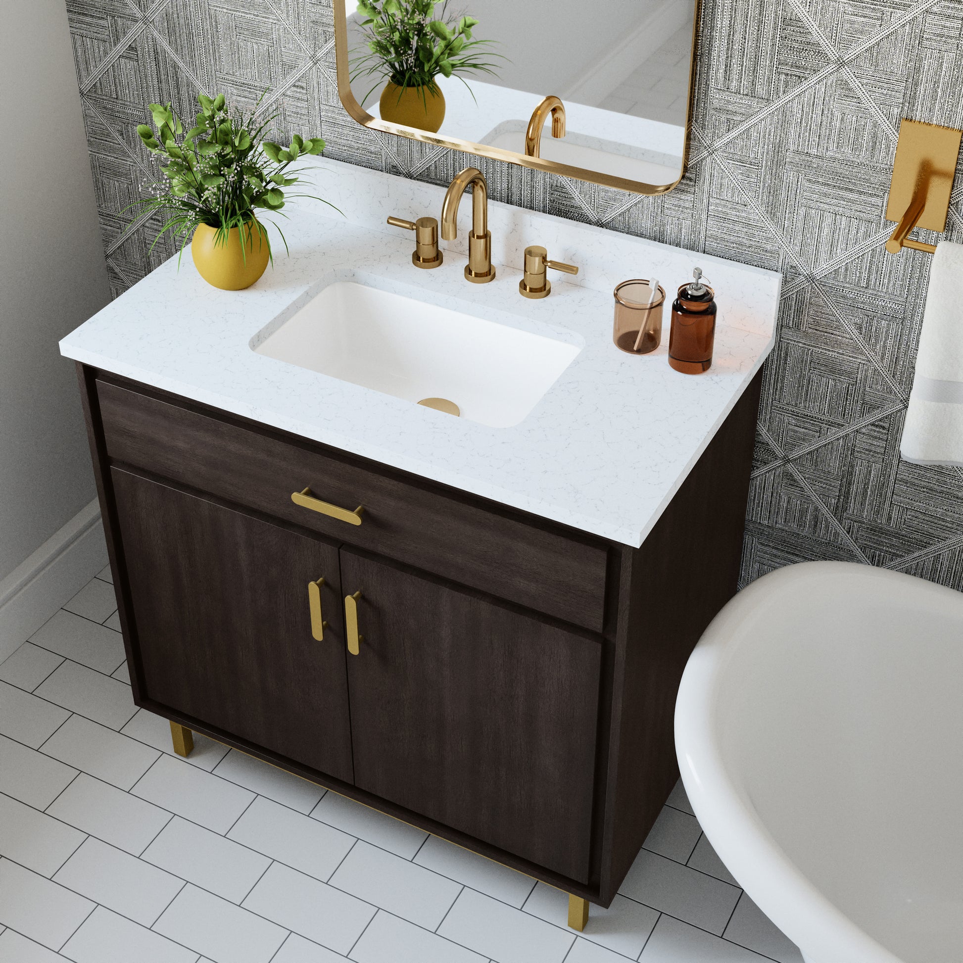 The Fletcher Collection features a contemporary design with classic styling, enhanced by a stunning espresso veneer finish. The Fletcher 36 in. vanity is perched atop a sturdy brushed gold base and showcases its quality and style with its solid wood frame, brushed gold hardware, and soft-close hinges, and offers a spacious two-door cabinet and top tilt-out storage drawer. The vanity includes a lightly grey-veined white quartz top and a white vitreous china rectangular undermount sink.