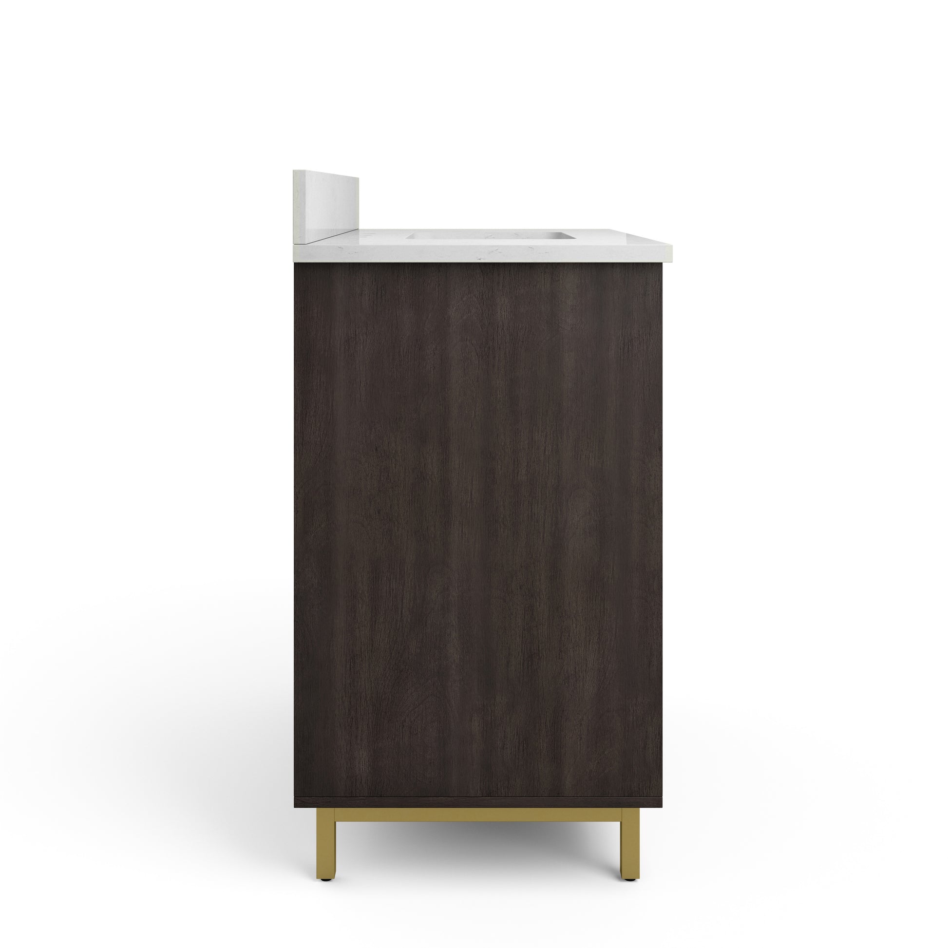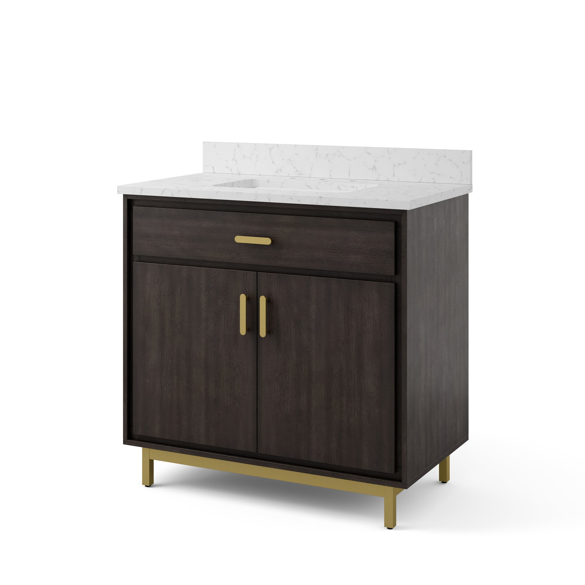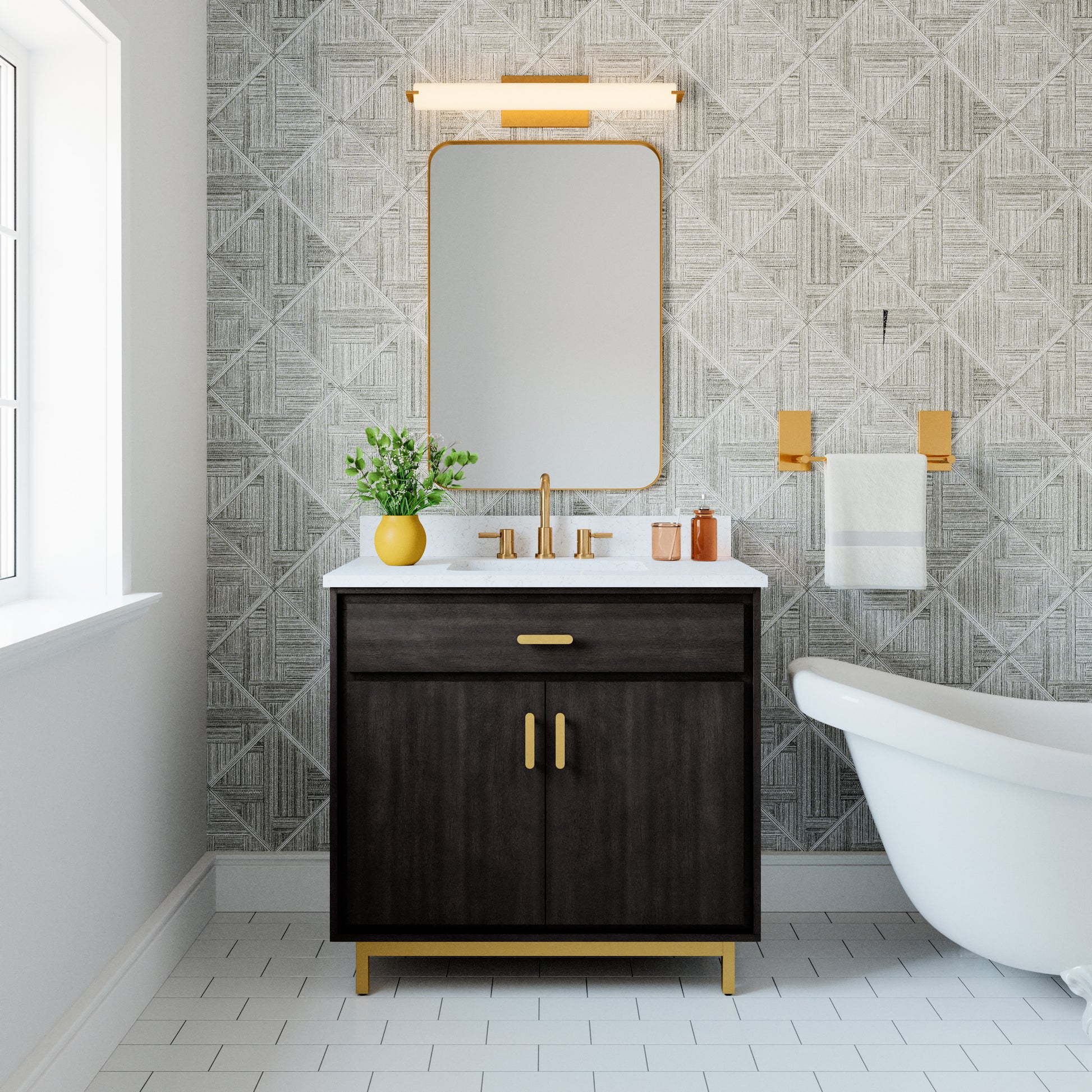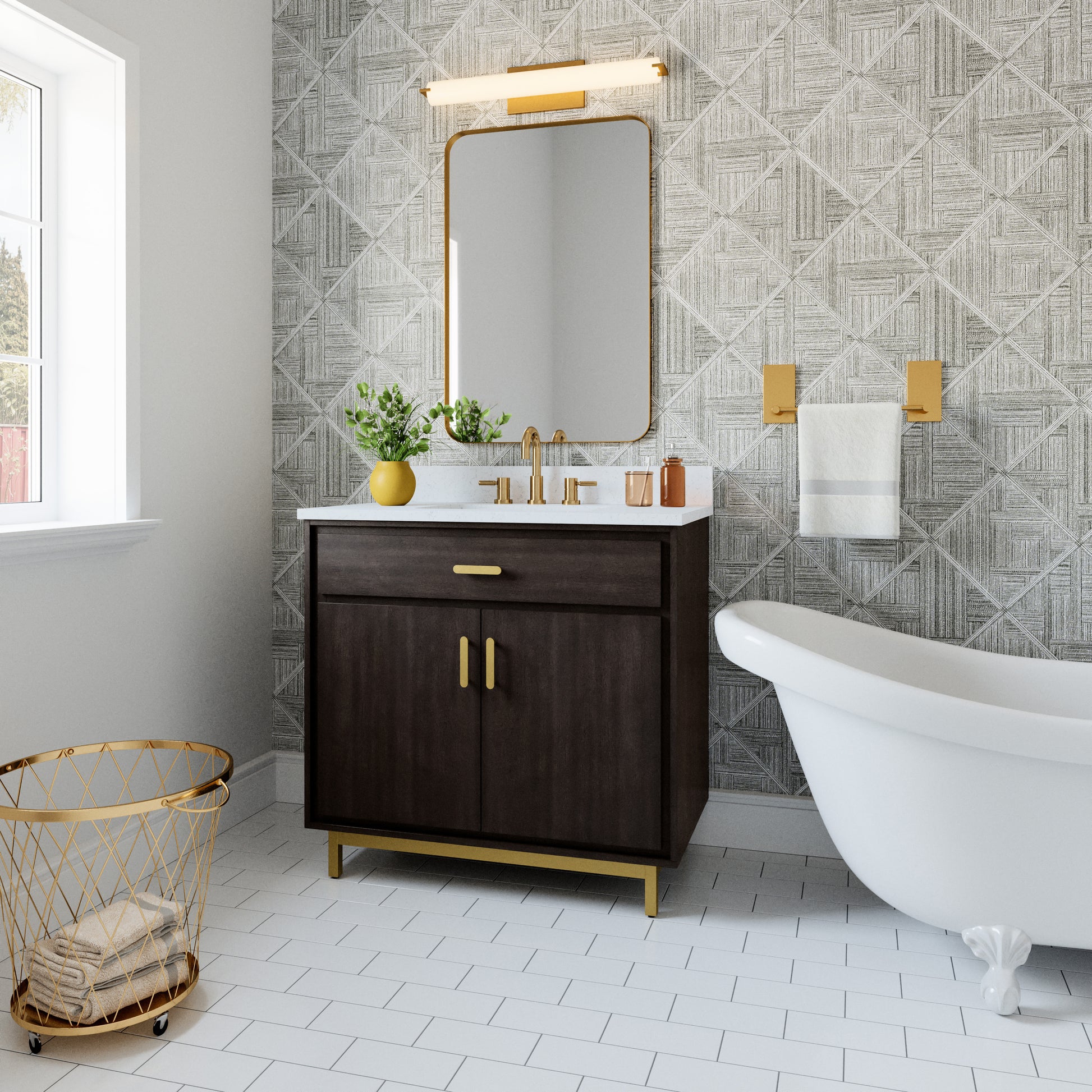 The Fletcher Collection features a contemporary design with classic styling, enhanced by a stunning espresso veneer finish. The Fletcher 36 in. vanity is perched atop a sturdy brushed gold base and showcases its quality and style with its solid wood frame, brushed gold hardware, and soft-close hinges, and offers a spacious two-door cabinet and top tilt-out storage drawer. The vanity includes a lightly grey-veined white quartz top and a white vitreous china rectangular undermount sink.