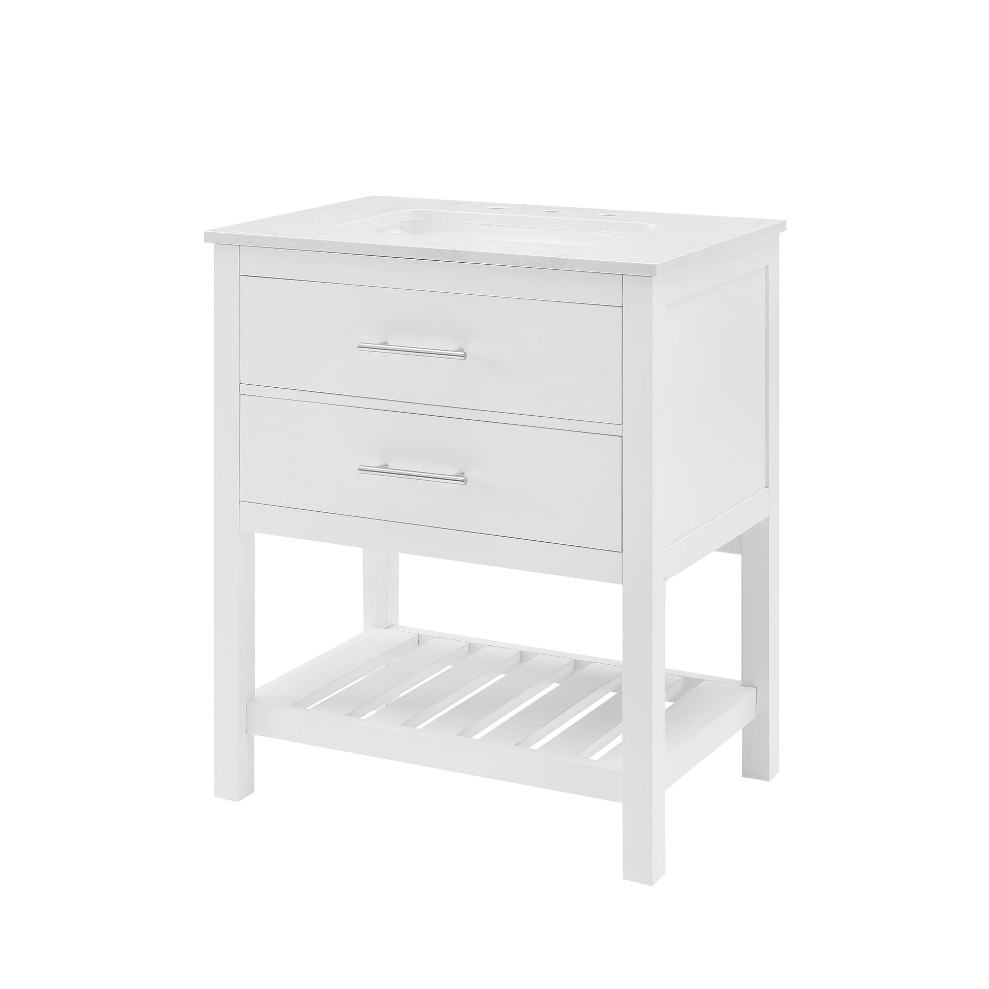 Transform your bathroom with this exquisite 30-inch vanity, a perfect blend of elegance and functionality. Crafted with a pristine white finish, this vanity exudes a timeless charm that will elevate the aesthetic of any bathroom. Brushed nickel and matte black hardware are both included so that you may switch to best suit your theme. The stunning white engineered stone top features delicate light grey veining, adding a touch of sophistication to your decor. Equipped with a white rectangular vitreous china undermount sink, soft-close hinges and glides, a convenient tilt-out drawer, and a full-extension drawer, this vanity offers ample storage space for all your bathroom essentials. The spacious open bottom shelf provides additional storage options, keeping your bathroom organized and clutter-free. Designed for convenience, the top is pre-drilled for an 8-inch widespread faucet (faucet not included) and arrives fully assembled for hassle-free installation. Experience luxury and functionality with this vanity set - the perfect centerpiece for your bathroom oasis.