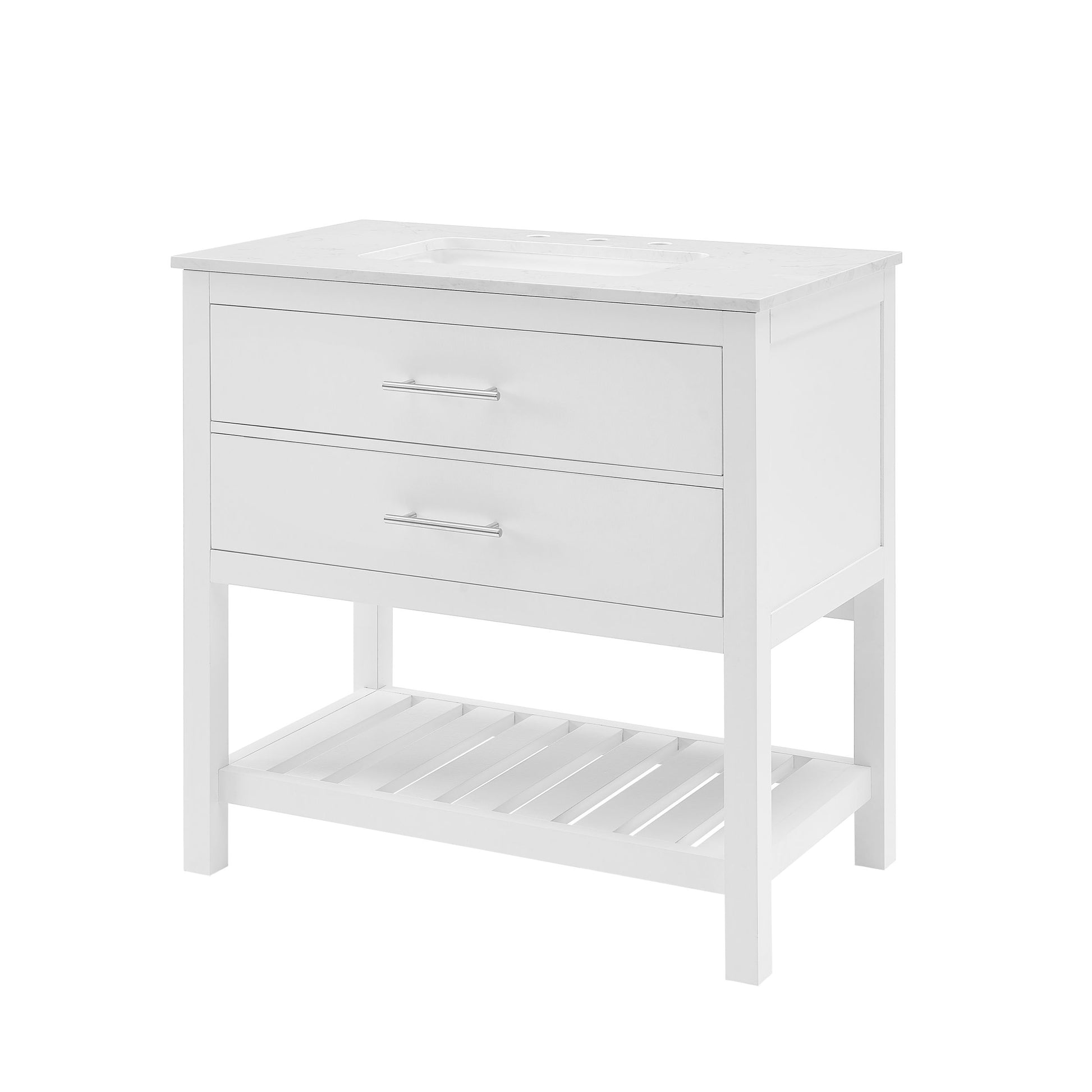 Transform your bathroom with this exquisite 36-inch vanity, a perfect blend of elegance and functionality. Crafted with a pristine white finish, this vanity exudes a timeless charm that will elevate the aesthetic of any bathroom. Brushed nickel and matte black hardware are both included so that you may switch to best suit your theme. The stunning white engineered stone top features delicate light grey veining, adding a touch of sophistication to your decor. Equipped with a white rectangular vitreous china undermount sink, soft-close hinges and glides, a convenient tilt-out drawer, and a full-extension drawer, this vanity offers ample storage space for all your bathroom essentials. The spacious open bottom shelf provides additional storage options, keeping your bathroom organized and clutter-free. Designed for convenience, the top is pre-drilled for an 8-inch widespread faucet (faucet not included) and arrives fully assembled for hassle-free installation. Experience luxury and functionality with this vanity set - the perfect centerpiece for your bathroom oasis.