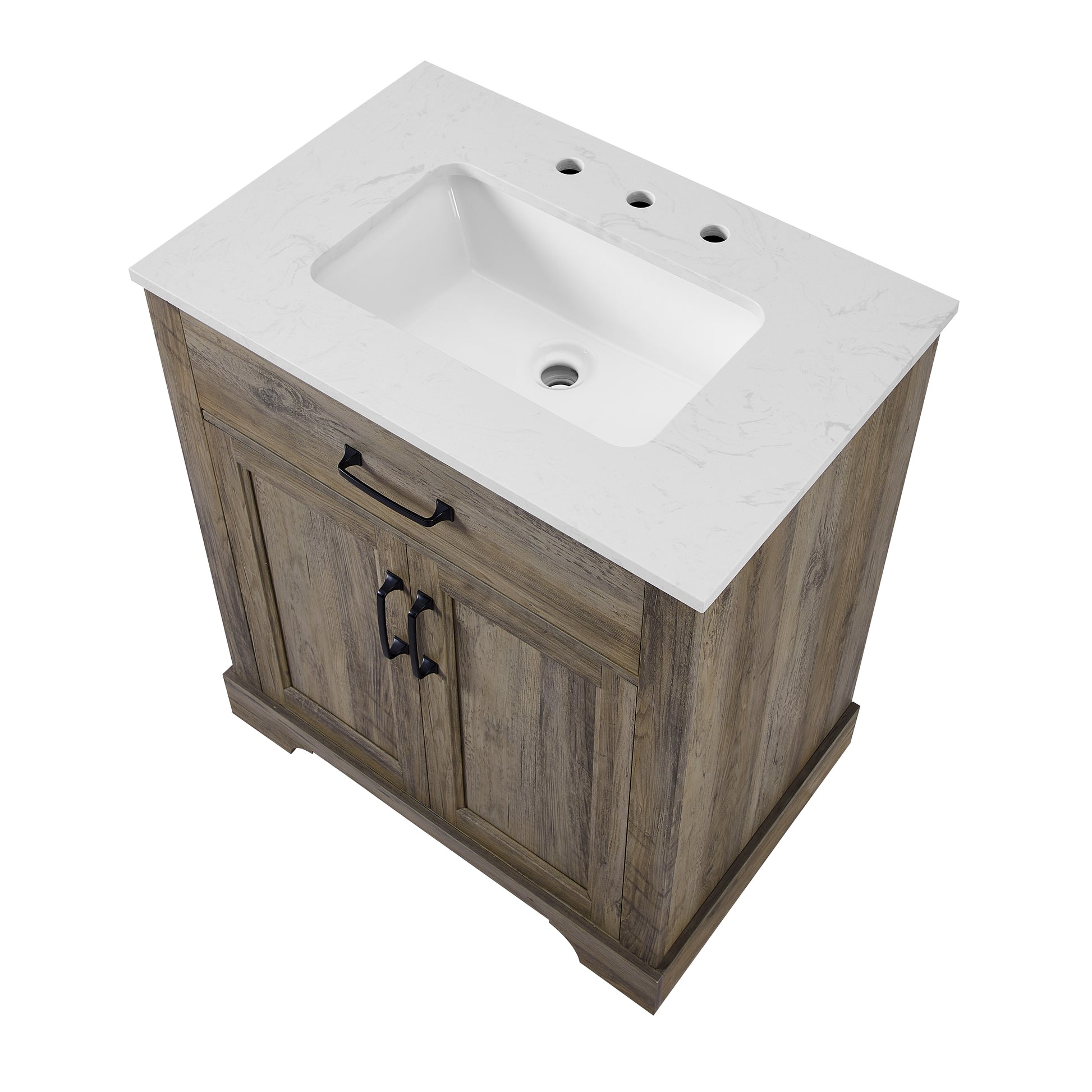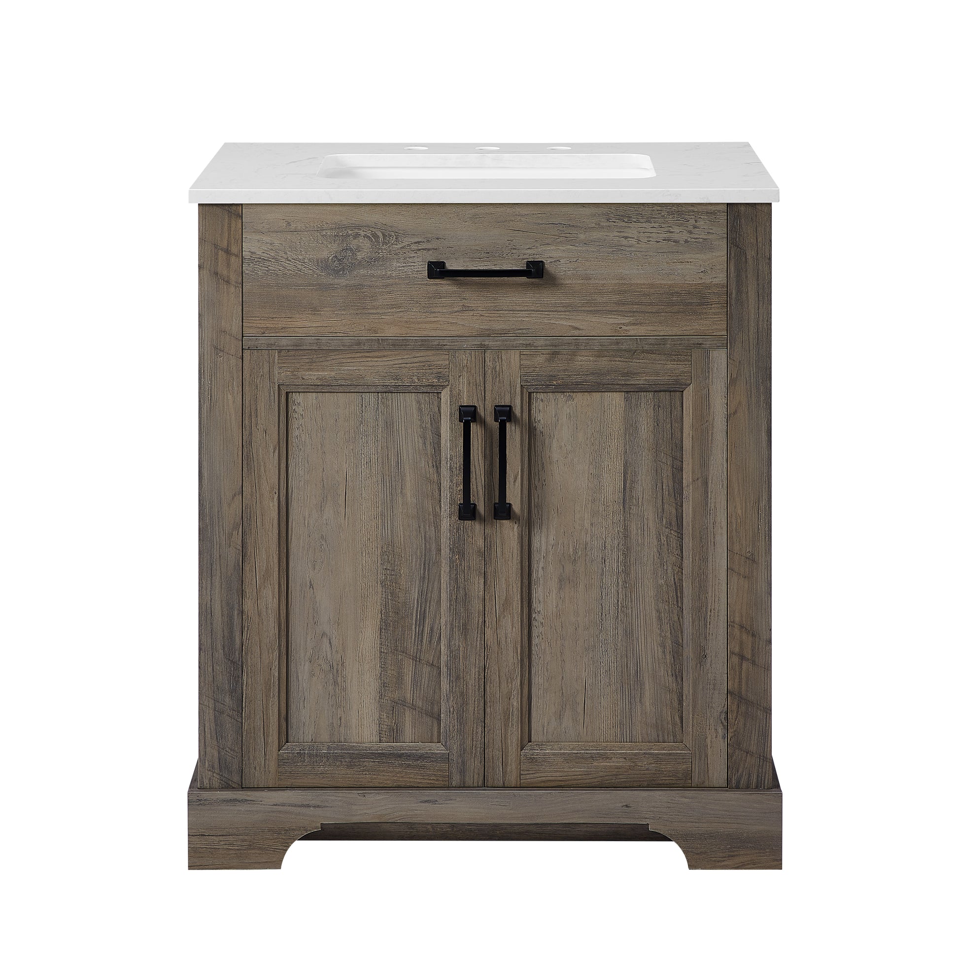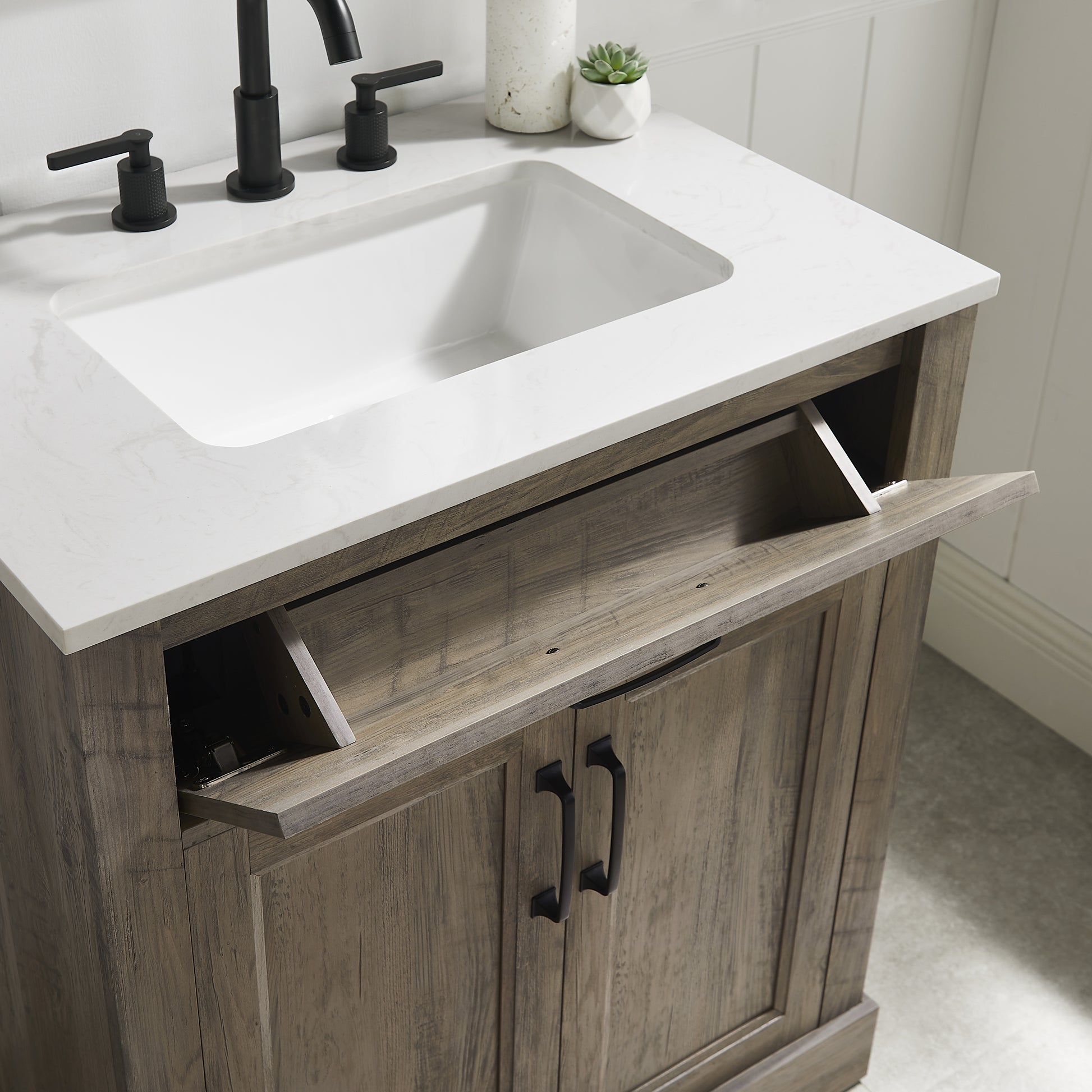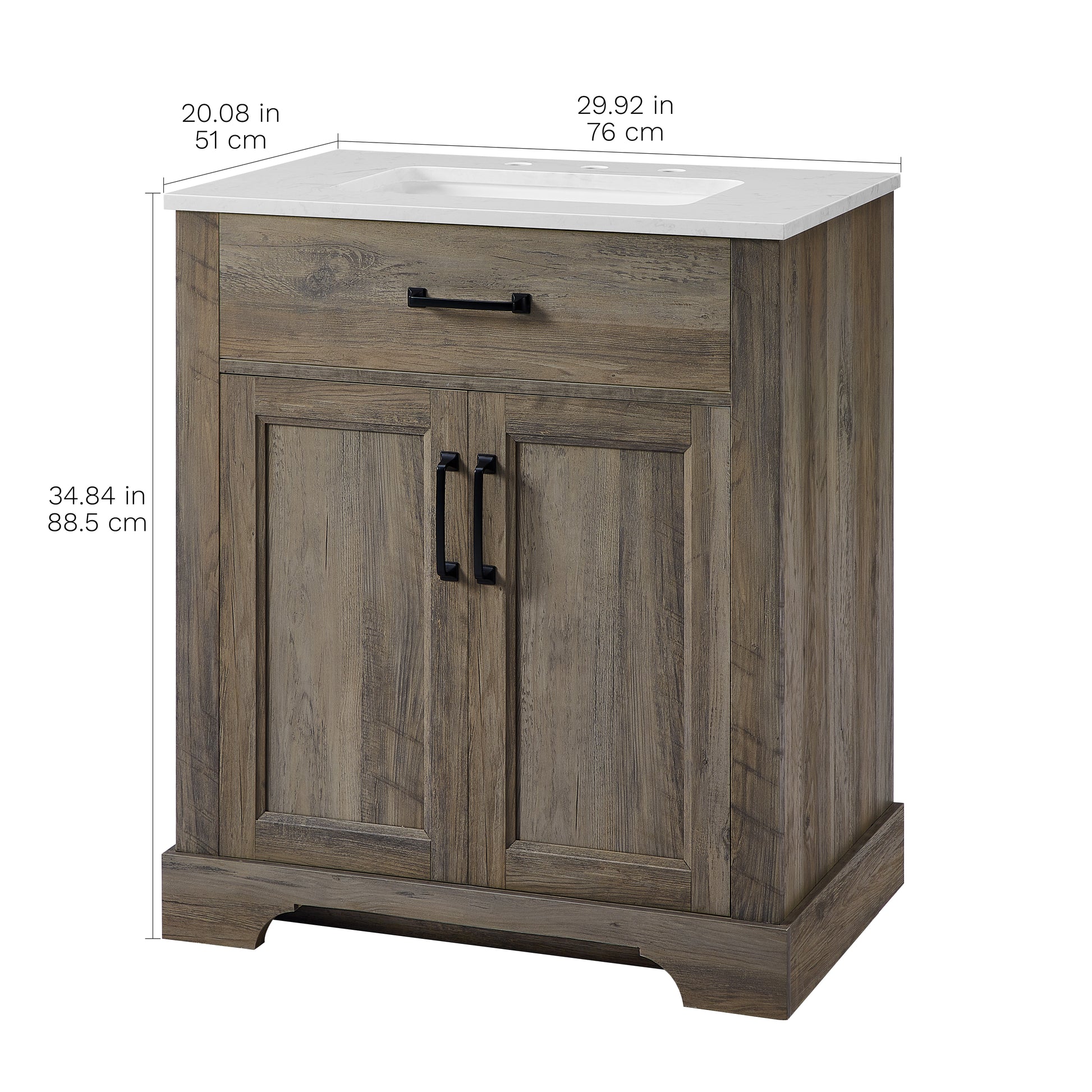 Immerse yourself in the timeless allure of this vanity collection, a rustic masterpiece that exudes elegance and charm. The 30-inch vanity, cloaked in a rustic brown-grey oak finish, beckons with its understated beauty and warmth. Adorned with a lightly grey-veined white engineered stone top and a white vitreous china undermount sink, this fully assembled vanity radiates sophistication. Every detail speaks of luxury, from the slow-close hinges to the black hardware that adds a touch of refinement. With a practical top tilt-out drawer and a spacious double-door cabinet with an adjustable shelf, this vanity blends functionality with exquisite design. The countertop is pre-drilled for an 8-inch widespread faucet (faucet not included), making installation easy. Let this vanity set grace your sanctuary, where every morning ritual becomes a romantic ode to indulgence.