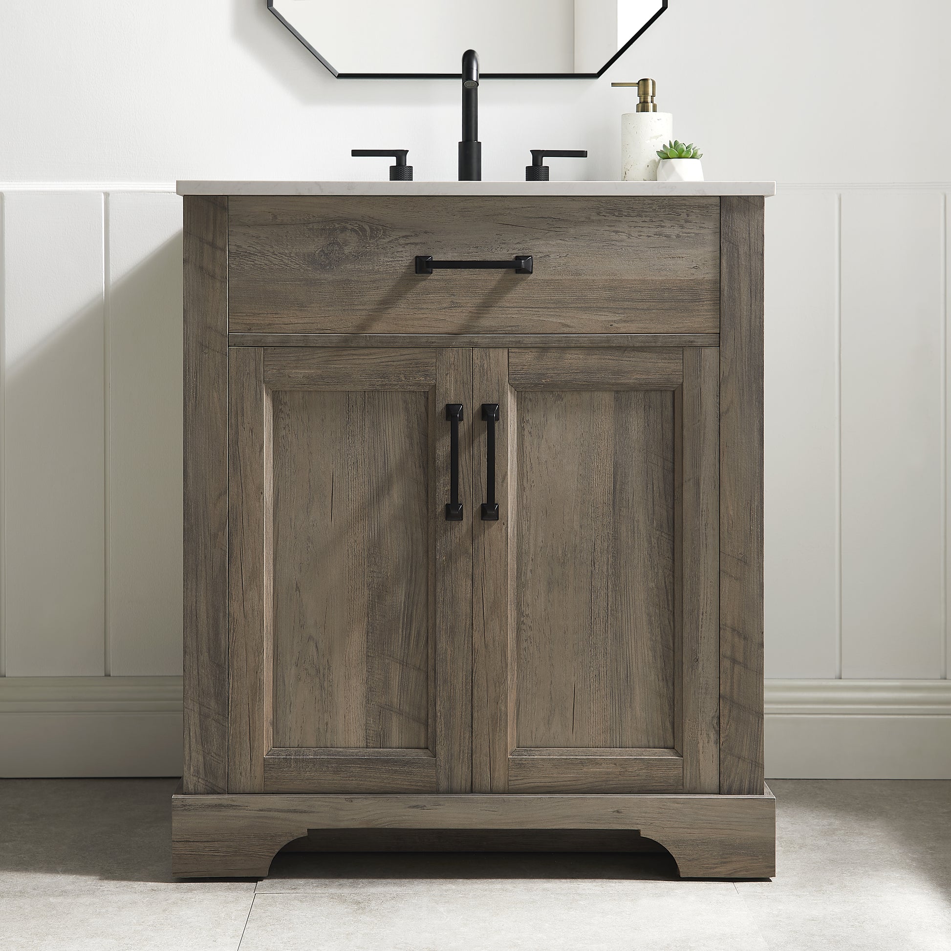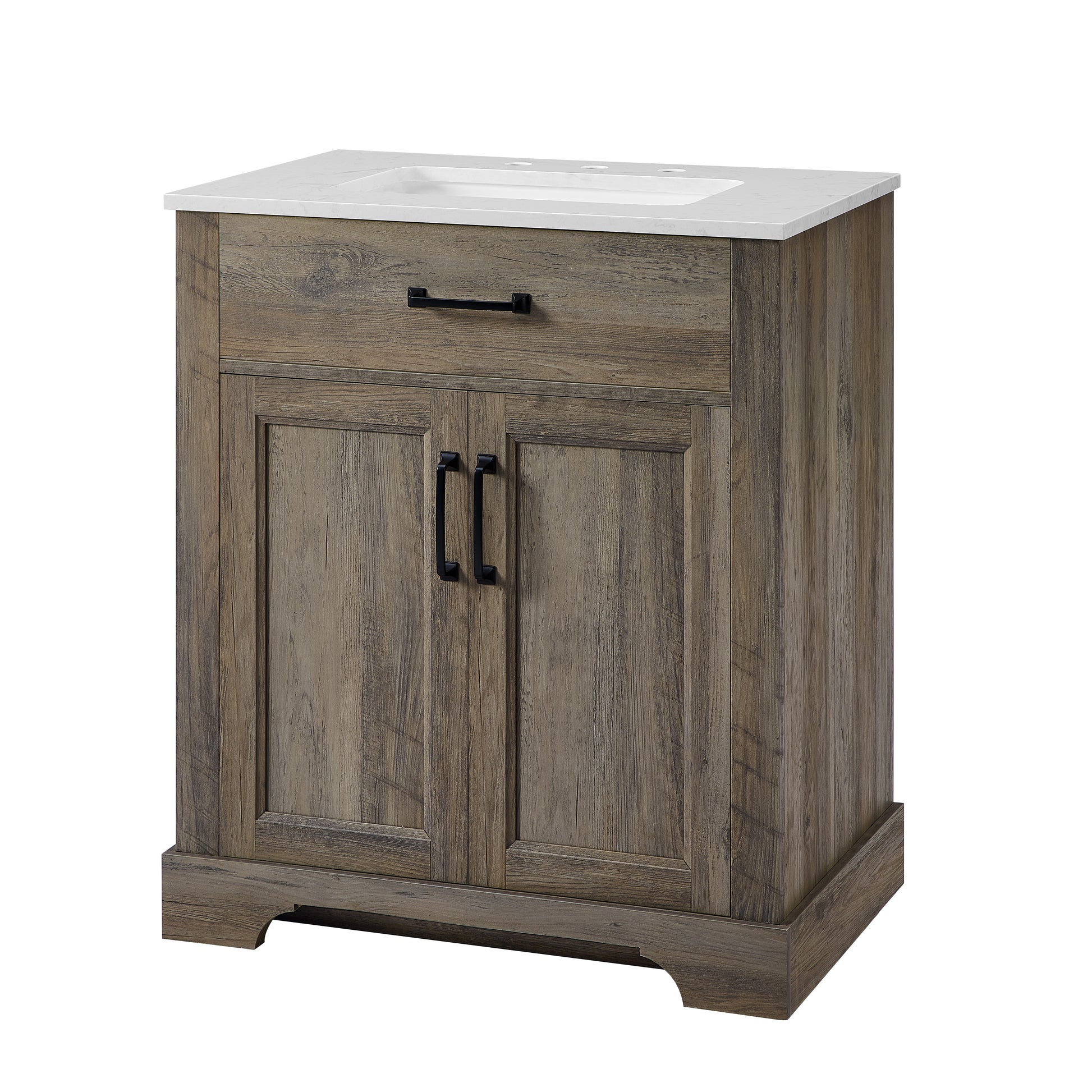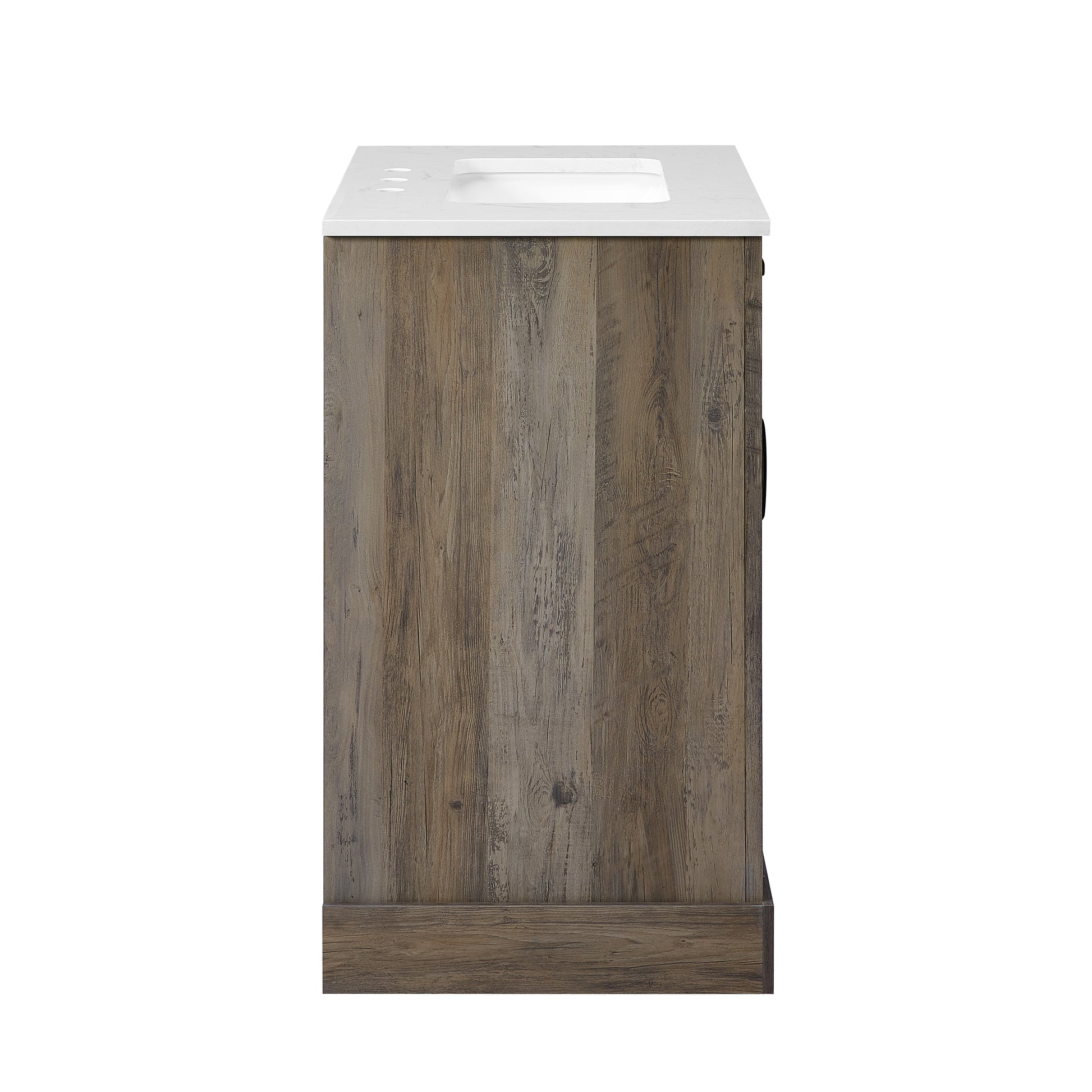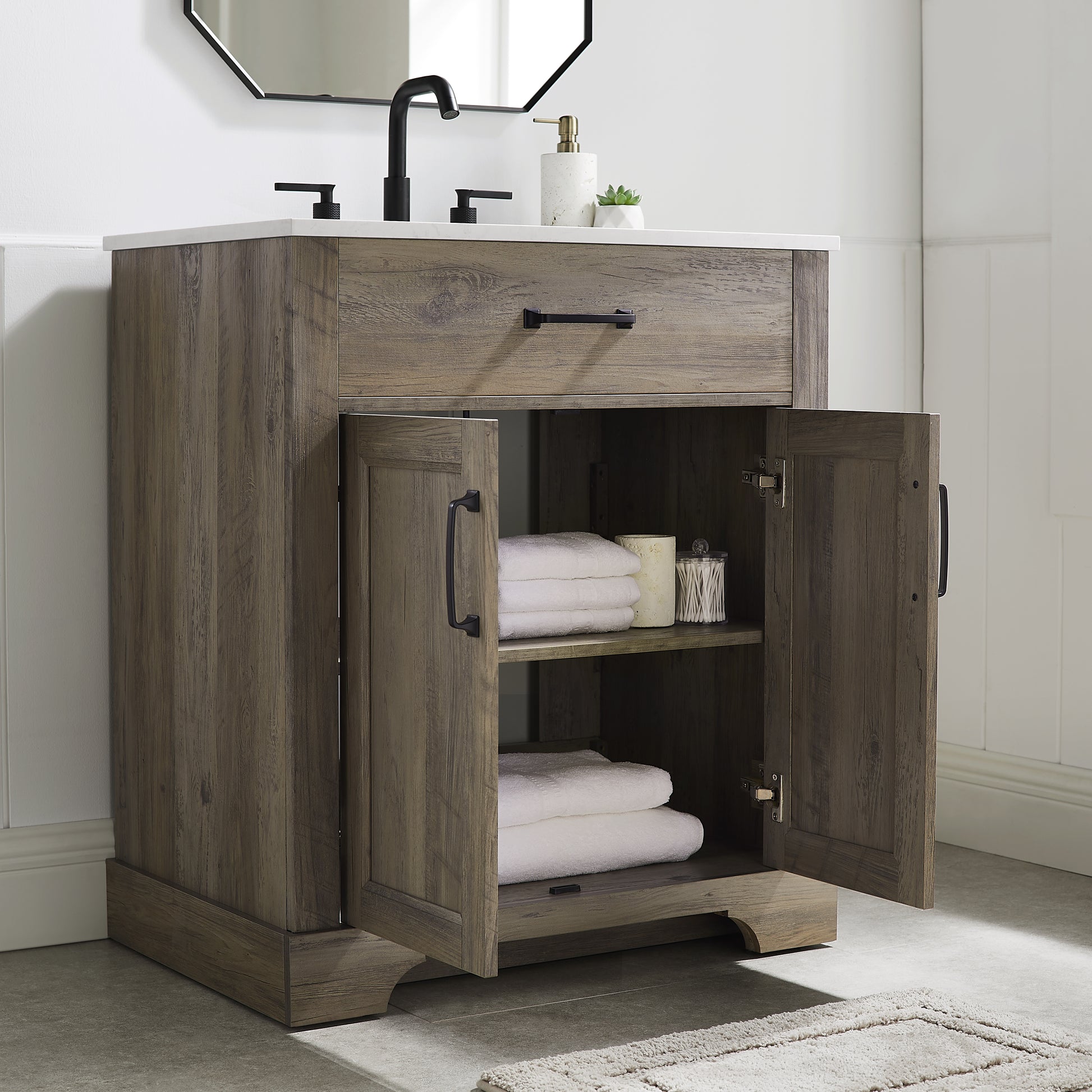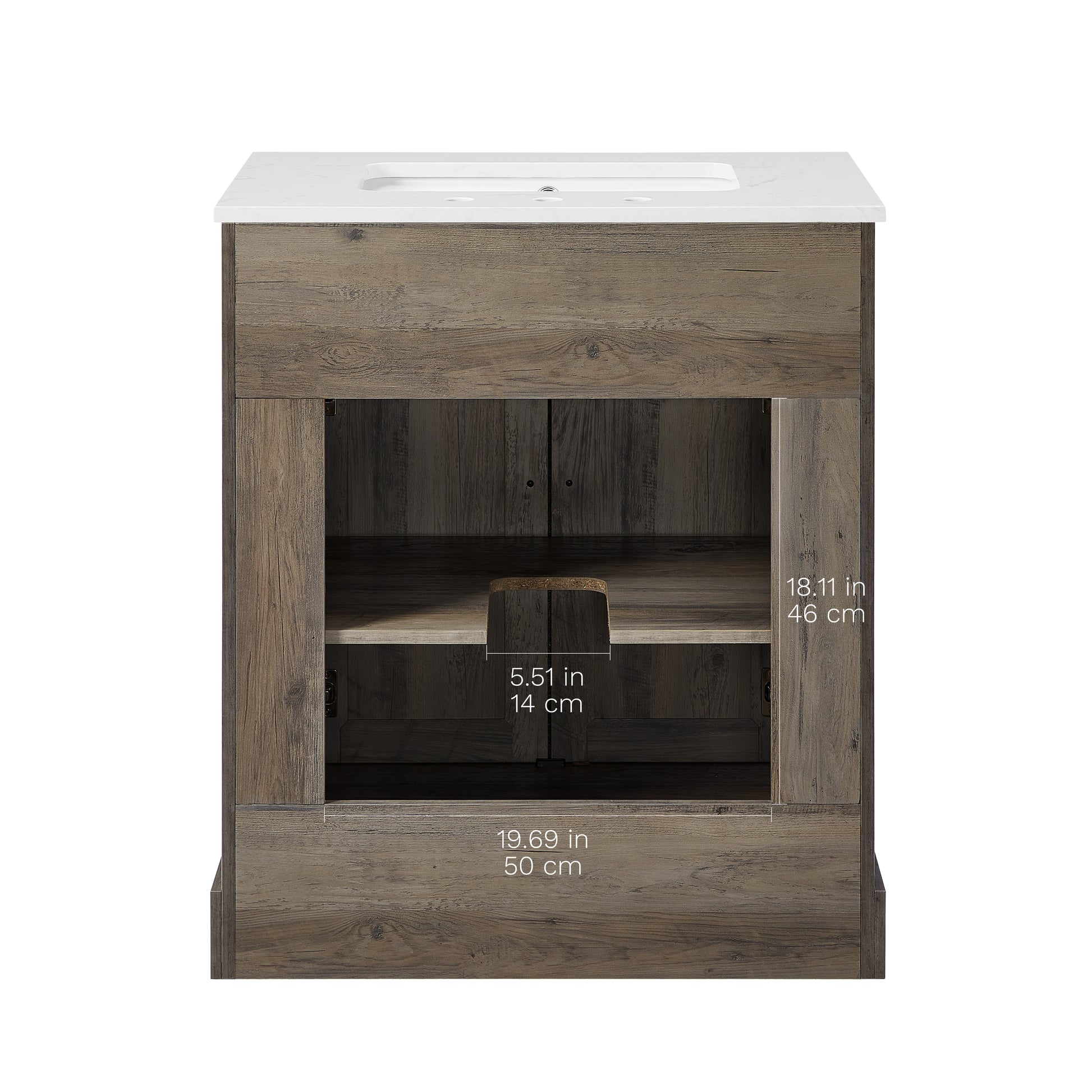 Immerse yourself in the timeless allure of this vanity collection, a rustic masterpiece that exudes elegance and charm. The 30-inch vanity, cloaked in a rustic brown-grey oak finish, beckons with its understated beauty and warmth. Adorned with a lightly grey-veined white engineered stone top and a white vitreous china undermount sink, this fully assembled vanity radiates sophistication. Every detail speaks of luxury, from the slow-close hinges to the black hardware that adds a touch of refinement. With a practical top tilt-out drawer and a spacious double-door cabinet with an adjustable shelf, this vanity blends functionality with exquisite design. The countertop is pre-drilled for an 8-inch widespread faucet (faucet not included), making installation easy. Let this vanity set grace your sanctuary, where every morning ritual becomes a romantic ode to indulgence.