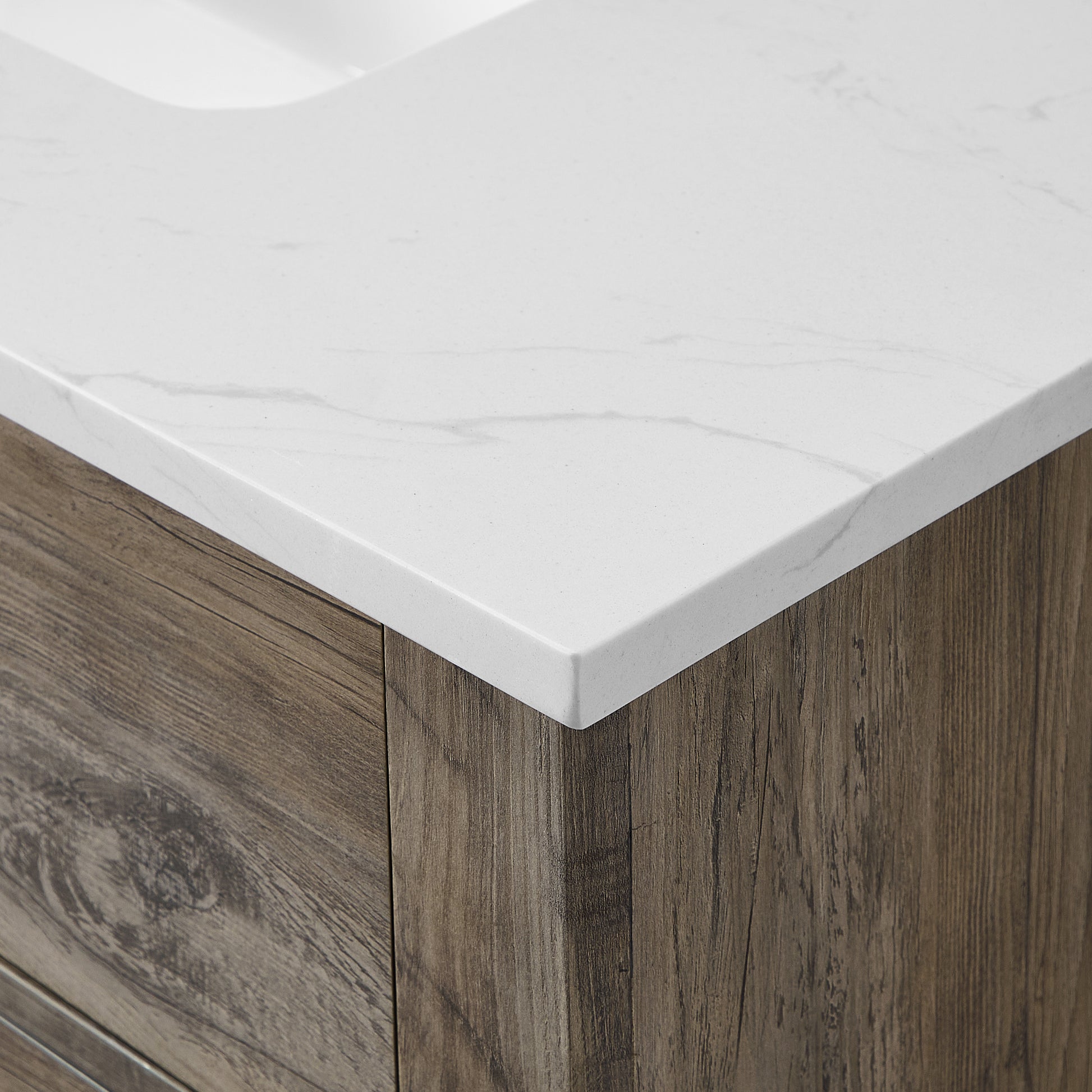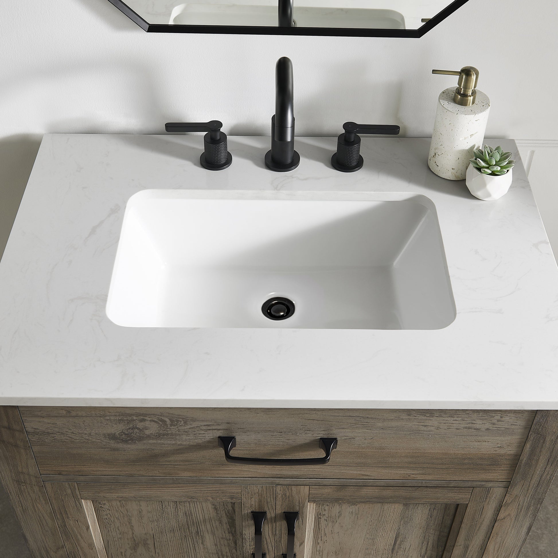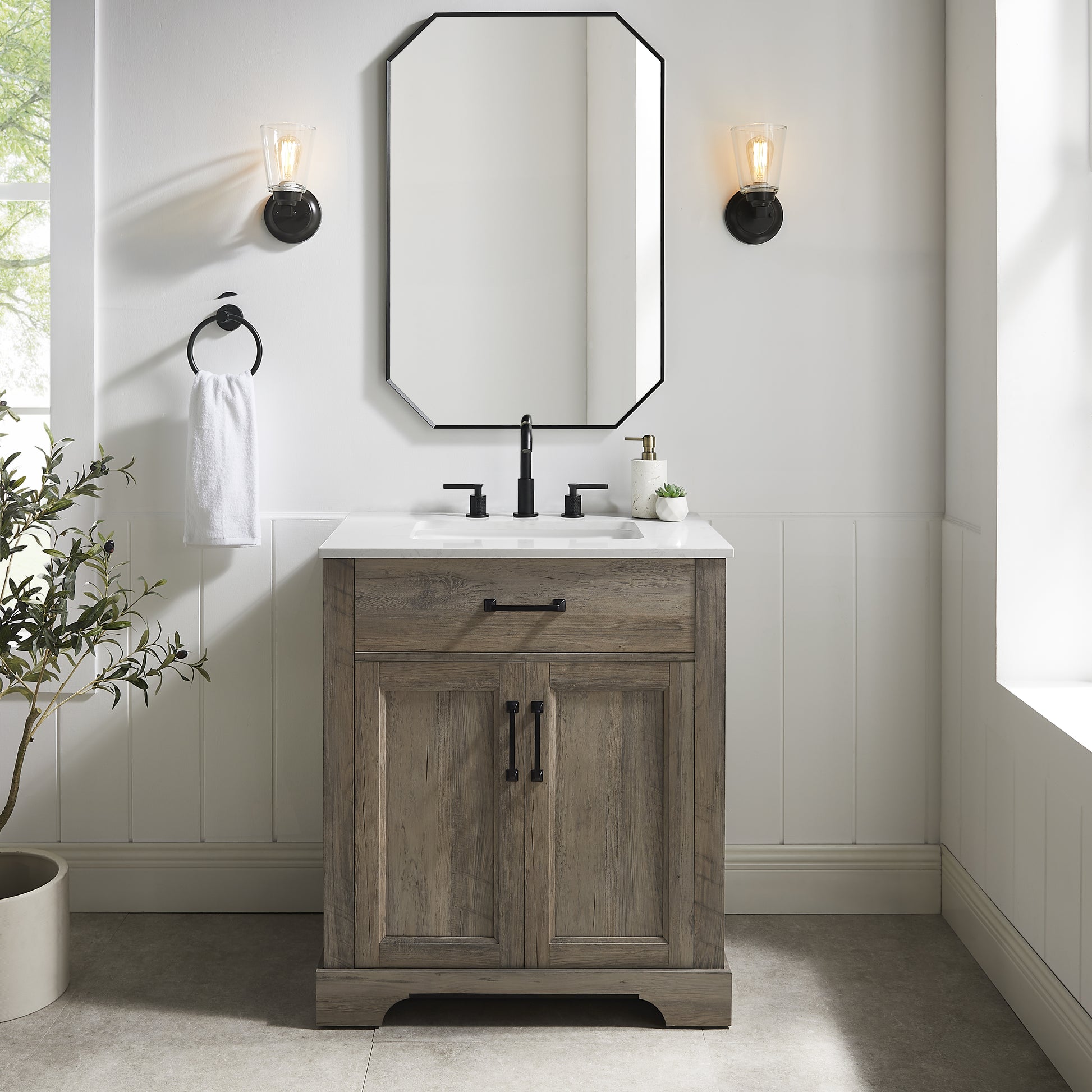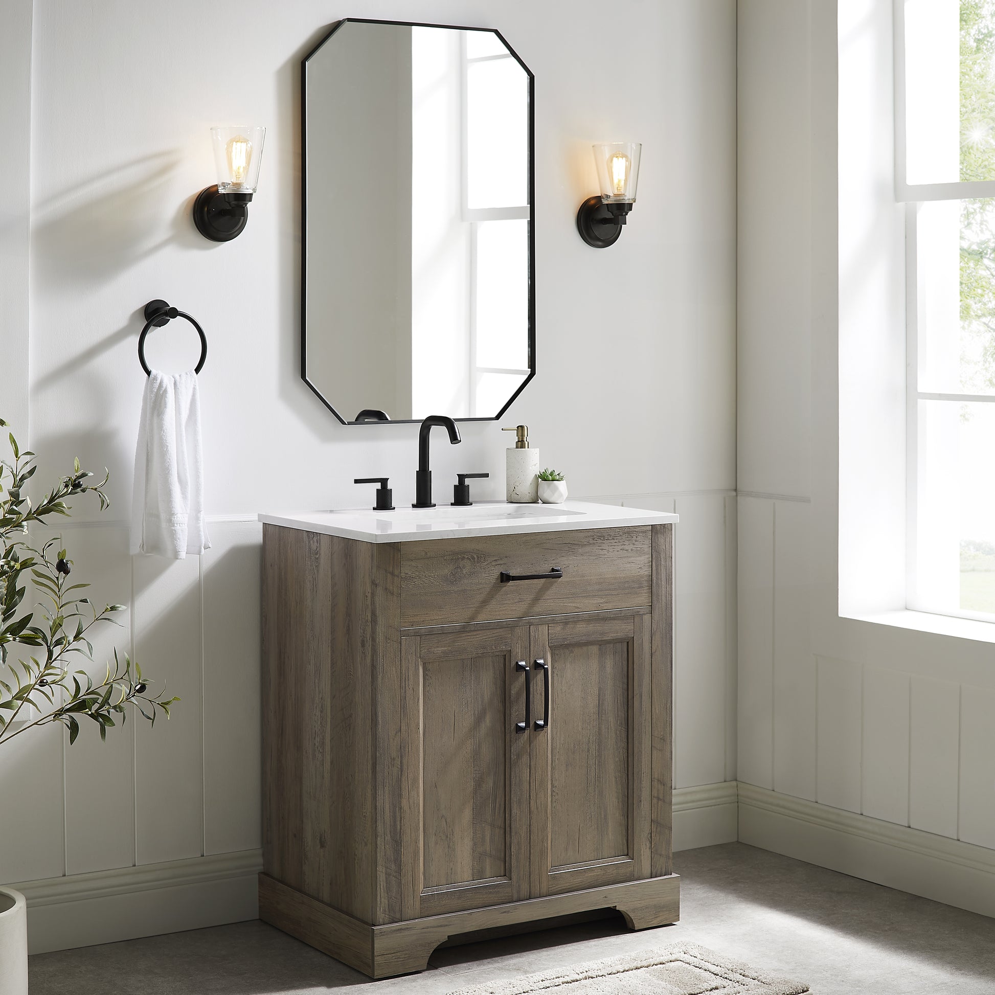 Immerse yourself in the timeless allure of this vanity collection, a rustic masterpiece that exudes elegance and charm. The 30-inch vanity, cloaked in a rustic brown-grey oak finish, beckons with its understated beauty and warmth. Adorned with a lightly grey-veined white engineered stone top and a white vitreous china undermount sink, this fully assembled vanity radiates sophistication. Every detail speaks of luxury, from the slow-close hinges to the black hardware that adds a touch of refinement. With a practical top tilt-out drawer and a spacious double-door cabinet with an adjustable shelf, this vanity blends functionality with exquisite design. The countertop is pre-drilled for an 8-inch widespread faucet (faucet not included), making installation easy. Let this vanity set grace your sanctuary, where every morning ritual becomes a romantic ode to indulgence.