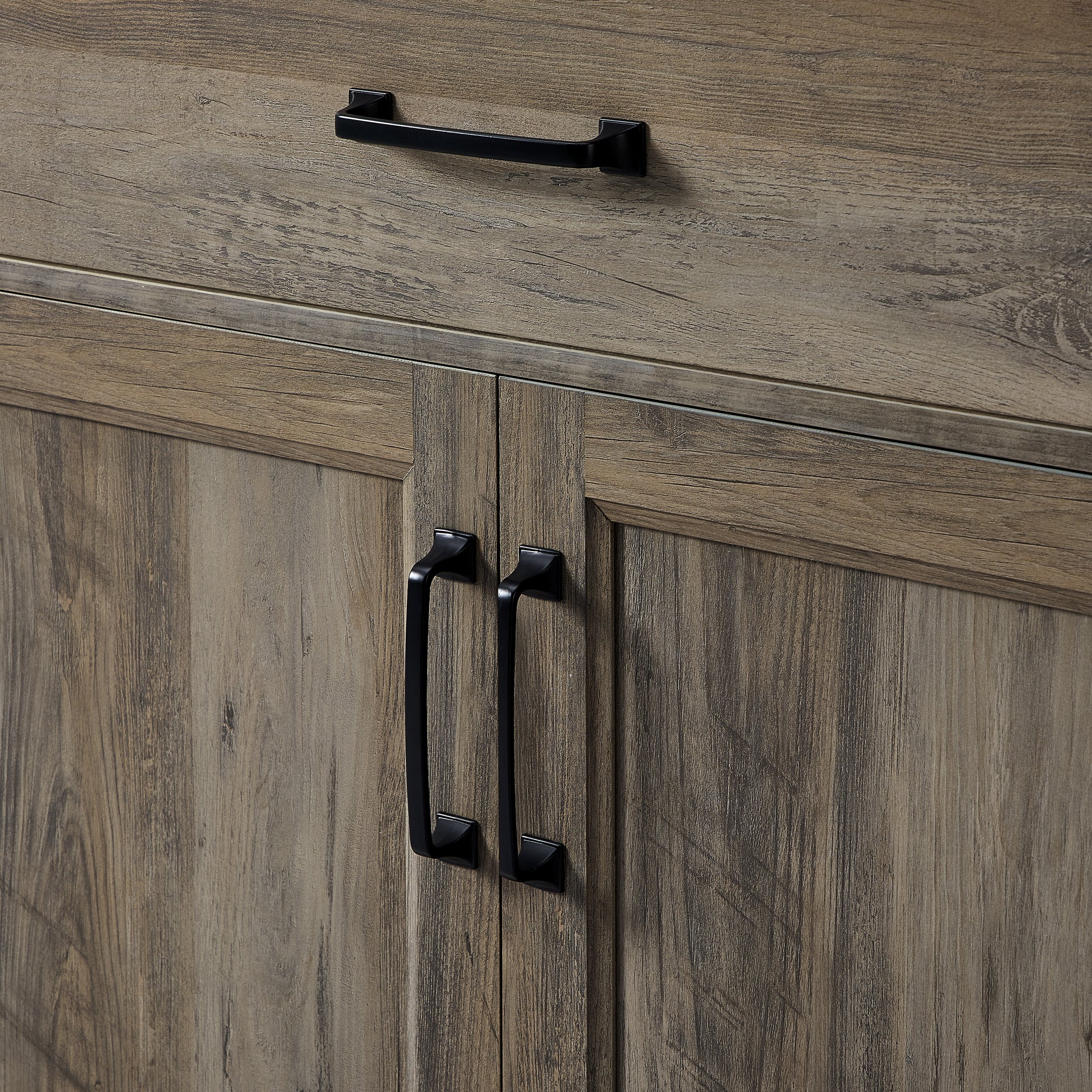 - Rustic brown-grey oak finish and black hardware exude timeless elegance