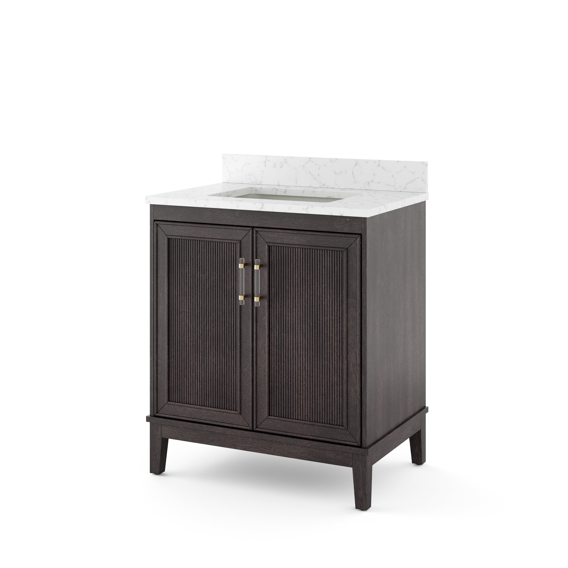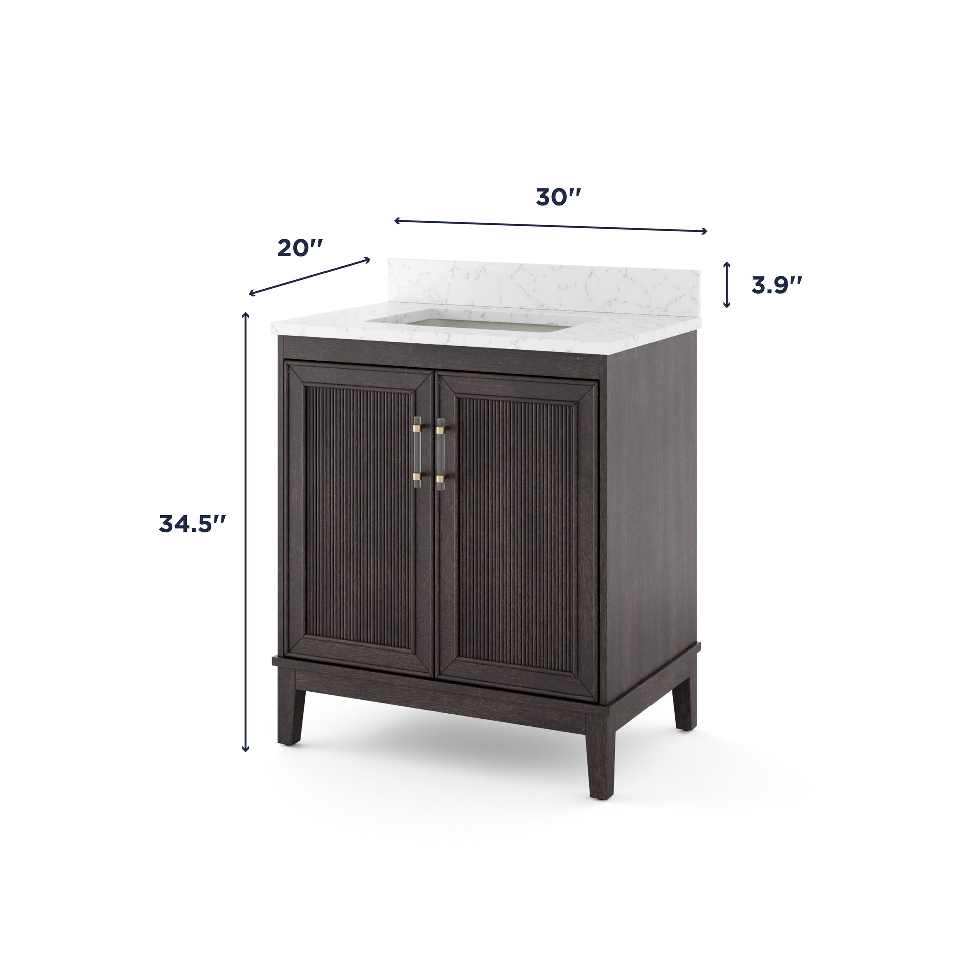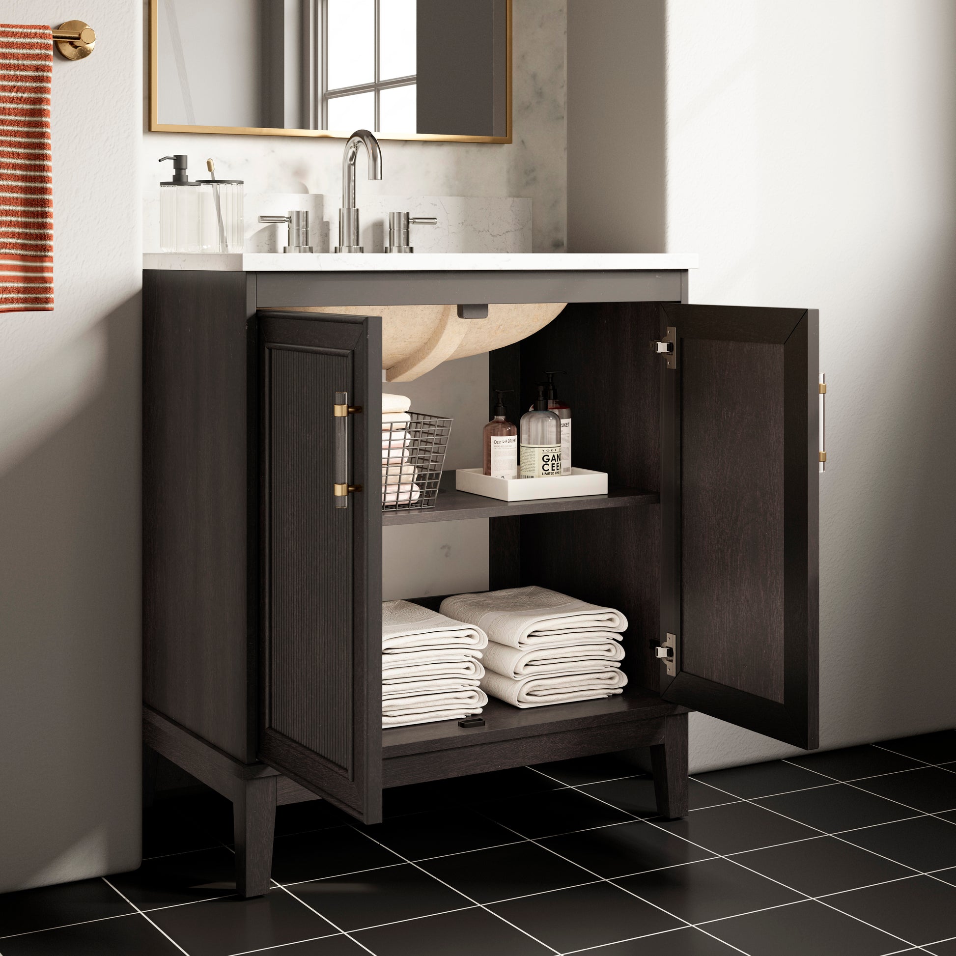 Update your bath or powder room with the Oberman 30-inch Single Sink Bathroom Vanity. Featuring a traditional design with sophisticated modern updates, this vanity is enhanced by a beautiful black cherry finish with subtle fluted door accents. The vanity is constructed of solid poplar wood and showcases its quality and elegance with crystal-style cabinet pulls with gold accents and soft-close hinges. This vanity offers plenty of storage with a spacious two-door cabinet with an adjustable shelf. The quality, easy-care quartz top is predrilled for an 8-inch wideset faucet and includes a vitreous china undermount sink. The open vanity back makes plumbing hook-up easy. The Black Cherry Oberman Vanity Collection is available in 30, 36, 48, and 60-inch widths.