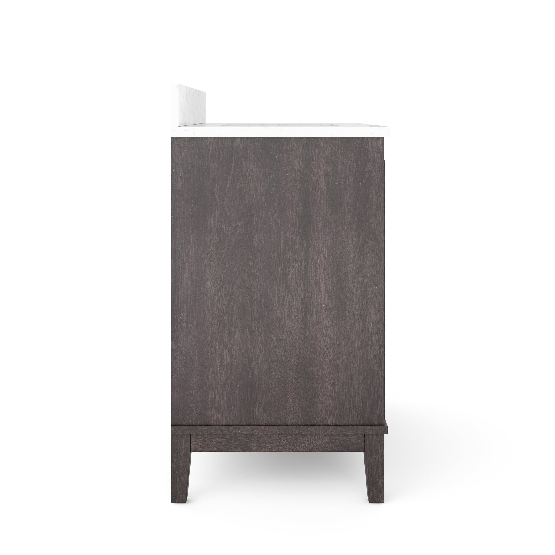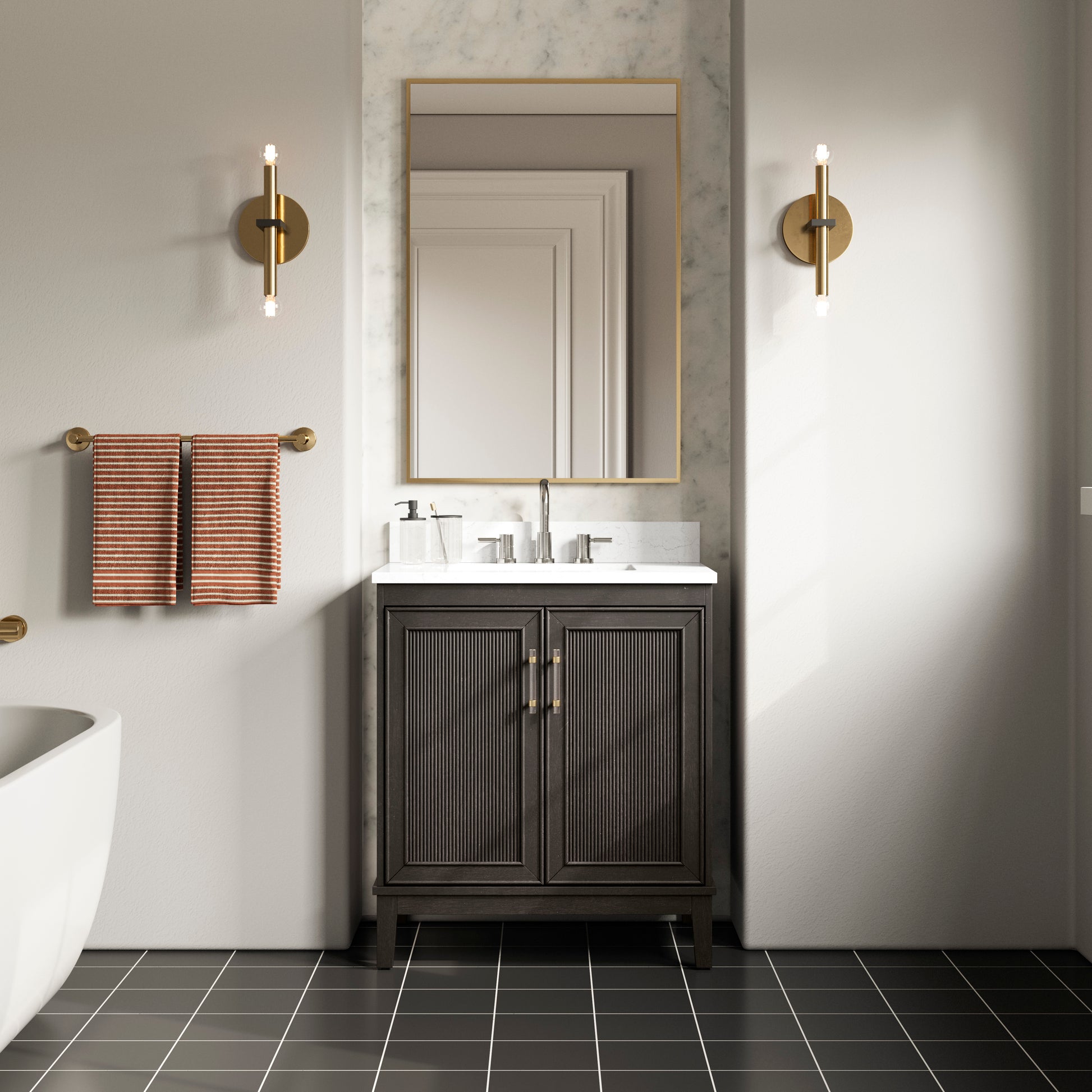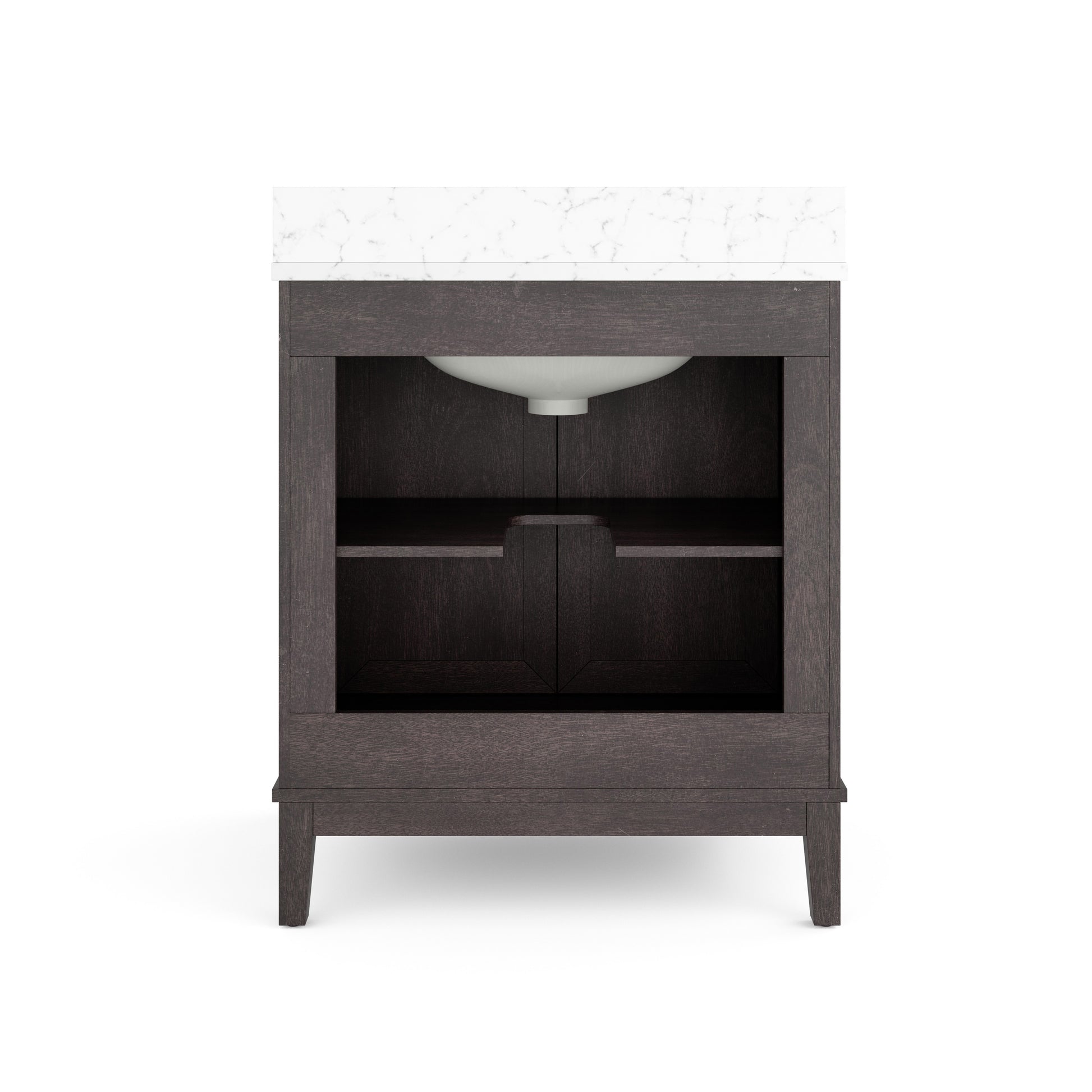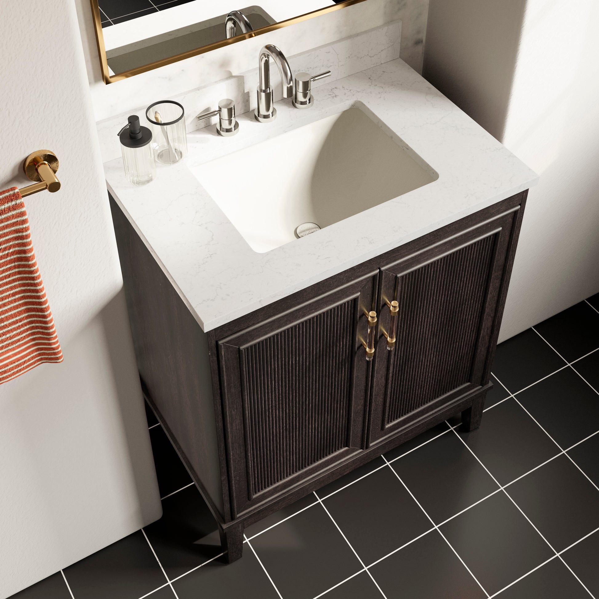 Update your bath or powder room with the Oberman 30-inch Single Sink Bathroom Vanity. Featuring a traditional design with sophisticated modern updates, this vanity is enhanced by a beautiful black cherry finish with subtle fluted door accents. The vanity is constructed of solid poplar wood and showcases its quality and elegance with crystal-style cabinet pulls with gold accents and soft-close hinges. This vanity offers plenty of storage with a spacious two-door cabinet with an adjustable shelf. The quality, easy-care quartz top is predrilled for an 8-inch wideset faucet and includes a vitreous china undermount sink. The open vanity back makes plumbing hook-up easy. The Black Cherry Oberman Vanity Collection is available in 30, 36, 48, and 60-inch widths.