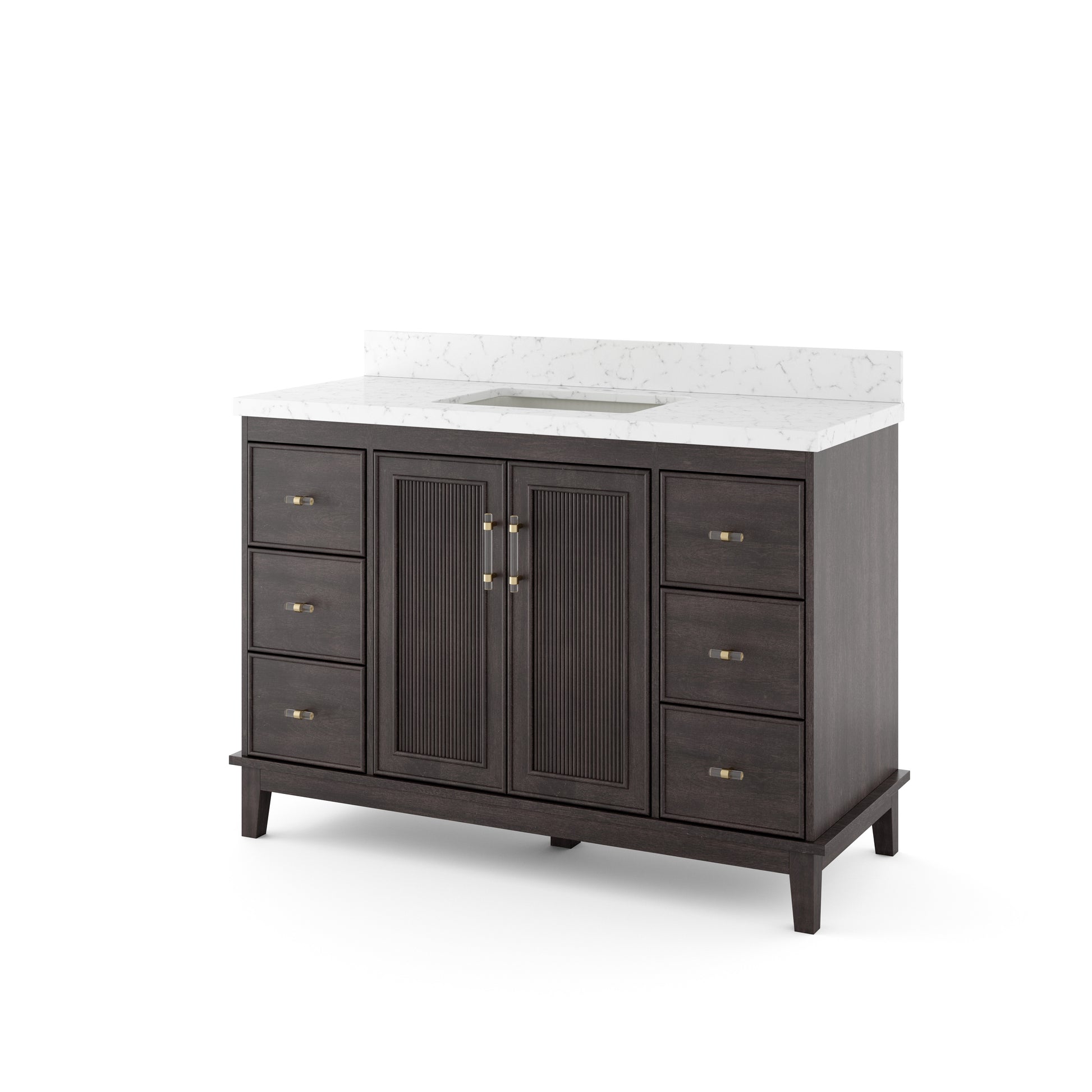 Transform your bathroom with the Oberman 48-inch Single Sink Bathroom Vanity. Featuring a black cherry finish, fluted door accents, and crystal-style pulls with gold details, it blends traditional and modern elegance. Made from solid poplar wood, it includes six drawers, a two-door cabinet with an adjustable shelf, and soft-close hardware. The quartz countertop, predrilled for an 8-inch wideset faucet, includes a durable vitreous china undermount sink. An open back ensures easy plumbing hook-up. Available in 30, 36, 48 and 60-inch widths, this vanity collection fits any space with style and practicality.