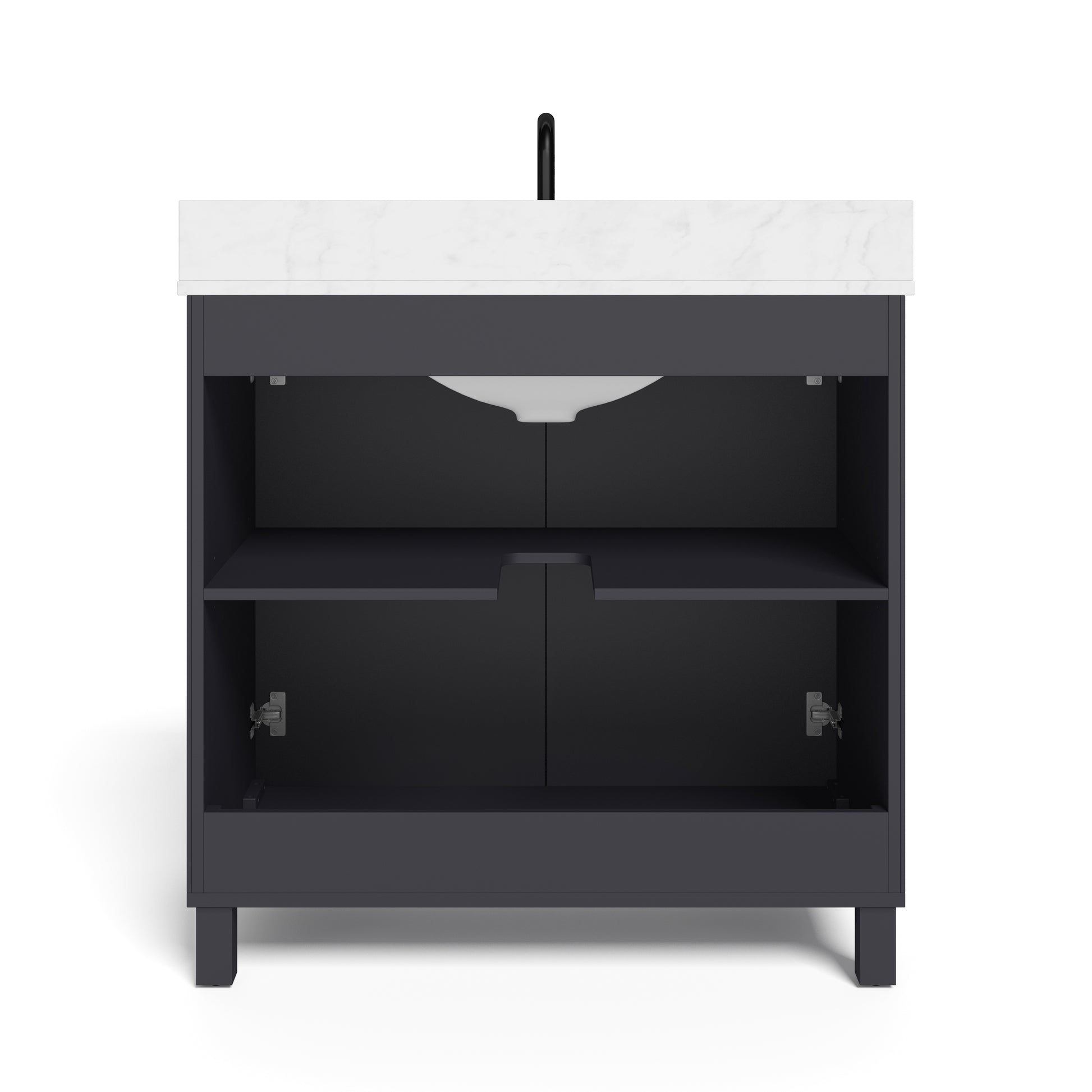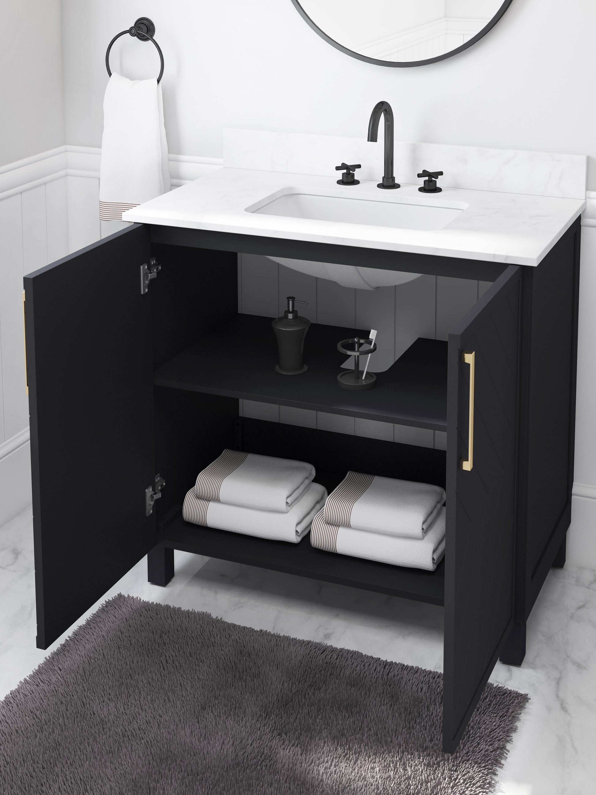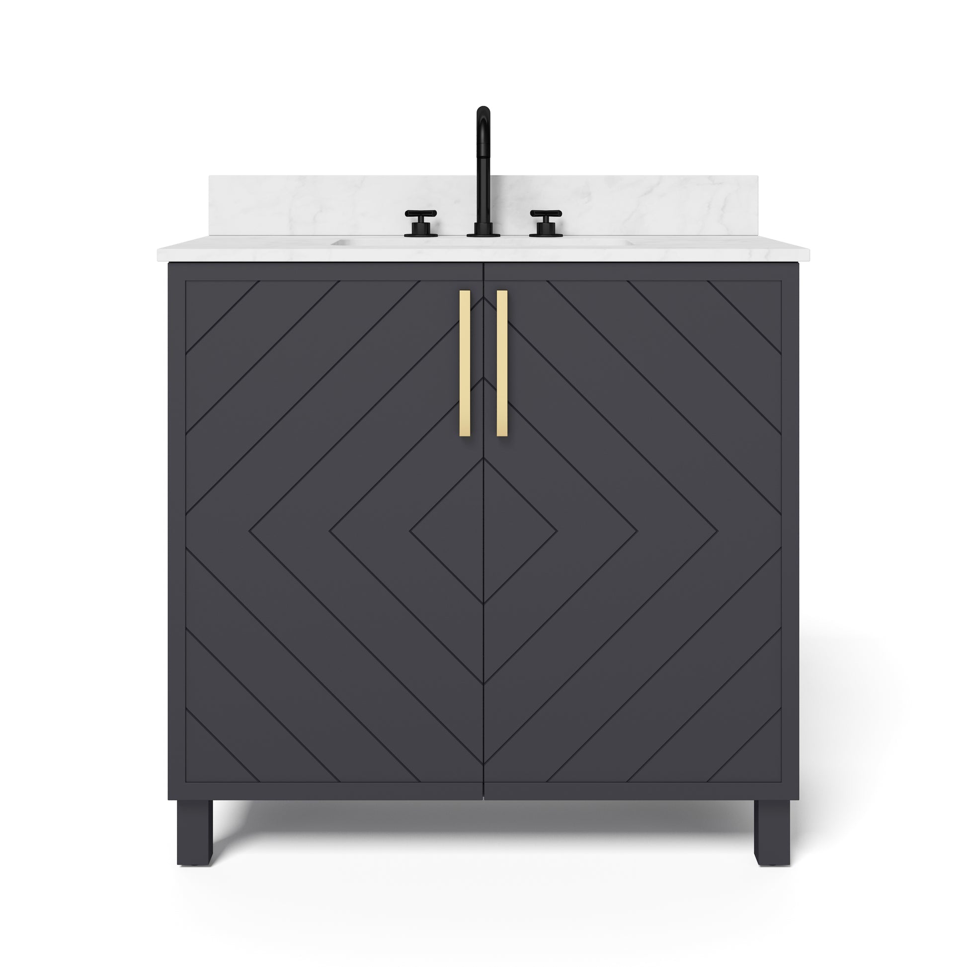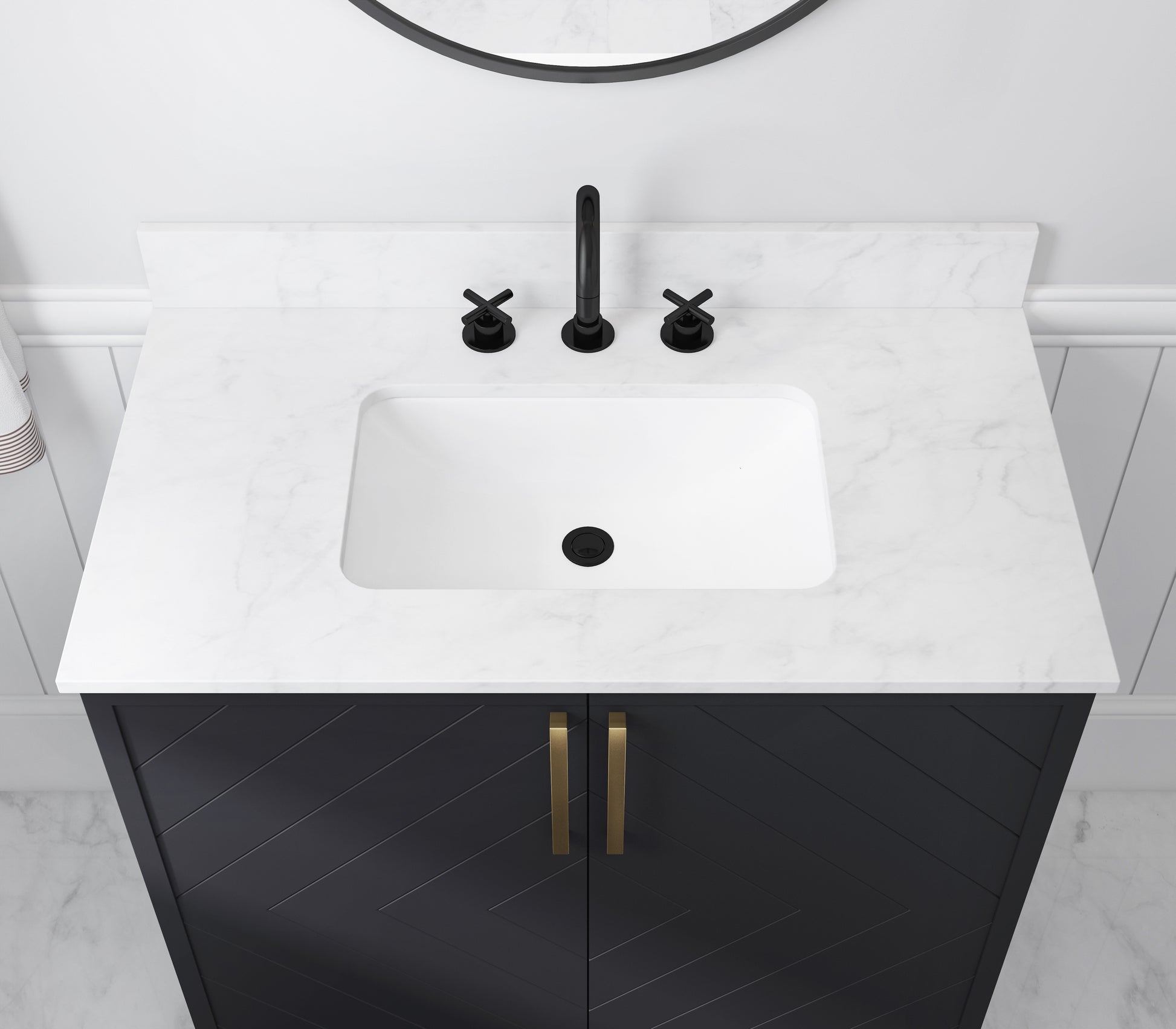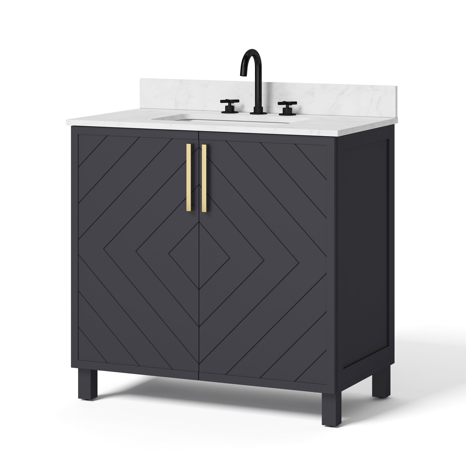 The Roundstone Collection features a traditional design enhanced by a premium deep midnight blue finish. This 36-inch vanity showcases its quality and style with solid frame, brushed gold hardware, and soft-close hinges. A diagonal scoring design in the cabinet doors creates a gorgeous chevron pattern. The vanity includes an engineered white stone top with light grey veining and a white vitreous china rectangular undermount sink.