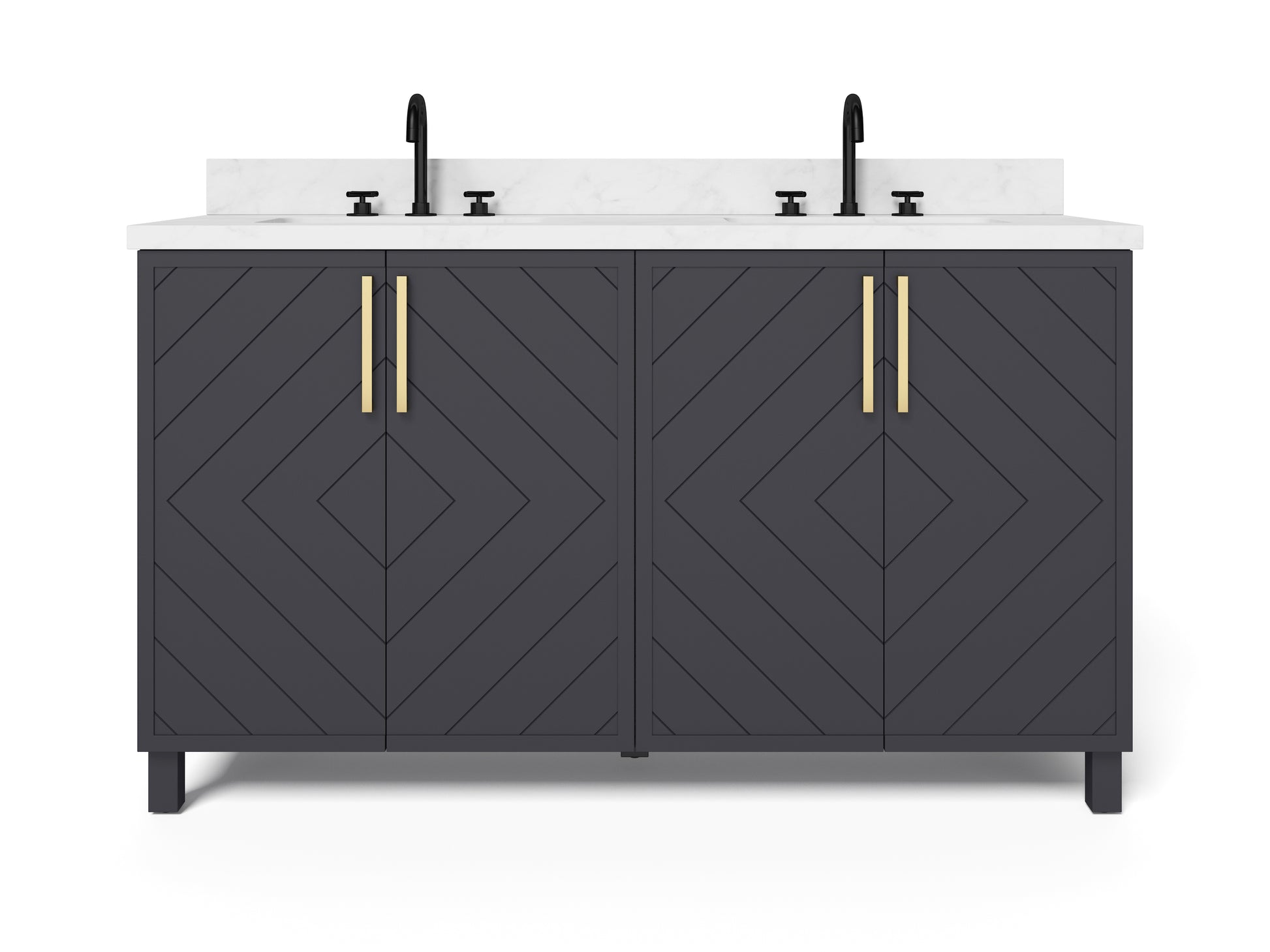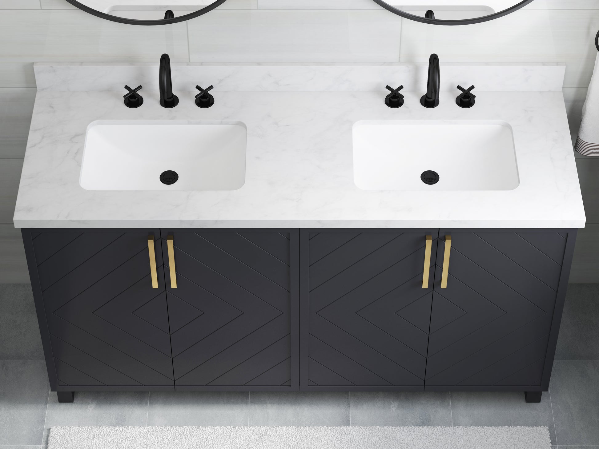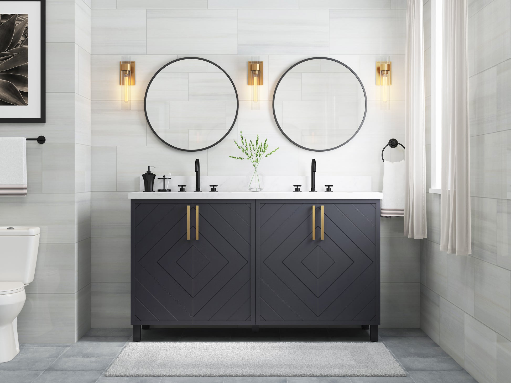 The Roundstone Collection features a traditional design enhanced by a premium deep midnight blue finish. This 60-inch vanity showcases its quality and style with solid frame, brushed gold hardware, and soft-close hinges. A diagonal scoring design in the cabinet doors creates a gorgeous chevron pattern. The vanity includes an engineered white stone top with light grey veining and two white vitreous china rectangular undermount sinks.