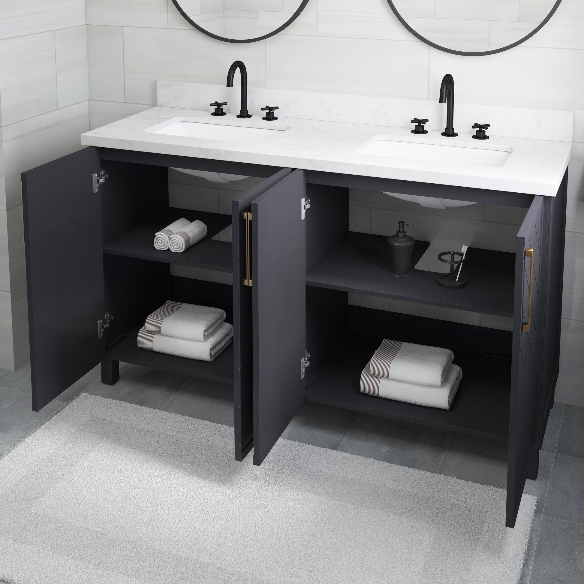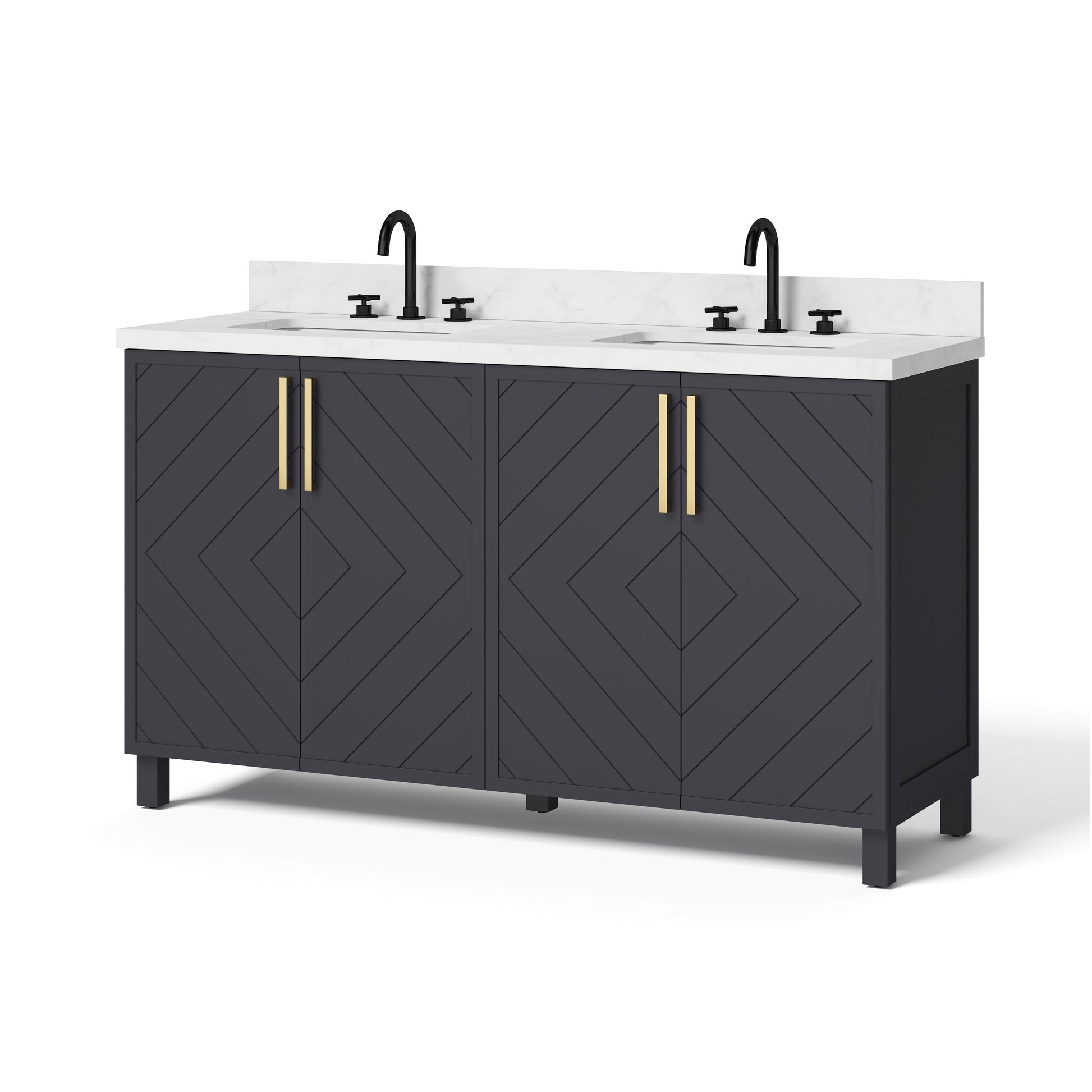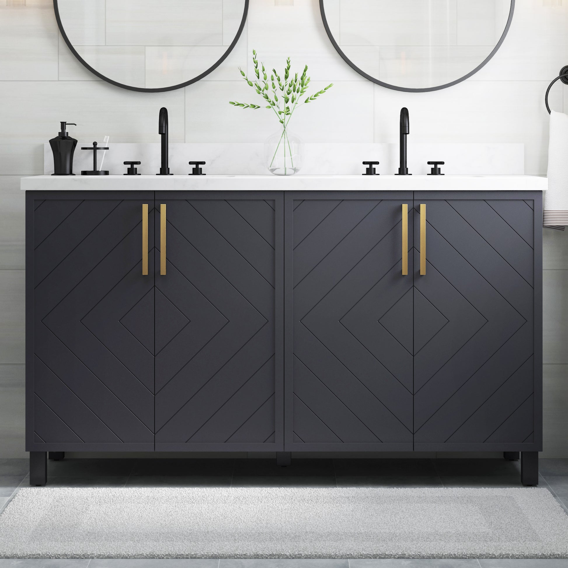 The Roundstone Collection features a traditional design enhanced by a premium deep midnight blue finish. This 60-inch vanity showcases its quality and style with solid frame, brushed gold hardware, and soft-close hinges. A diagonal scoring design in the cabinet doors creates a gorgeous chevron pattern. The vanity includes an engineered white stone top with light grey veining and two white vitreous china rectangular undermount sinks.