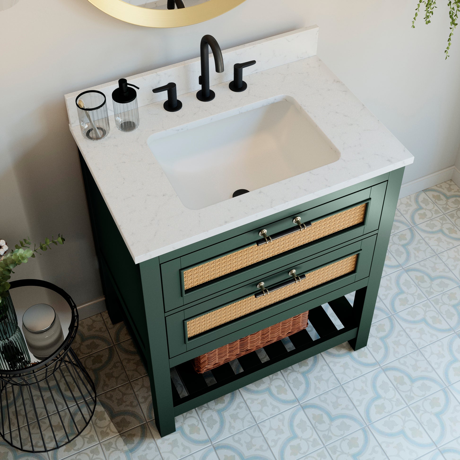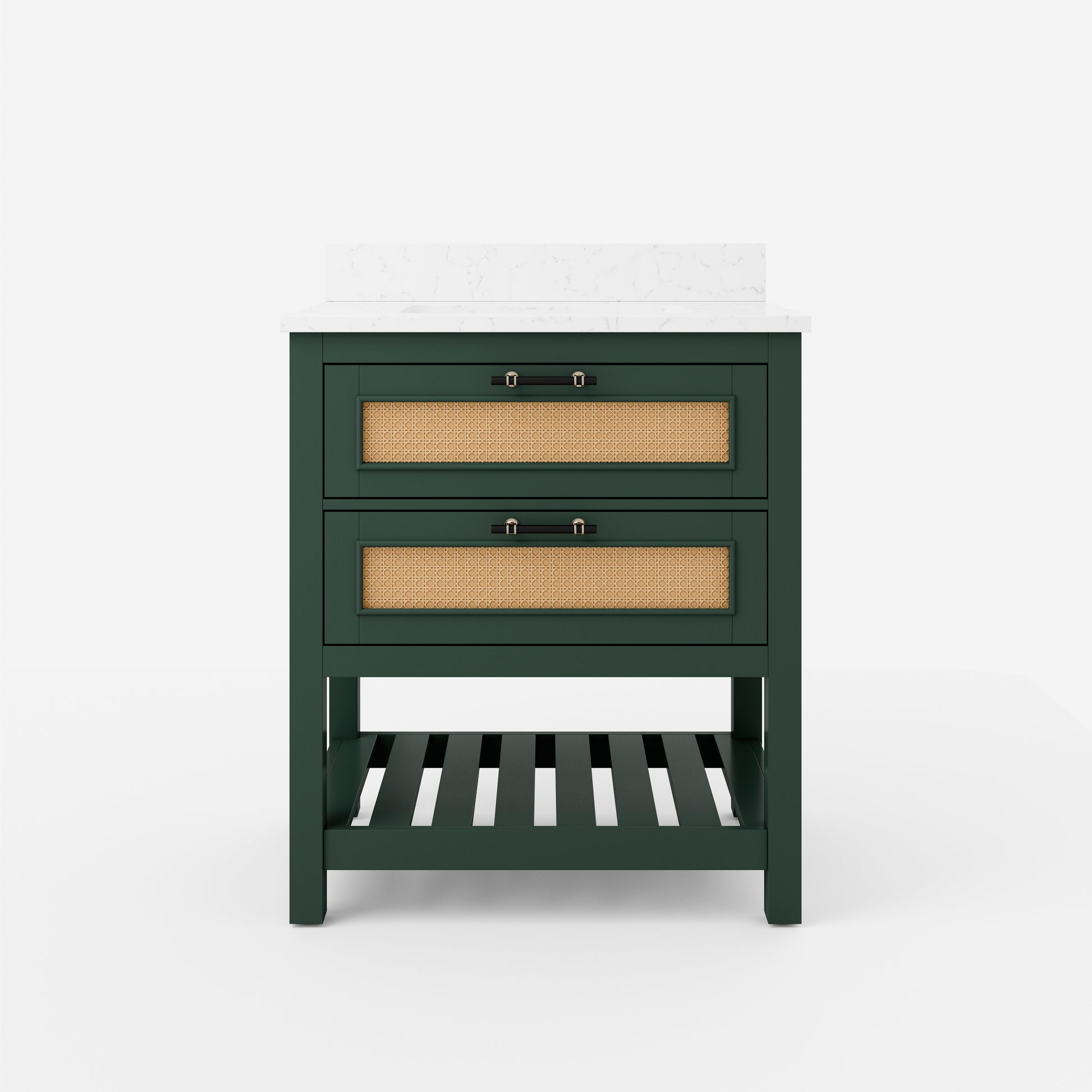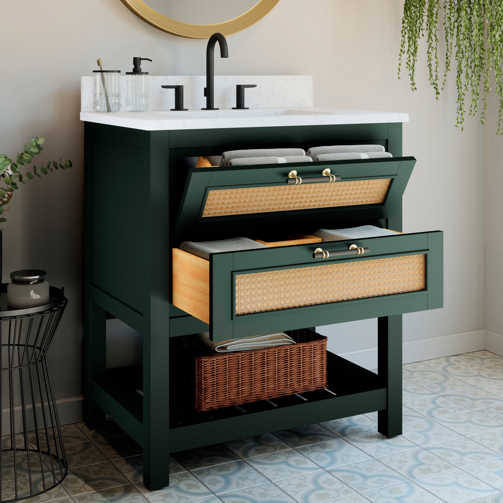 This 30-inch vanity features a unique design, enhanced by a sophisticated dark green finish with cane drawer front accents. The vanity showcases its quality and style with its solid wood frame, elegant black and gold hardware, and soft-close glides. The vanity offers a spacious full drawer and one top tilt-out drawer with a convenient open bottom shelf. The vanity includes a grey-marbled white quartz top and a white vitreous china rectangular undermount sink.