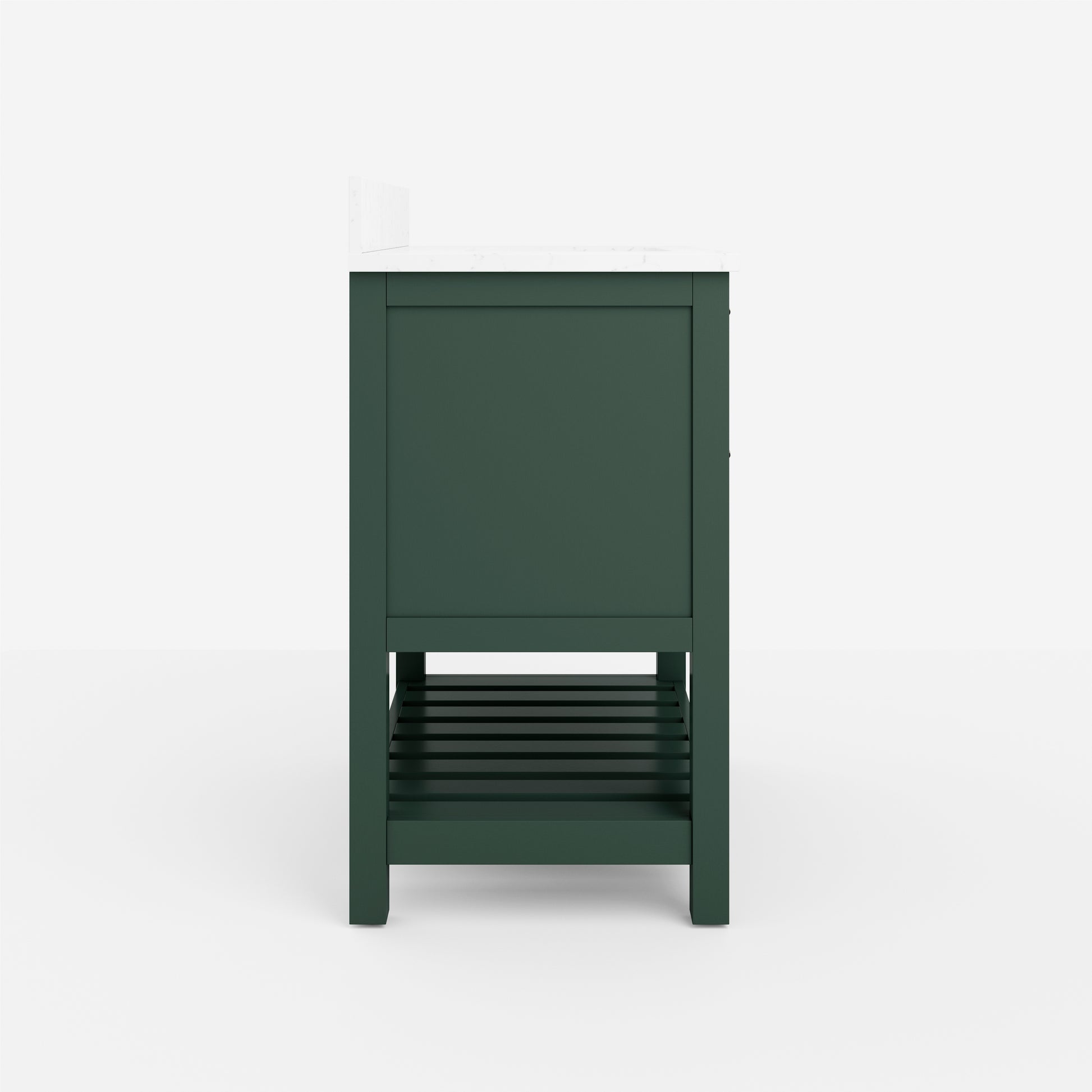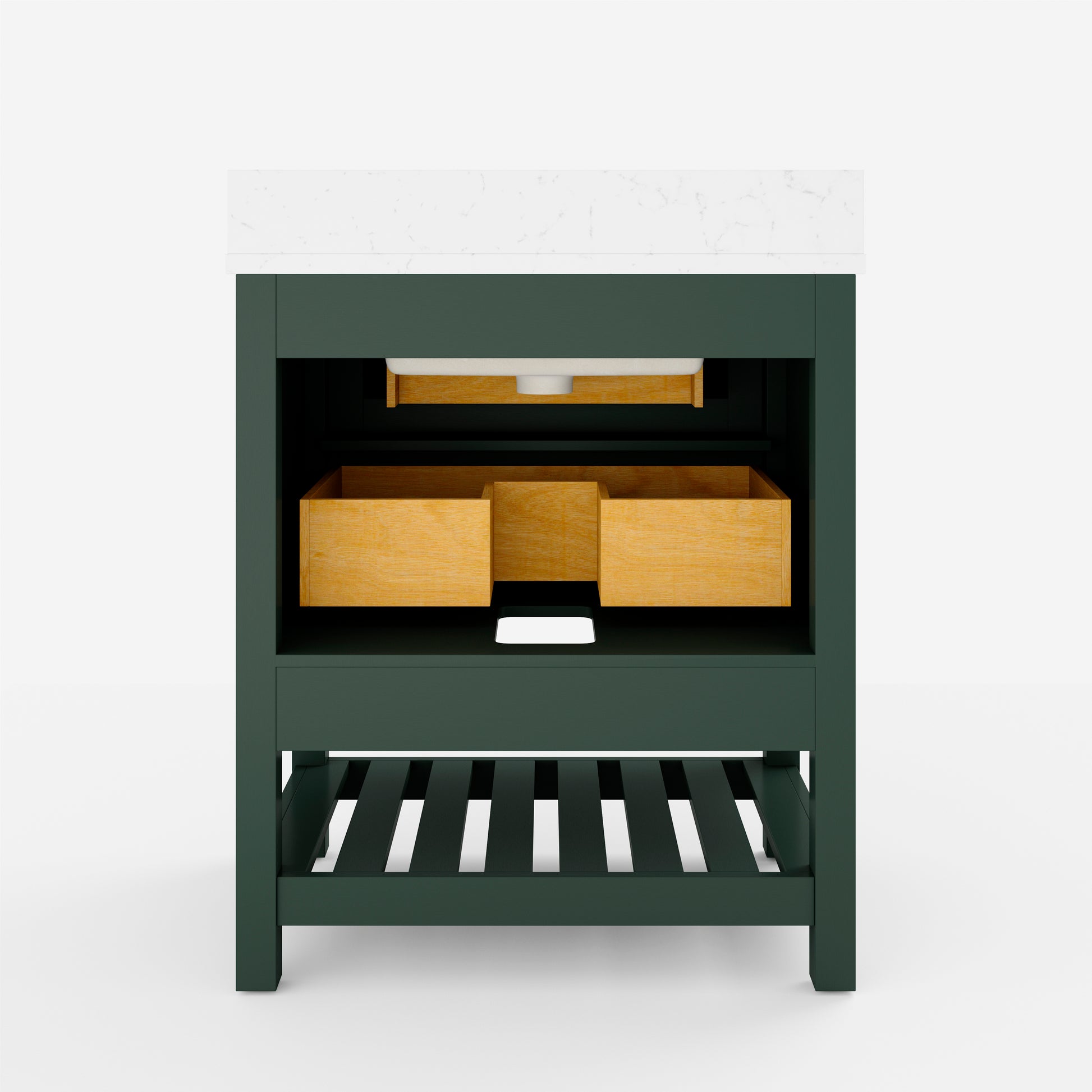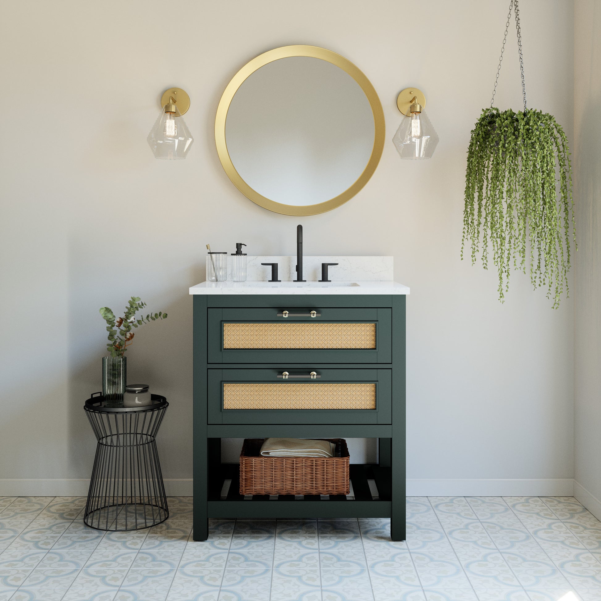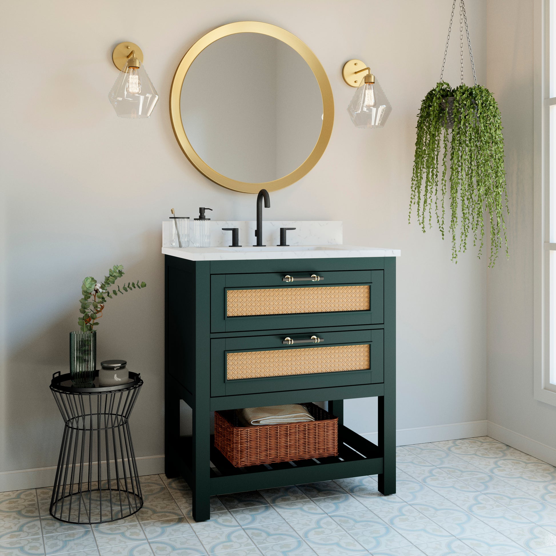 This 30-inch vanity features a unique design, enhanced by a sophisticated dark green finish with cane drawer front accents. The vanity showcases its quality and style with its solid wood frame, elegant black and gold hardware, and soft-close glides. The vanity offers a spacious full drawer and one top tilt-out drawer with a convenient open bottom shelf. The vanity includes a grey-marbled white quartz top and a white vitreous china rectangular undermount sink.
